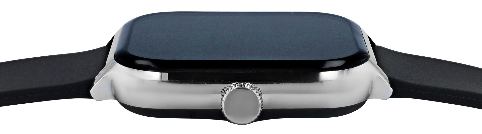 Het royale 1,78-inch display biedt uitstekende leesbaarheid. De kast (47 x 39 x 12,5 mm) is verkrijgbaar in elegant zwart of klassiek zilver. De moderne, zwarte siliconen band met snelsluiting(bandbreedte 20 mm) kan snel worden verwisseld en is zeer comfortabel om te dragen.