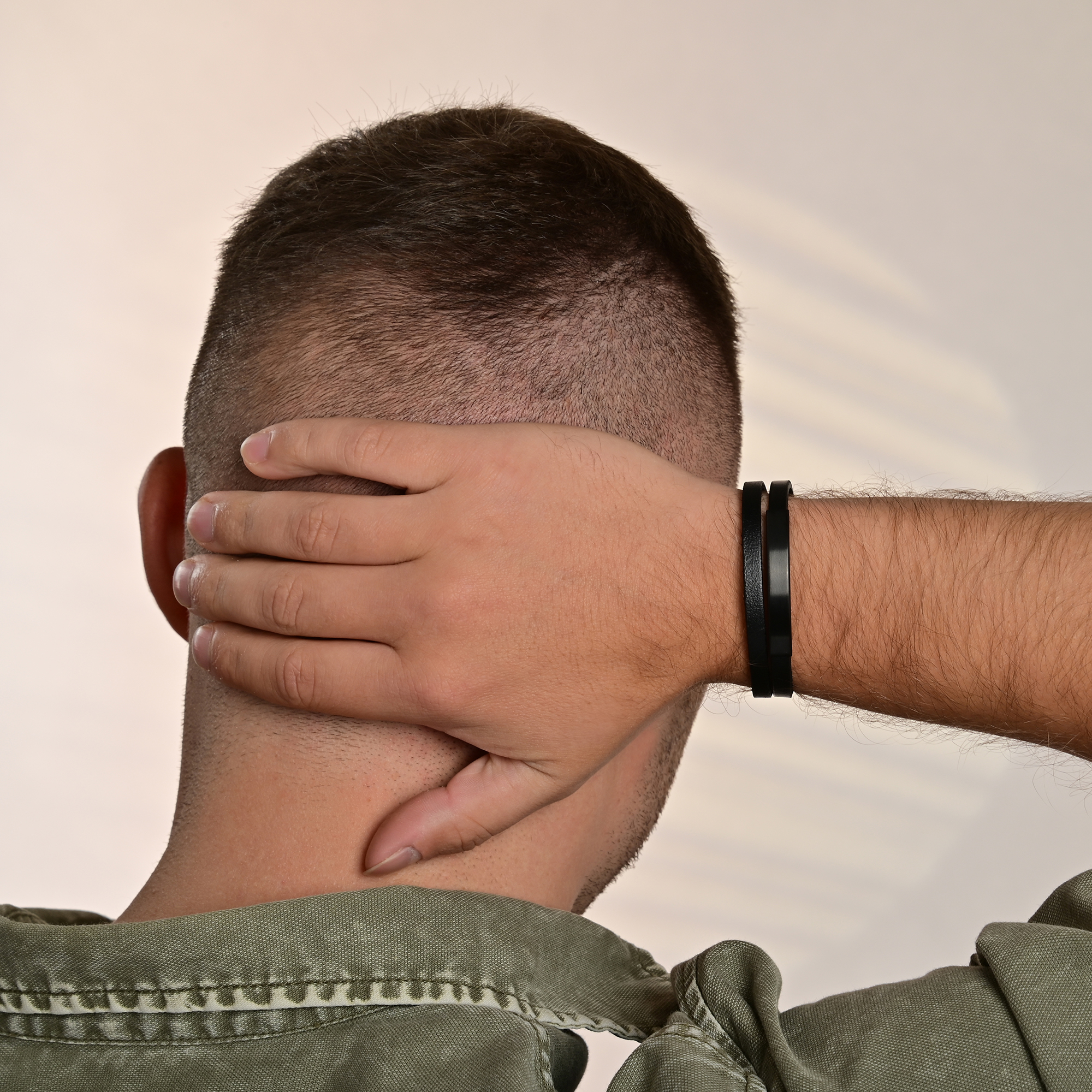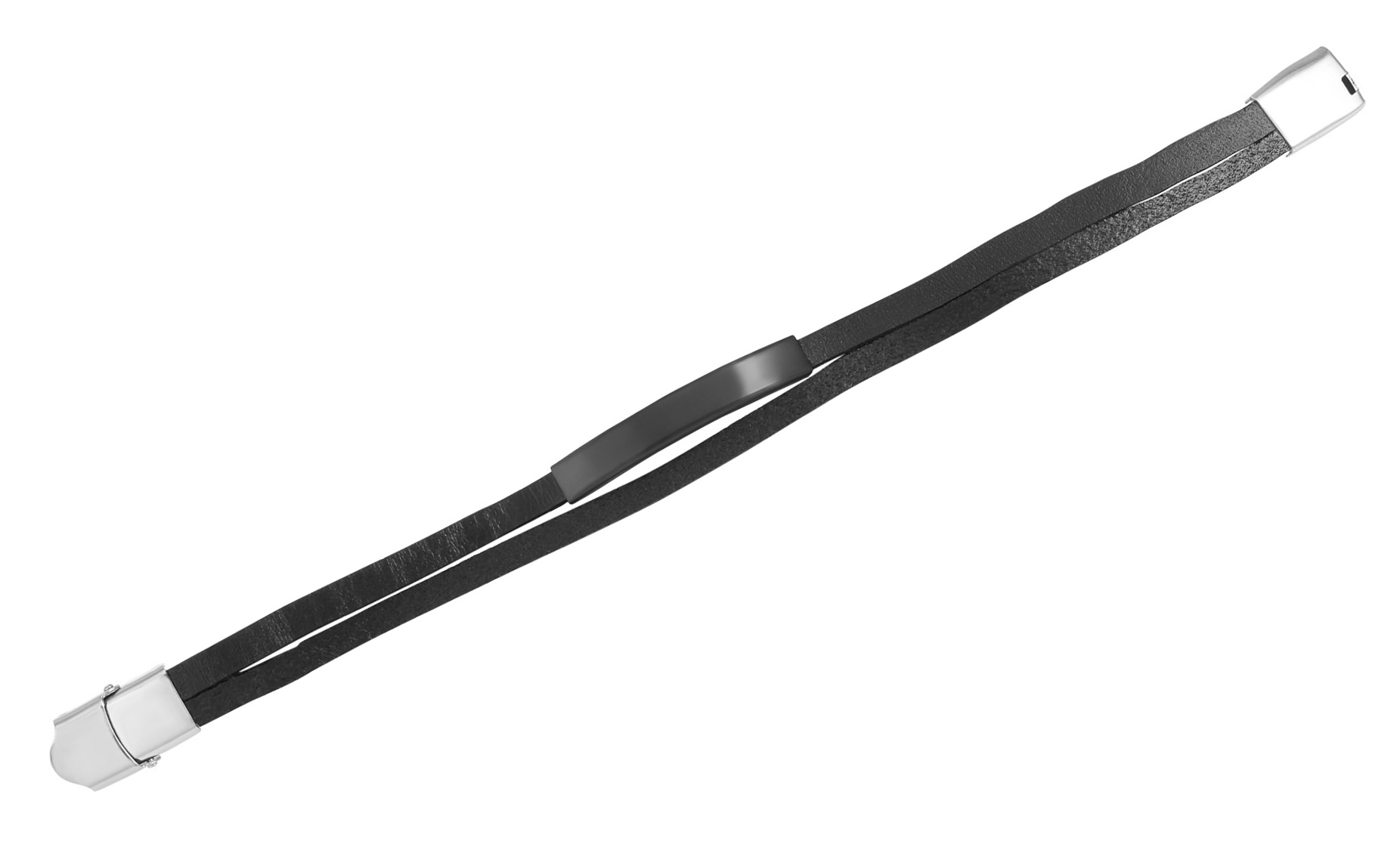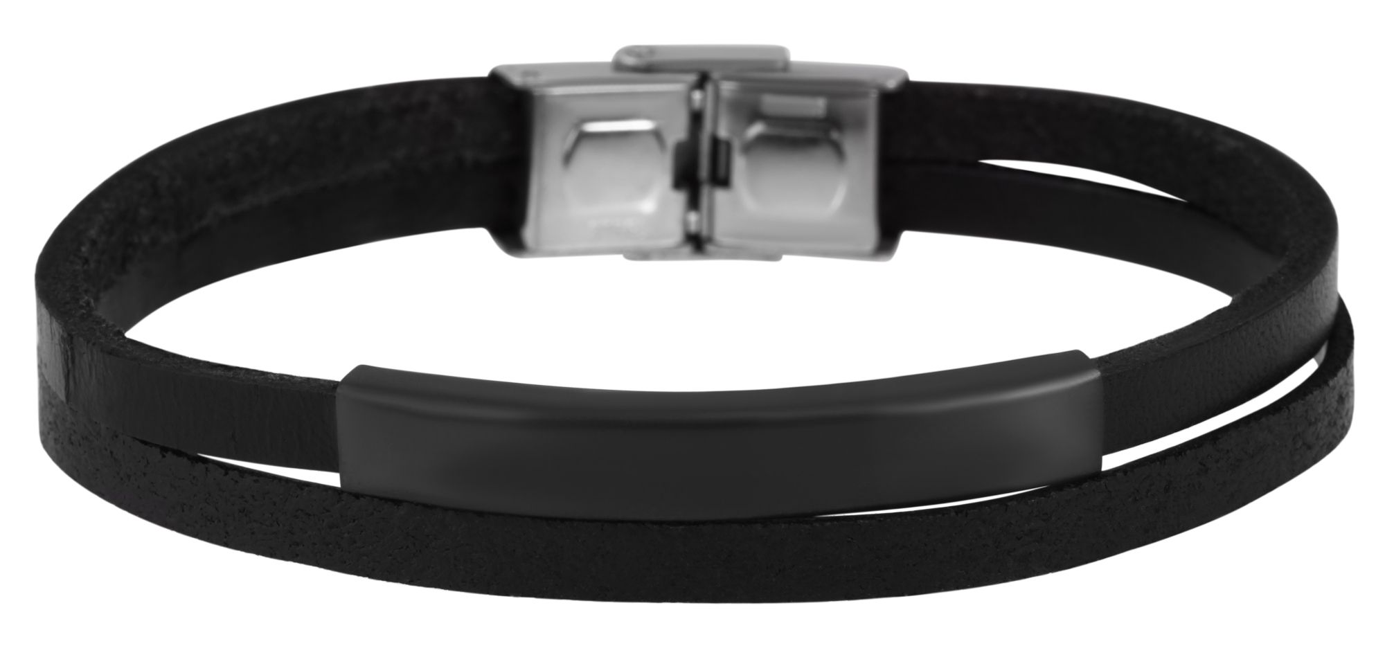 De zwarte sieradenarmband van het merk Akzent is gemaakt van twee platte banden van echt leer. Aan een van de twee leren banden is een eenvoudig zwart roestvrijstalen element bevestigd, dat een matte afwerking heeft en ideaal is om te graveren. De modieuze armband kan worden geopend en gesloten met een zilverkleurige haaksluiting, die ook van roestvrij staal is gemaakt. De afmetingen resulteren in een totale lengte van 21 cm, een breedte van 1,2 cm en een hoogte van 5 mm. Een gepersonaliseerd sieraad is een geweldig cadeau.