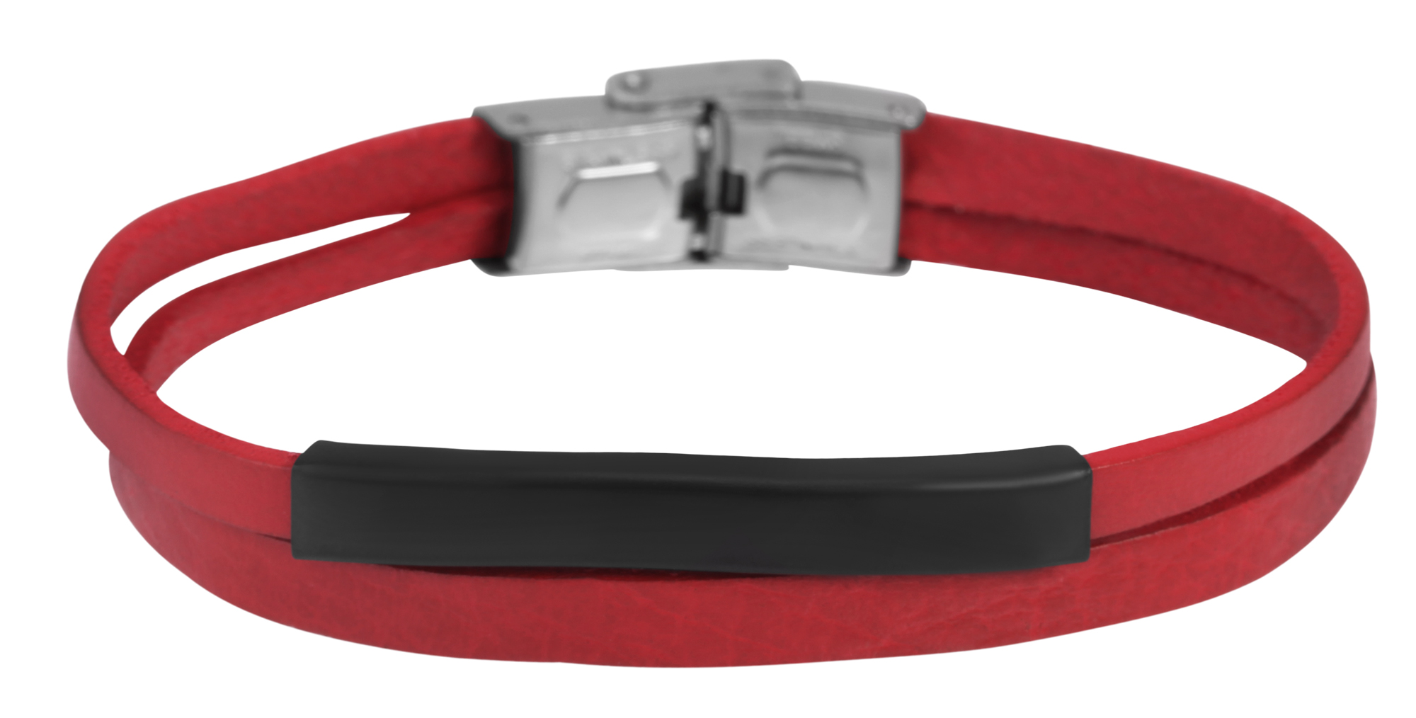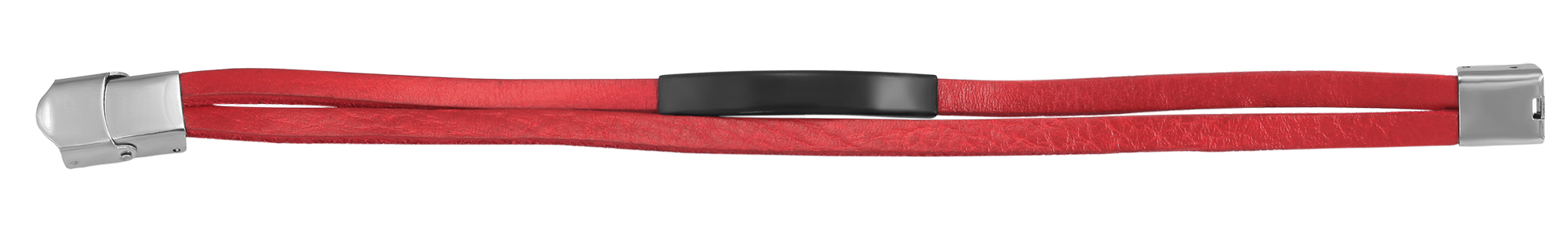 De rode Akzent sieradenarmband is gemaakt van twee platte banden van echt leer. Aan een van de twee leren banden is een eenvoudig zwart roestvrijstalen element bevestigd, dat een matte afwerking heeft en ideaal is om te graveren. De modieuze armband kan worden geopend en gesloten met een zilverkleurige haaksluiting, die ook van roestvrij staal is gemaakt. De afmetingen resulteren in een totale lengte van 21 cm, een breedte van 1,2 cm en een hoogte van 5 mm. Een gepersonaliseerd sieraad is een geweldig cadeau.