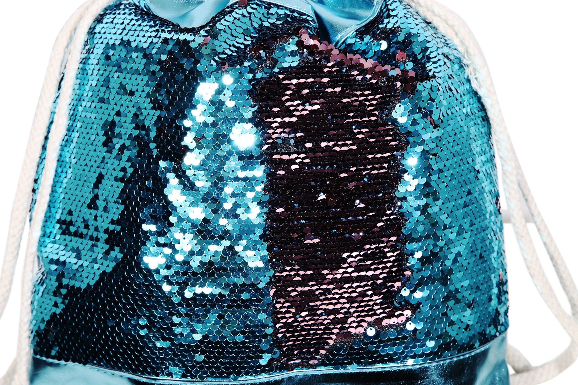 De trendy sporttas is gemaakt van imitatieleer, is lichtblauw en heeft een modieuze metallic look. De tas kan gemakkelijk worden geopend en gesloten met twee gevlochten koorden door er simpelweg aan te trekken. Aan de voorkant zit een 22 cm lang inzetstuk met pailletten, dat kan worden omgedraaid van lichtblauw naar roze. De combinatie van de pailletten en de metallic look maken van de rugzak een absolute blikvanger. De afmetingen van het item zijn: lengte 40 cm, breedte 32 cm en hoogte 3 mm.