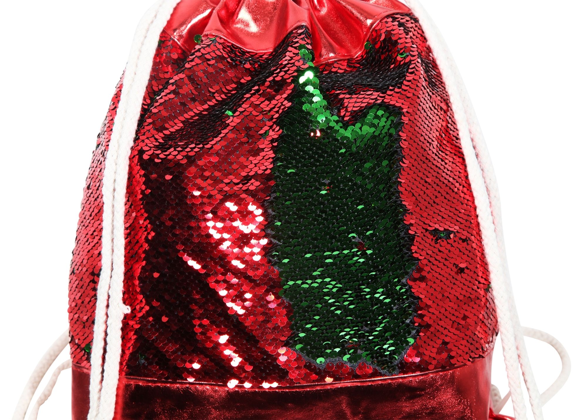 De trendy sporttas is gemaakt van imitatieleer, is rood en heeft een modieuze metallic look. De tas kan gemakkelijk worden geopend en gesloten met twee gevlochten koorden door er simpelweg aan te trekken. Er zit een 22 cm lang inzetstuk met pailletten op de voorkant, dat omgedraaid kan worden van rood naar groen. De combinatie van de pailletten en de metallic look maken van de rugzak een absolute blikvanger. De afmetingen van het item zijn: lengte 40 cm, breedte 32 cm en hoogte 3 mm.