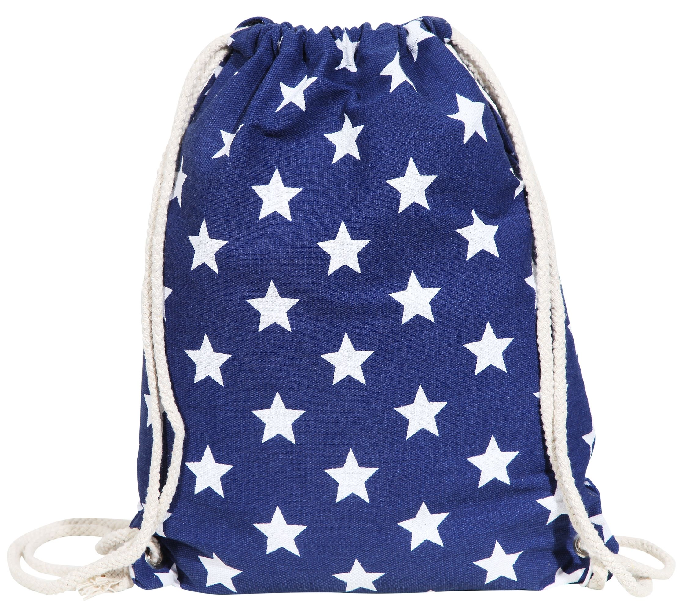 De trendy sporttas is gemaakt van textiel en kan eenvoudig worden geopend en gesloten met twee gevlochten koorden door er simpelweg aan te trekken. De slijtvaste tas biedt veel opbergruimte. De bedrukte sterren op beide zijden van het materiaal maken de rugzak tot een echte blikvanger. De afmetingen van het artikel zijn: lengte 41 cm, breedte 32 cm en hoogte 3 mm. De modieuze gymtas is blauw en versierd met witte sterren.