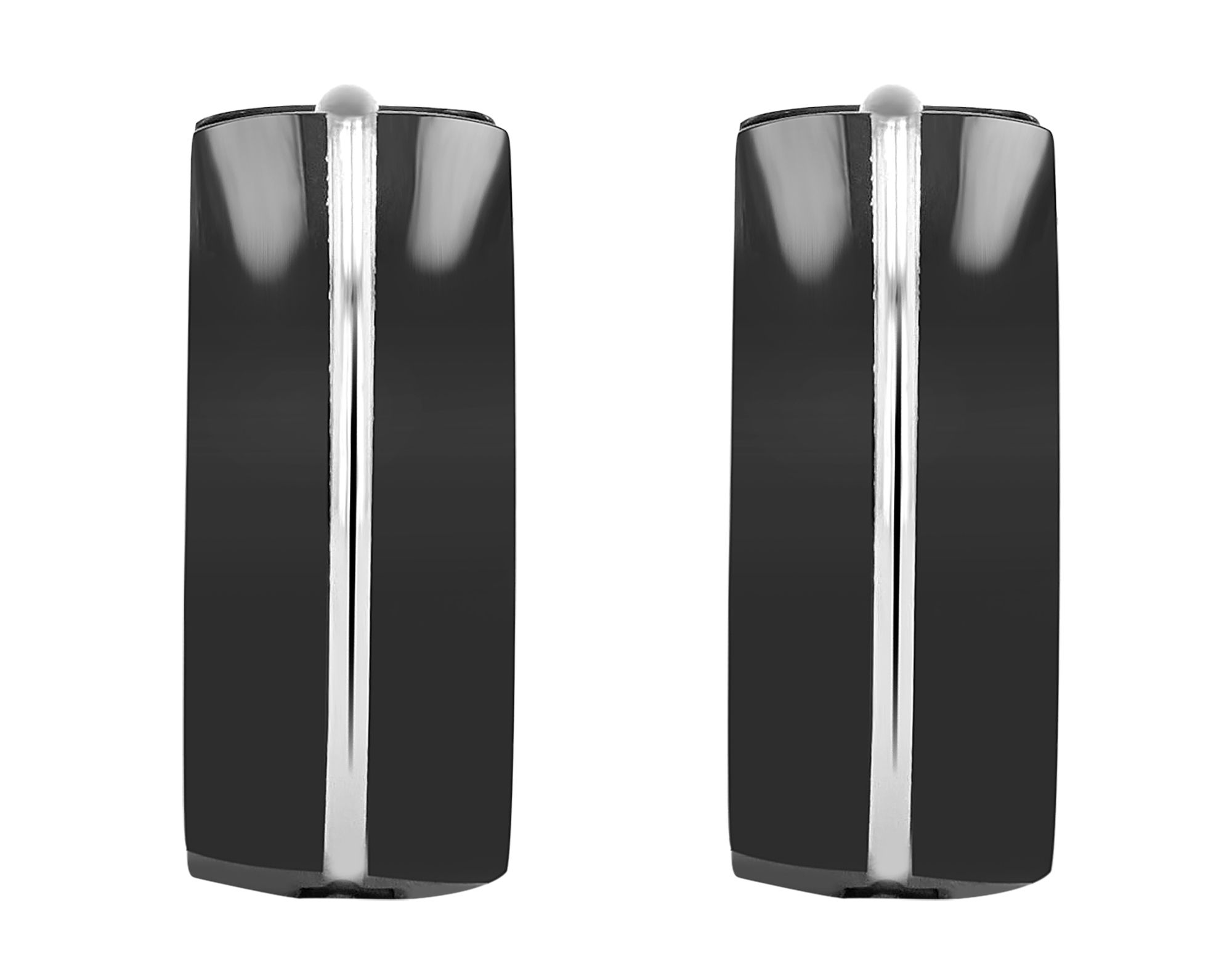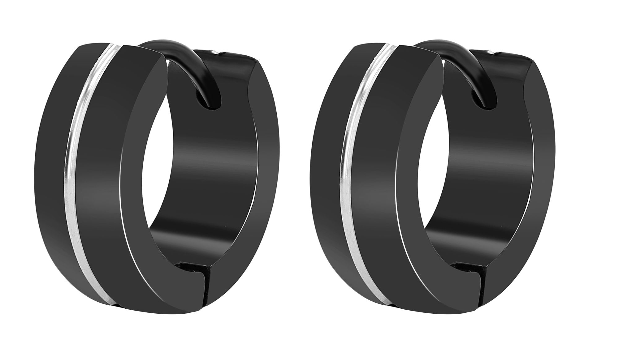 De grootte van de oorbellen, met een binnendiameter van 9 mm en een buitendiameter van 13 mm, een breedte van 5 mm en een dikte van 2 mm, onderstreept harmonieus het tweekleurige ontwerp: een 1 mm brede, zilverkleurige middenstrook wordt omlijst door twee 2 mm brede, zwarte oorbellen.
