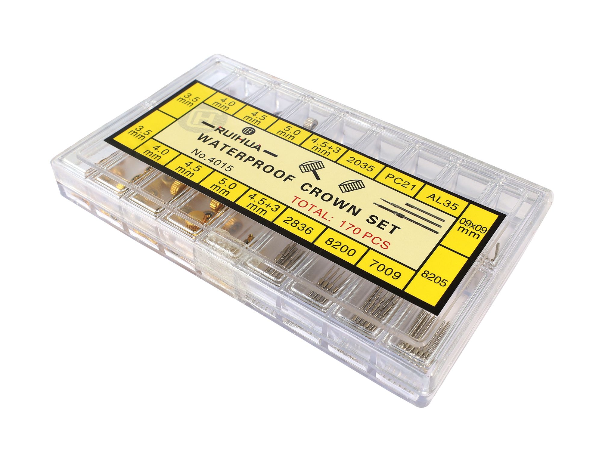 Het assortiment, bestaande uit horlogekronen, opwindassen en verlengstukken voor opwindassen, bevat in totaal 170 stuks in de set. De kronen hebben een diameter van 3,5 mm - 5 mm en zijn verkrijgbaar in zilver- en goudkleur. De draden van de kronen en ook de opwindschachten/verlengstukken hebben allemaal een diameter van 0,9 mm zodat alles met elkaar gecombineerd kan worden. De opwindassen hebben allemaal een standaardlengte van 16 - 23 mm en het opwindasverlengstuk van 11,5 mm. Ze zijn geschikt voor uurwerken met de referenties 2035, PC21 en AL35, die in combinatie met de horlogekronen een waterbestendige reparatie mogelijk maken.