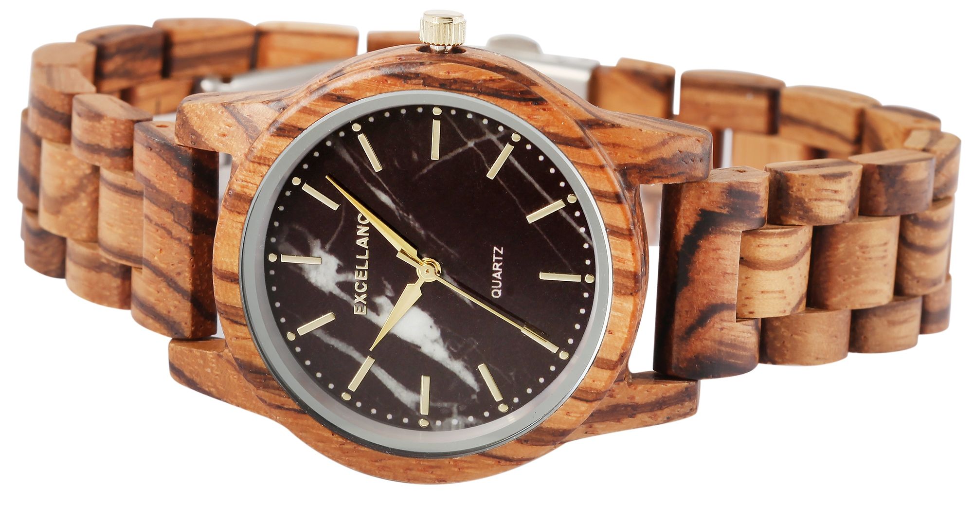 Het analoge polshorloge met 3 wijzers van het merk Excellanc heeft een hoogwaardig kwartsuurwerk. De zebrahouten band is 18 mm breed bij de lug en kan worden geopend en gesloten met een zilverkleurige roestvrijstalen vouwsluiting. De totale lengte van het horloge is 23 cm, maar kan naar wens worden ingekort dankzij de afneembare elementen. De kast, ook gemaakt van zebrahout, met een houten achterkant in dezelfde kleur en mineraalglas, heeft een diameter van 38 mm en een kasthoogte van 10 mm. Een visueel hoogtepunt is het mineraalglas met een zilverkleurige spiegelrand aan de buitenrand. Samen met de kleurgecoördineerde kroon geeft dit het horloge een elegante uitstraling. De wijzerplaat bestaat uit een marmeren schijf, een indexverdeling met duidelijke lijnen en klassieke wijzers. Deze zijn qua kleur op elkaar afgestemd en ronden het geheel harmonieus af. Elk houten horloge is uniek en individueel in zijn samenstelling. Het is een statement van duurzaam denken en tegelijkertijd een modieus accessoire. De lichtheid van de natuurlijke grondstof zorgt ervoor dat het comfortabel is om te dragen, waardoor dit tijdloze horlogemodel onmisbaar is.