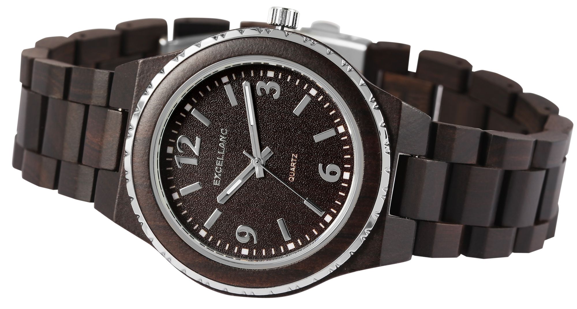 Het analoge polshorloge met 3 wijzers van het merk Excellanc heeft een hoogwaardig kwartsuurwerk. De houten band is 22 mm breed bij de lug en kan worden geopend en gesloten met een zilverkleurige roestvrijstalen vouwsluiting. De totale lengte van het horloge is 24,5 cm, maar kan naar wens worden ingekort dankzij de afneembare elementen. De kast, die ook van hout is, met een houten achterkant in dezelfde kleur en mineraalglas, heeft een diameter van 43 mm en een kasthoogte van 12 mm. Een visueel hoogtepunt is de opvallende lunette en het mineraalglas met een spiegelrand aan de buitenste rand. Samen met de kleurgecoördineerde kroon geeft dit het horloge een elegante uitstraling. De wijzerplaat is ook gemaakt van hout en rondt de algehele look harmonieus af. Een ander bijzonder kenmerk zijn de met Superluminova gecoate uur- en minutenwijzers, die het mogelijk maken om de tijd zelfs in het donker af te lezen. Elk houten horloge is uniek en individueel in zijn samenstelling. Het is een statement van duurzaam denken en tegelijkertijd een modieus accessoire. De lichtheid van de natuurlijke grondstof zorgt ervoor dat het comfortabel is om te dragen, waardoor dit tijdloze horlogemodel onmisbaar is.