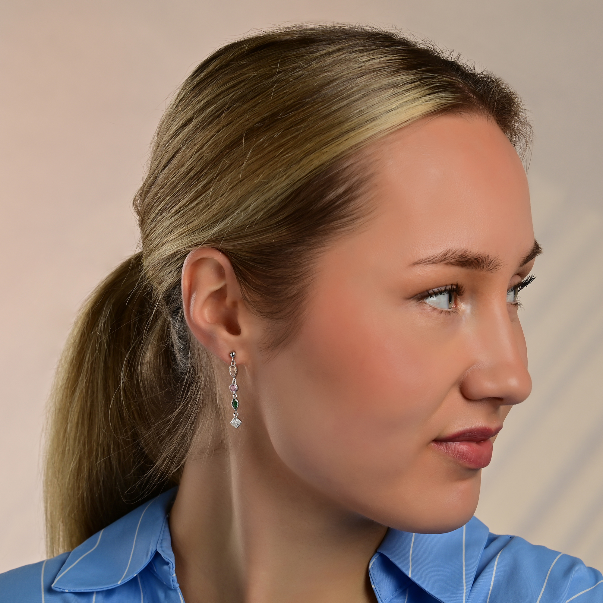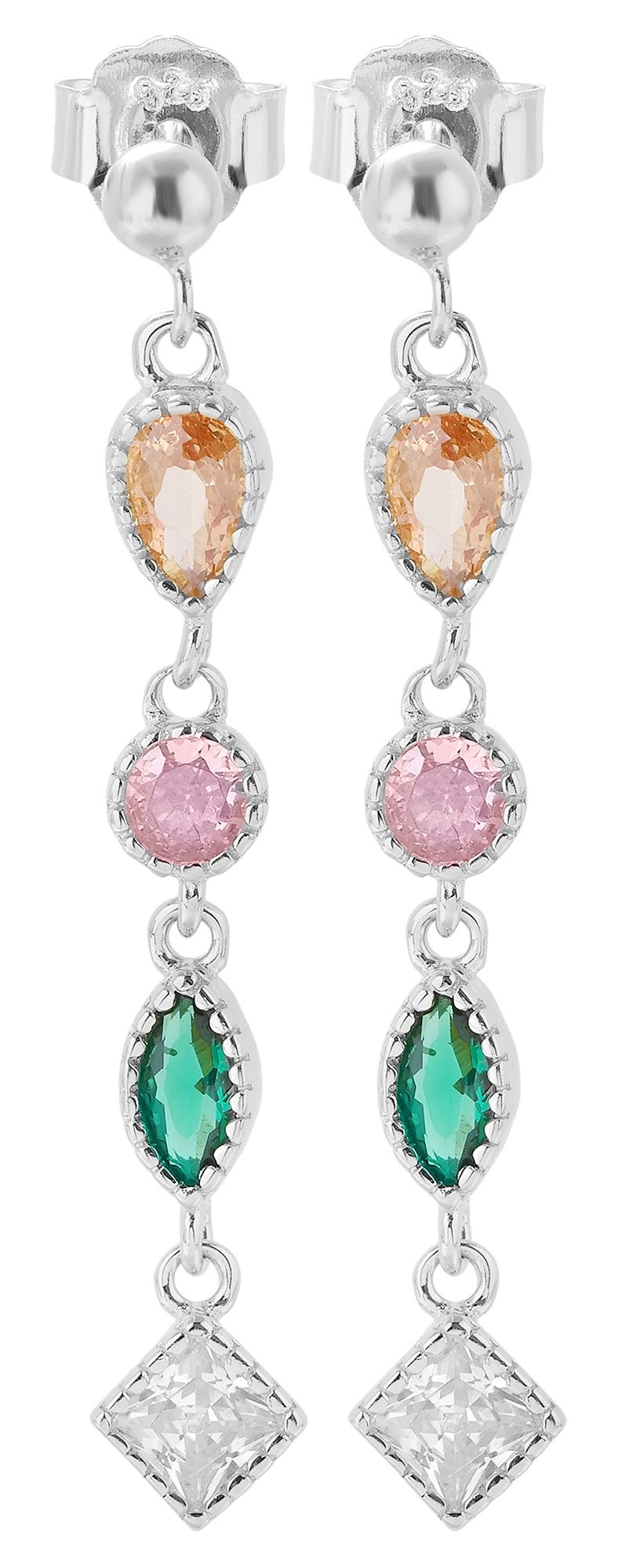 De oorsteker is versierd met een discrete bol van 3 mm. Daaronder zijn de zirkonia steentjes in rijen gerangschikt in verschillende kleuren en vormen. Elk van de vier zirkonia steentjes is individueel beweegbaar en brengt een dynamische lichtheid in het ontwerp met zijn delicate schommeling. De totale lengte van de oorbellen is 3,6 cm.