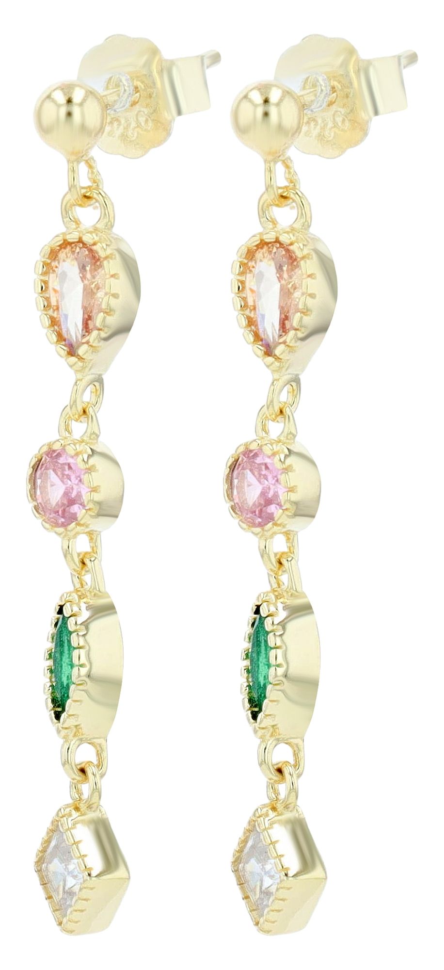 De oorsteker is versierd met een discrete bol van 3 mm. Daaronder zijn de zirkonia steentjes in rijen gerangschikt in verschillende kleuren en vormen. Elk van de vier zirkonia steentjes is individueel beweegbaar en brengt een dynamische lichtheid in het ontwerp met zijn delicate schommeling. De totale lengte van de oorbellen is 3,6 cm.