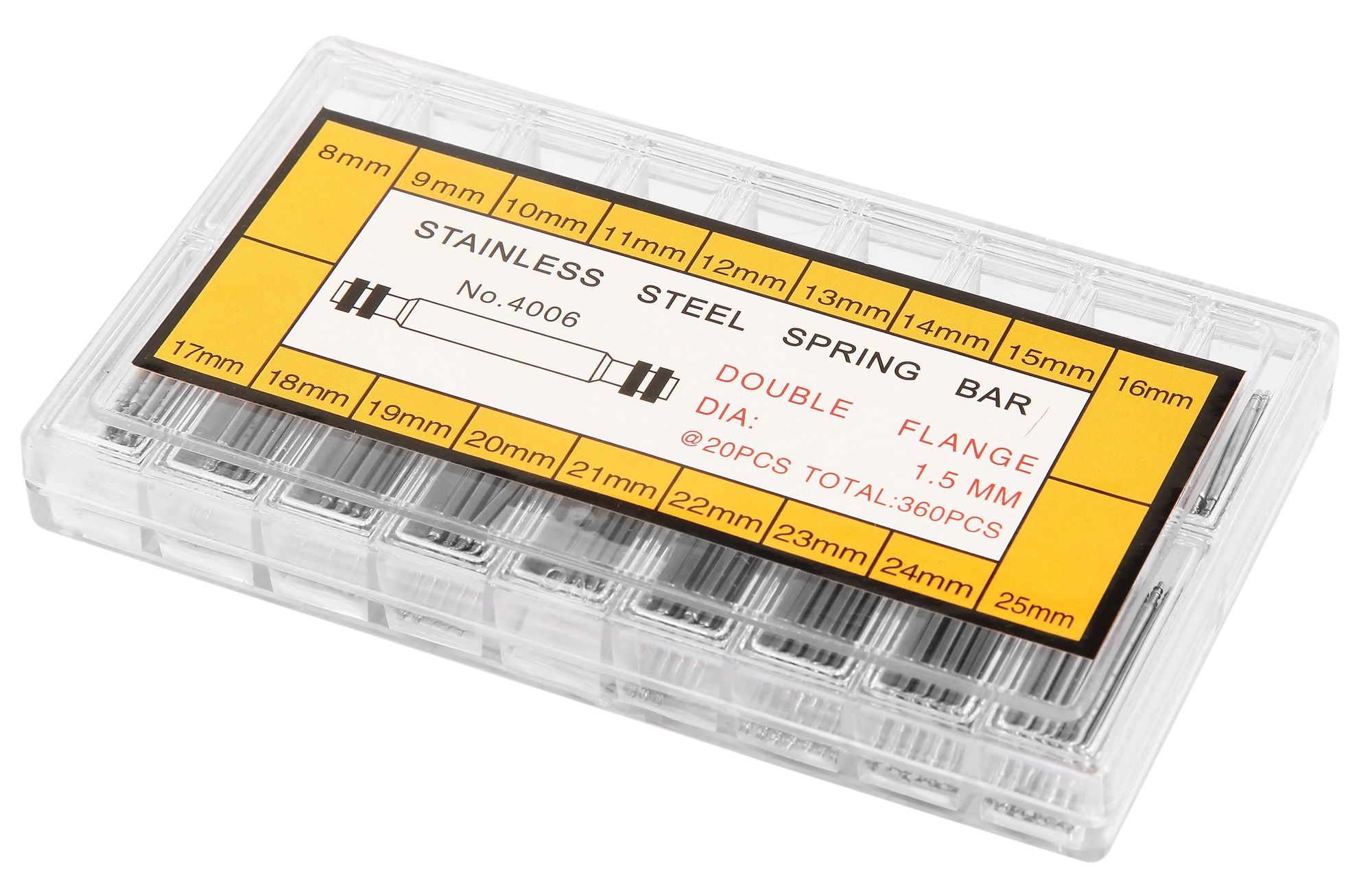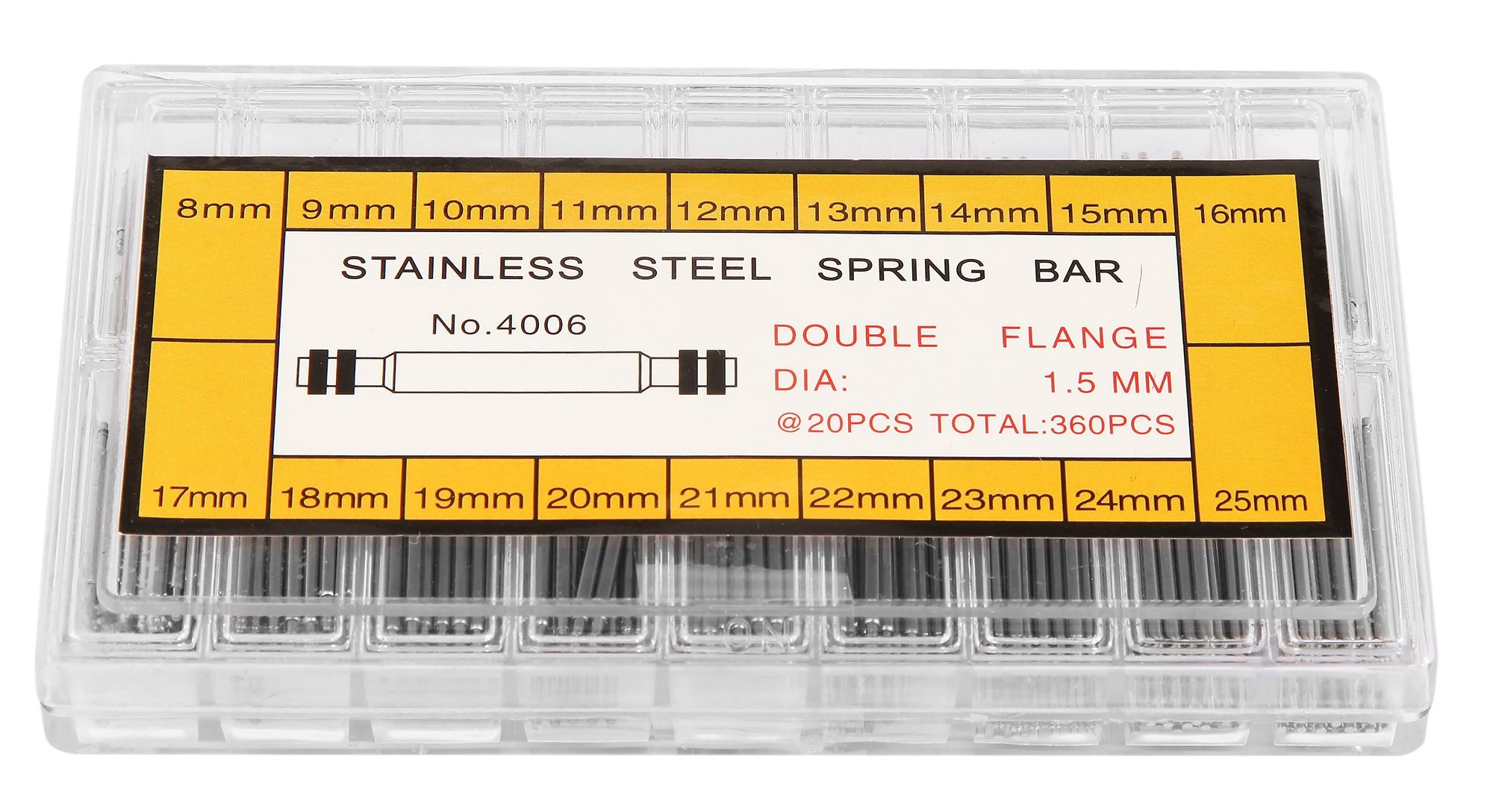 Het assortiment veerstaven bevat 360 veerstaven in 18 verschillende maten. De kleinste veerstaaf is 8 mm lang, de grootste 25 mm. De diameter van de veerstaven is 1,5 mm. Van elke maat zijn er 20. De veerstaafjes zijn geschikt om vervangende horlogebandjes aan horlogekasten te bevestigen. Bijvoorbeeld leren bandjes, metalen bandjes, rubberen bandjes, stoffen bandjes of Milanese bandjes.