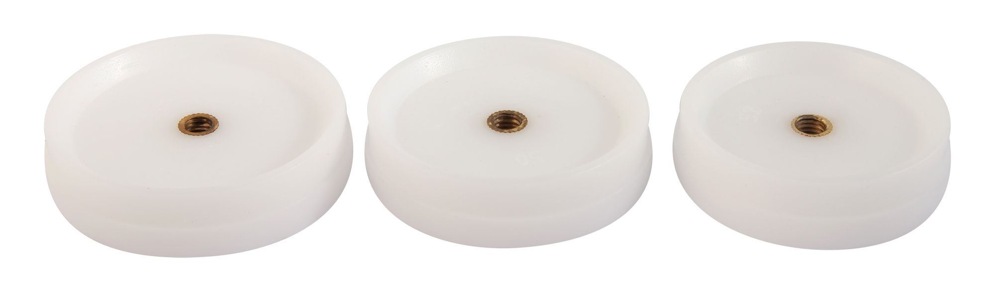 Deze set bevat 3 vervangende kunststof drukstukken in 6 maten, elk te verkrijgen door de voor- of achterkant van de drukstukken te gebruiken.