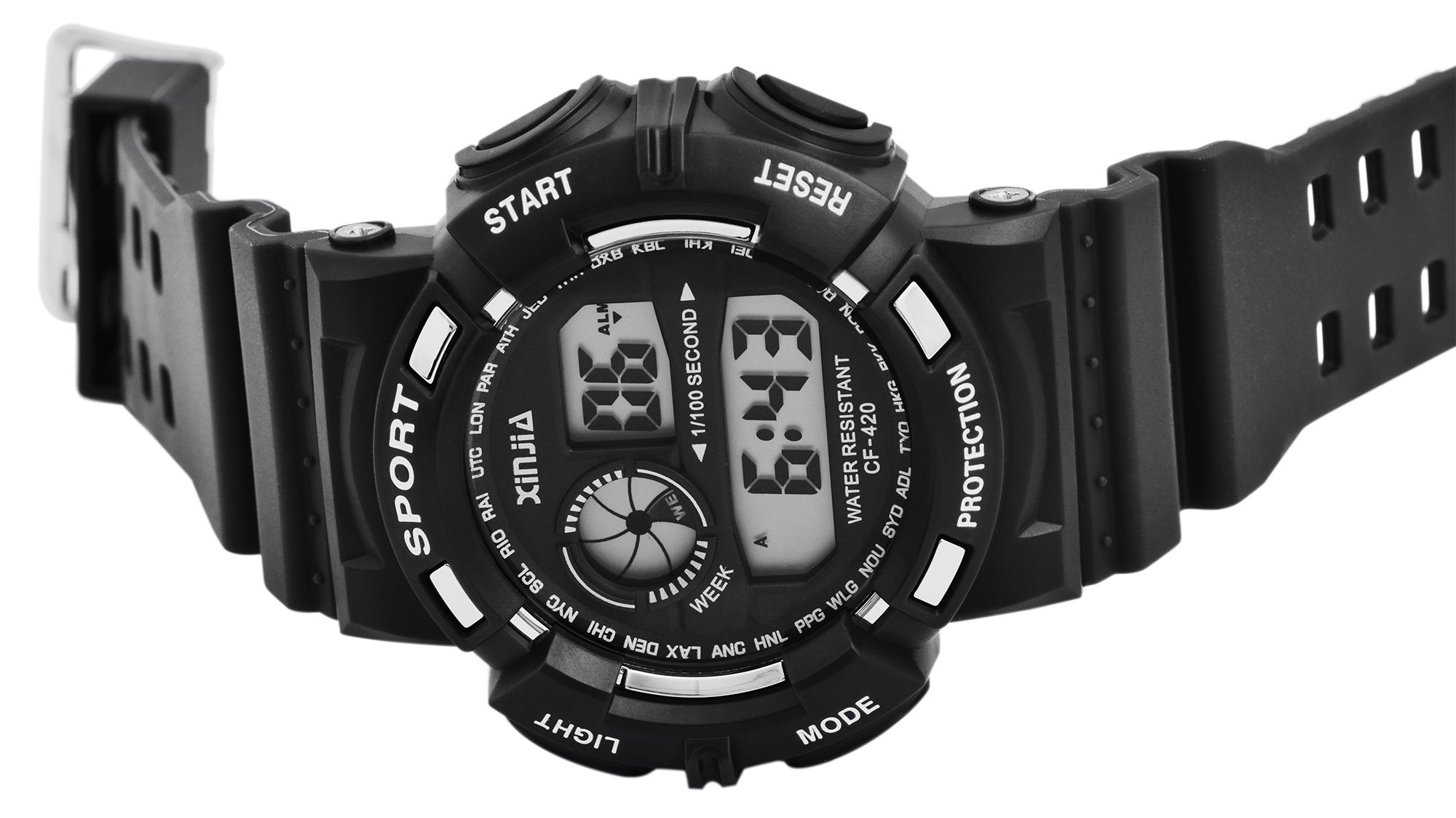 Het digitale herenpolshorloge van het merk Xinjia heeft een digitaal uurwerk van hoge kwaliteit. De siliconen band is 29 mm breed bij de lug en kan worden geopend en gesloten met een zilverkleurige gesp. De totale lengte van het horloge is 25,5 cm. De kunststof kast heeft een diameter van 52 mm en een kasthoogte van 17 mm. Het horloge is bijzonder goed bestand tegen schokken en trillingen. De achterkant van de kast is gemaakt van roestvrij staal en is aan de kast bevestigd met vier roestvrijstalen schroeven. Het horloge is spatwaterdicht. De digitale tijd kan worden ingesteld met vier drukknoppen die gelijkmatig zijn verdeeld over de buitenrand van de kast. De drukknoppen kunnen ook worden gebruikt om alle andere functies in te stellen, zoals de displayverlichting, de stopwatchfunctie en de alarmfunctie. Dankzij de lichtfunctie is de tijd gemakkelijk af te lezen, zelfs in het donker. De wijzerplaat heeft dezelfde kleur als de kast en band en is voorzien van één groot en twee kleinere digitale velden. Deze velden tonen de tijd, datum, dag van de week, seconden, stoptijd en alarmtijd. De weergave in de digitale velden verandert afhankelijk van de ingestelde modus. Het Xinjia digitale horloge is een robuust horloge dat dankzij de vele functies op verschillende manieren kan worden gebruikt. Het is bijvoorbeeld ideaal voor hardlopen, fietsen of wandelen.