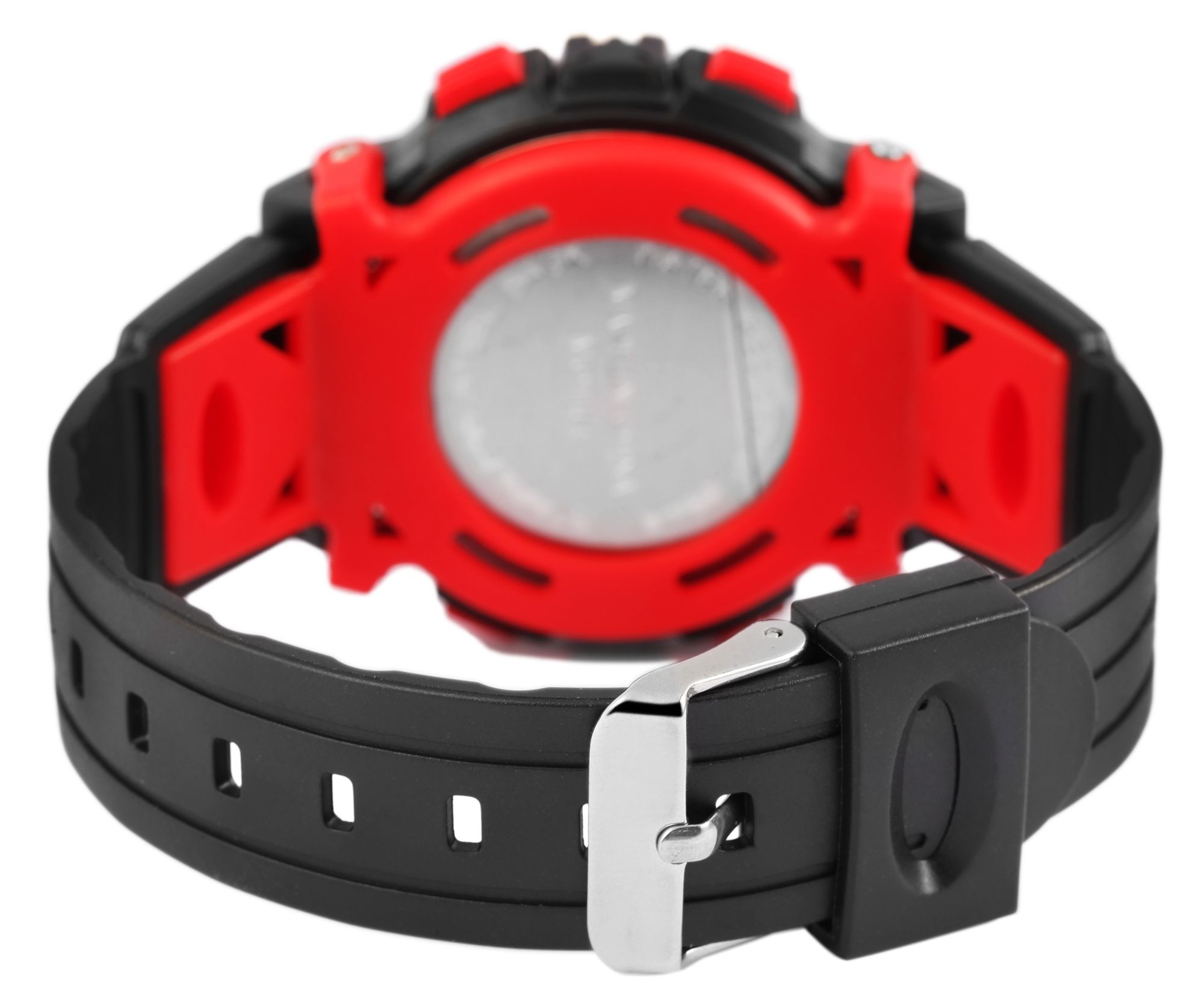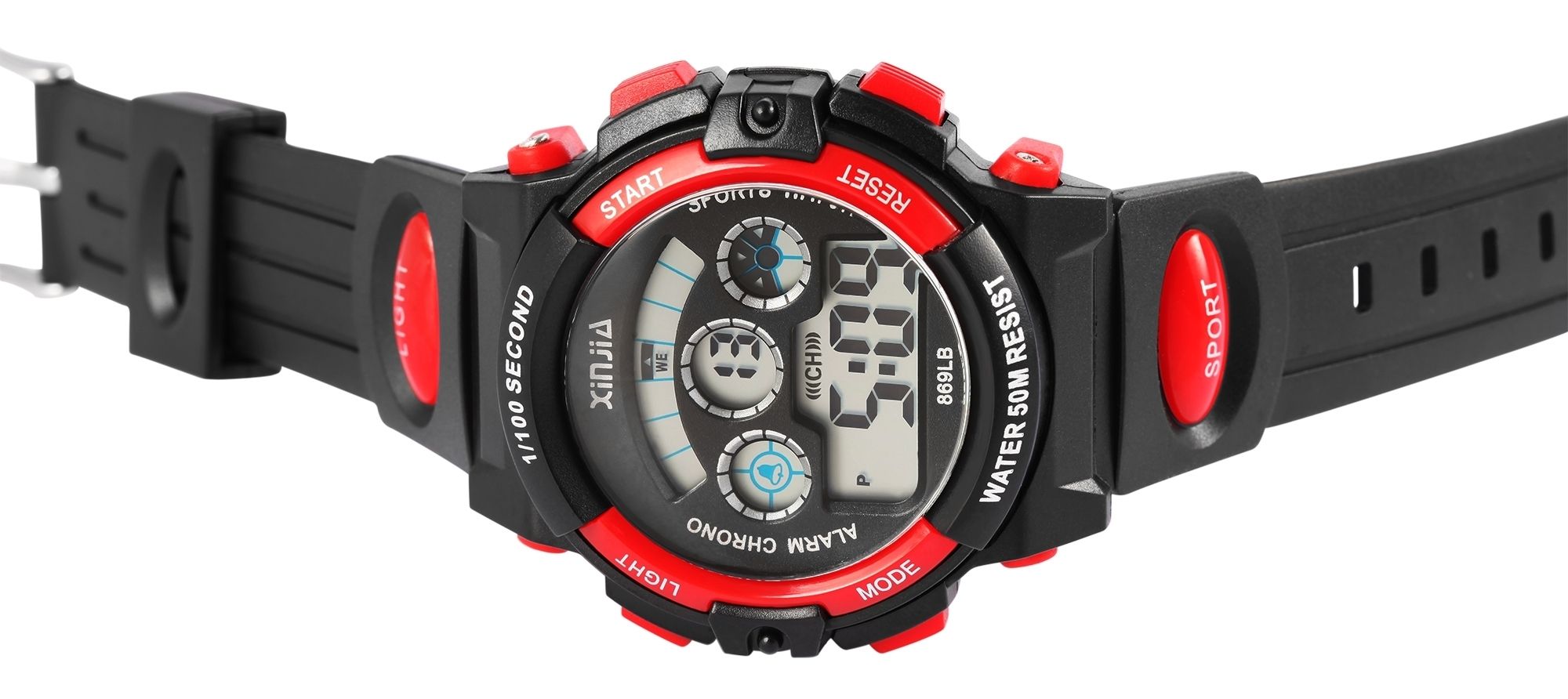Het digitale polshorloge van het merk Xinjia heeft een hoogwaardig kwartsuurwerk. De zwarte siliconen band is 23 mm breed bij de lug en kan worden geopend en gesloten met een zilverkleurige roestvrijstalen gesp. De totale lengte van het horloge is 24,5 cm. De zwart met rode kunststof kast heeft een diameter van 44 mm en een kasthoogte van 17 mm. Hij is bijzonder robuust tegen schokken en trillingen. De achterkant van de kast is gemaakt van roestvrij staal en is aan de kast bevestigd met vier roestvrijstalen schroeven. Het horloge heeft een waterbestendigheid van 5 bar. De digitale tijd kan worden ingesteld met de vier drukknoppen op twee, vier, acht en tien uur. De drukknoppen kunnen ook worden gebruikt om alle andere functies in te stellen, zoals de displayverlichting, de stopwatchfunctie, de timer, de alarmfunctie, een tweede tijdzone en een akoestisch snelheidssignaal. Dankzij de lichtfunctie is de tijd ook in het donker goed af te lezen. Het Xinjia digitale horloge is een sportief en robuust horloge dat dankzij de vele functies op verschillende manieren gebruikt kan worden. Het is bijvoorbeeld ideaal voor hardlopen, fietsen of zwemmen.