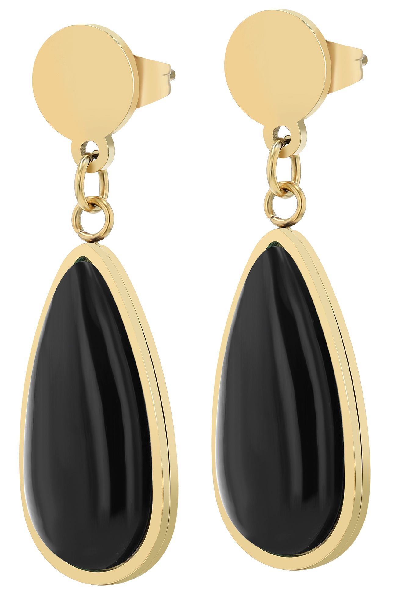 De ketting, die 45 cm lang is, wordt stevig vastgemaakt met een karabijnsluiting. De focus ligt op de druppelvormige hanger die aan de ketting bungelt. Deze hanger is versierd met een zetting van zwarte stenen en meet royaal 32 x 14,5 x 5,5 mm. De bijpassende oorbellen zijn ook ontworpen met druppelvormige elementen en zwarte versieringen. Het bijzondere aan deze oorbellen is hun flexibiliteit, die elegant meebeweegt met elke beweging van de draagster. Met een totale lengte van 35 mm, een breedte van 11 mm en een dikte van 4,5 mm bieden ze harmonieuze proporties. Ze worden vastgezet met een vleugelschroef en een extra oormoer met een siliconen plaatje, die niet alleen stevig vastzit, maar ook comfortabel is om te dragen.