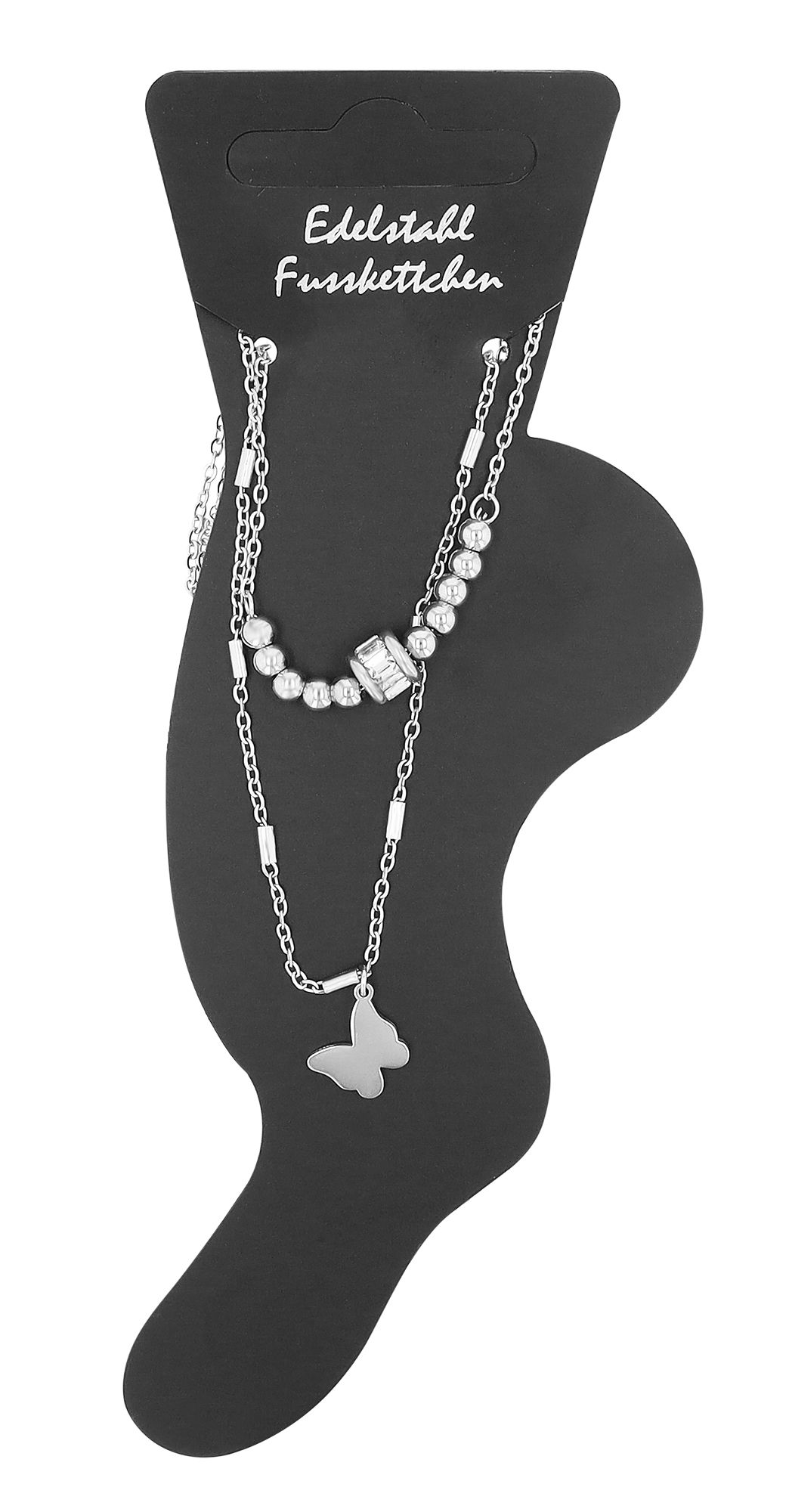 Het middelpunt van deze enkelband is de vlinderhanger met parelmoer. Met zijn afmetingen van 9 x 11 mm is het een opvallend stuk met een glinsterende aanwezigheid. De gepolijste roestvrijstalen kralen die het midden van een van de kettingen sieren, zorgen voor extra schittering. Of het nu gecombineerd wordt met een casual zomeroutfit of een chique avondjurk - het accent enkelbandje rondt de look perfect af en wordt een stralend middelpunt.