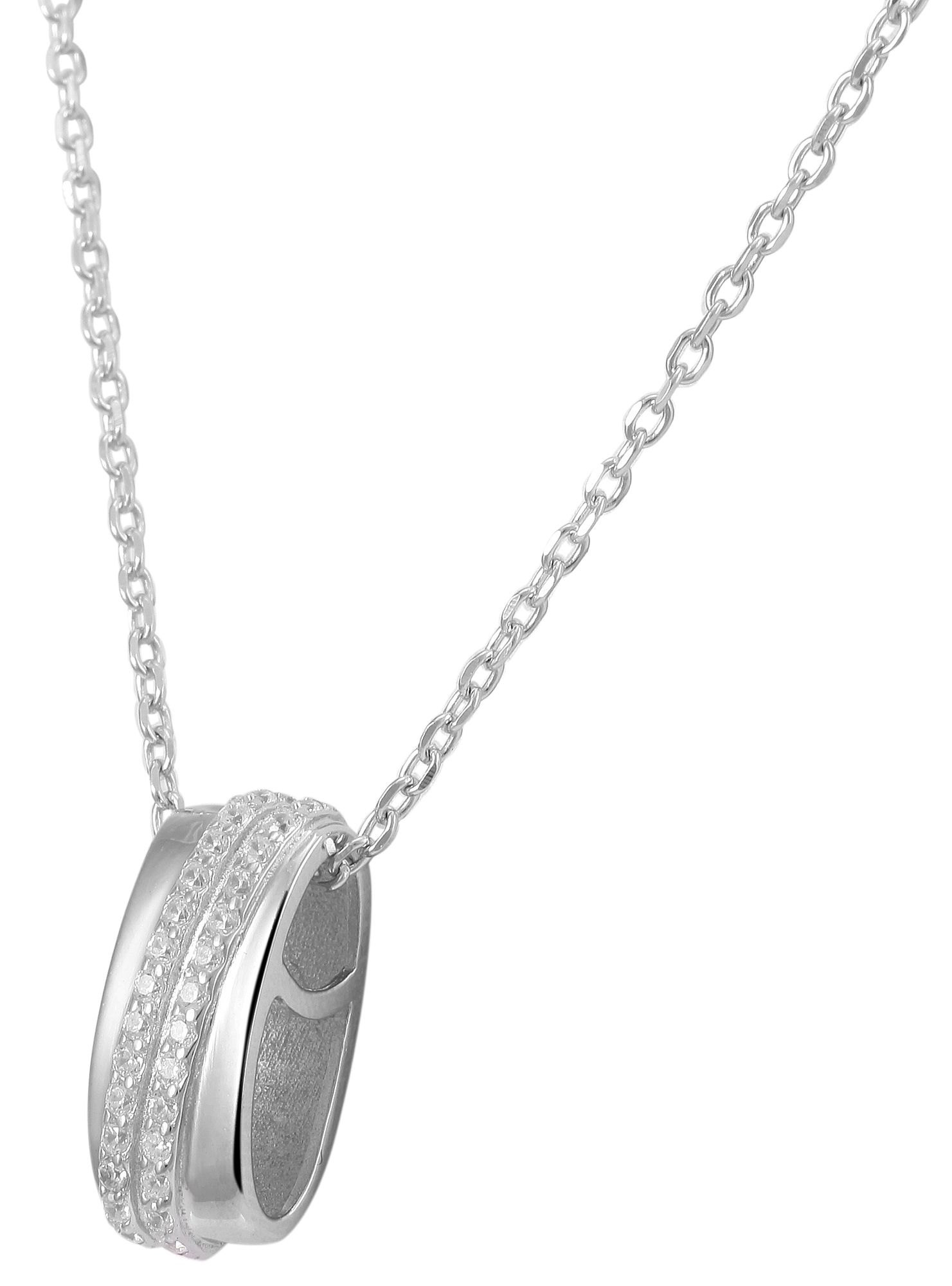De elegante dameshanger is gemaakt van 925 Sterling zilver en is bovendien gerhodineerd. Deze coating geeft het sieraad een geweldige glans en beschermt het tegen aanslag. De voorkant van de hanger is bezet met 28 zirkonia steentjes in een prongzetting. De stenen lopen in twee rijen diagonaal over de hanger. De hanger heeft geen kettinglus, maar is open aan de binnenkant zodat de ketting er gewoon doorheen kan worden geregen. Houd er bij de aankoop van dit product rekening mee dat de hanger zonder ketting wordt geleverd. De hanger heeft een lengte van 17 mm, een breedte van 7 mm en een dikte van 7 mm. Al met al is deze hanger een mooi en tijdloos accessoire dat voor talloze gelegenheden kan worden gecombineerd - zowel in het dagelijks leven als voor feestelijke gelegenheden of een zakelijke bijeenkomst.