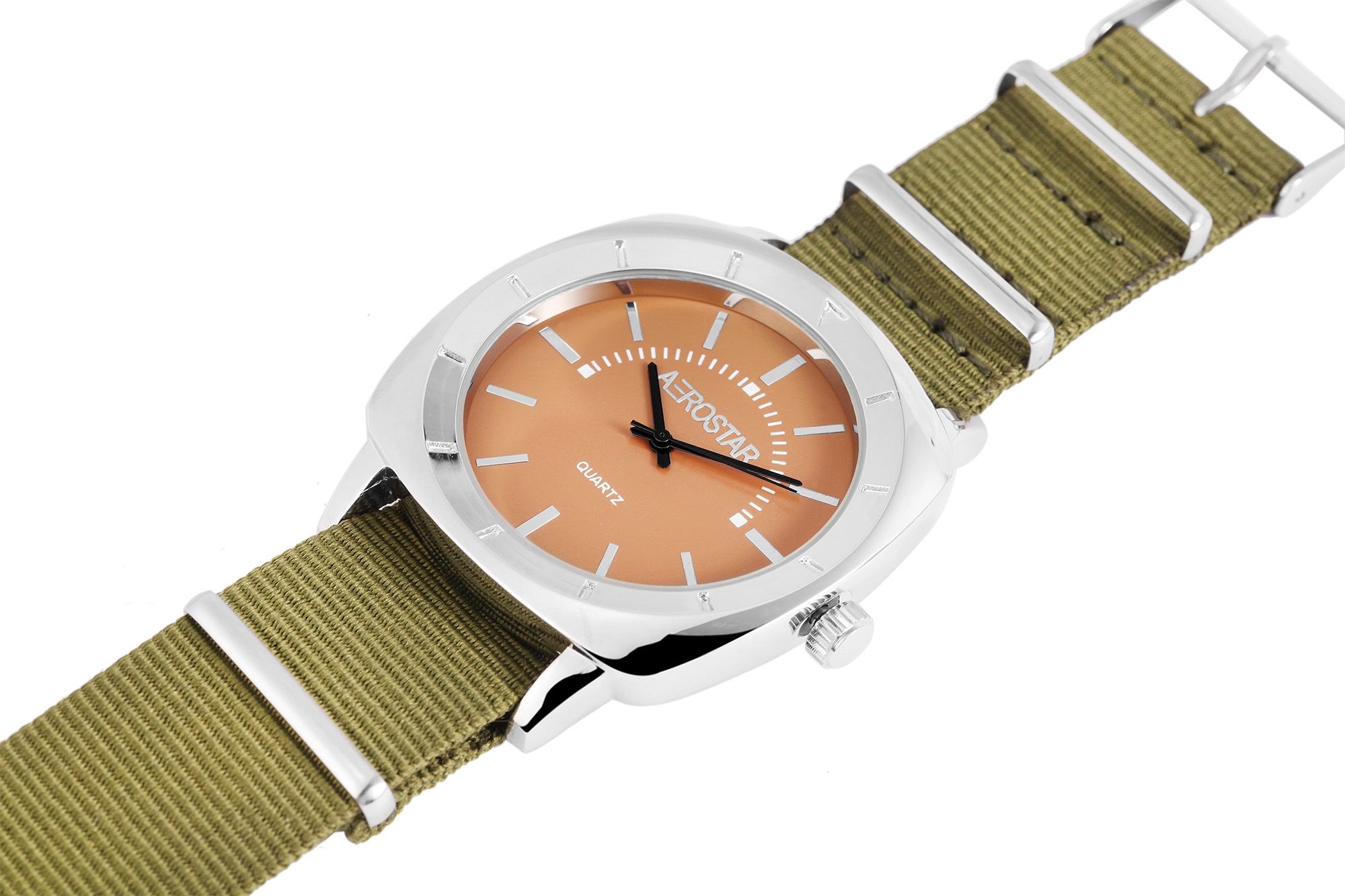 Het analoge herenhorloge van het merk Aerostar heeft een hoogwaardig kwartsuurwerk. De band van textiel is 24 mm breed en opent met een gesp. De totale lengte is 24 cm. De metalen kast met mineraalglas meet 47 mm en is 9 mm hoog. De kastdeksel is gemaakt van roestvrij staal.