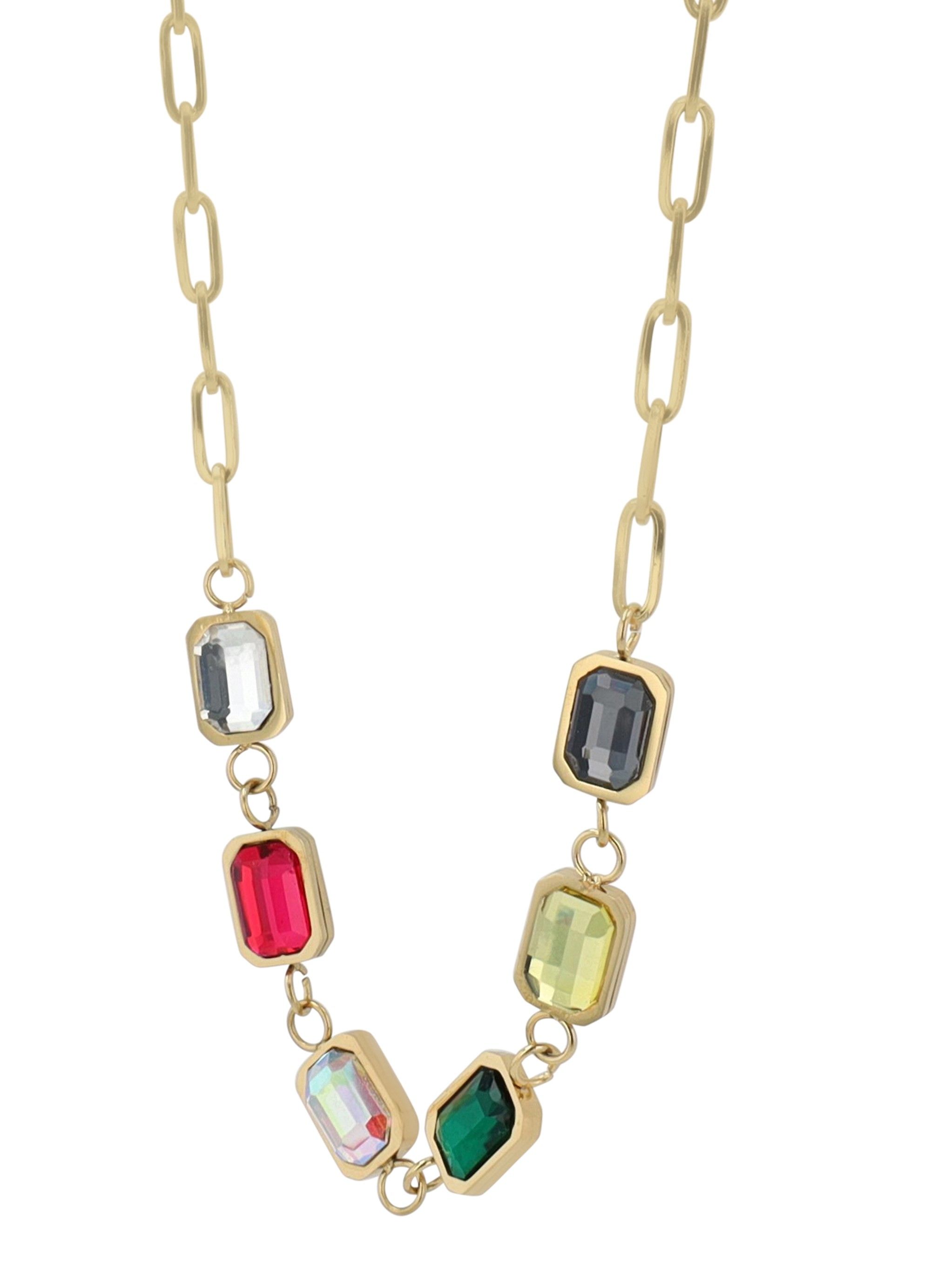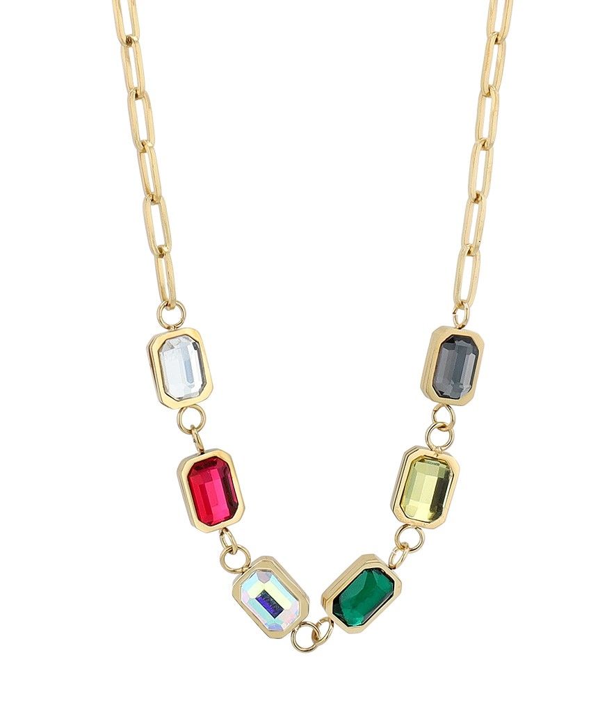 "Defne" roestvrij stalen collier met hanger, gekleurde zirkonia stenen, 44+5cm, zilverkleurig en goudkleurig 6 vaste hangers, elk van 7,5 x 5,5 mm, versierd met gekleurde zirkonia stenen