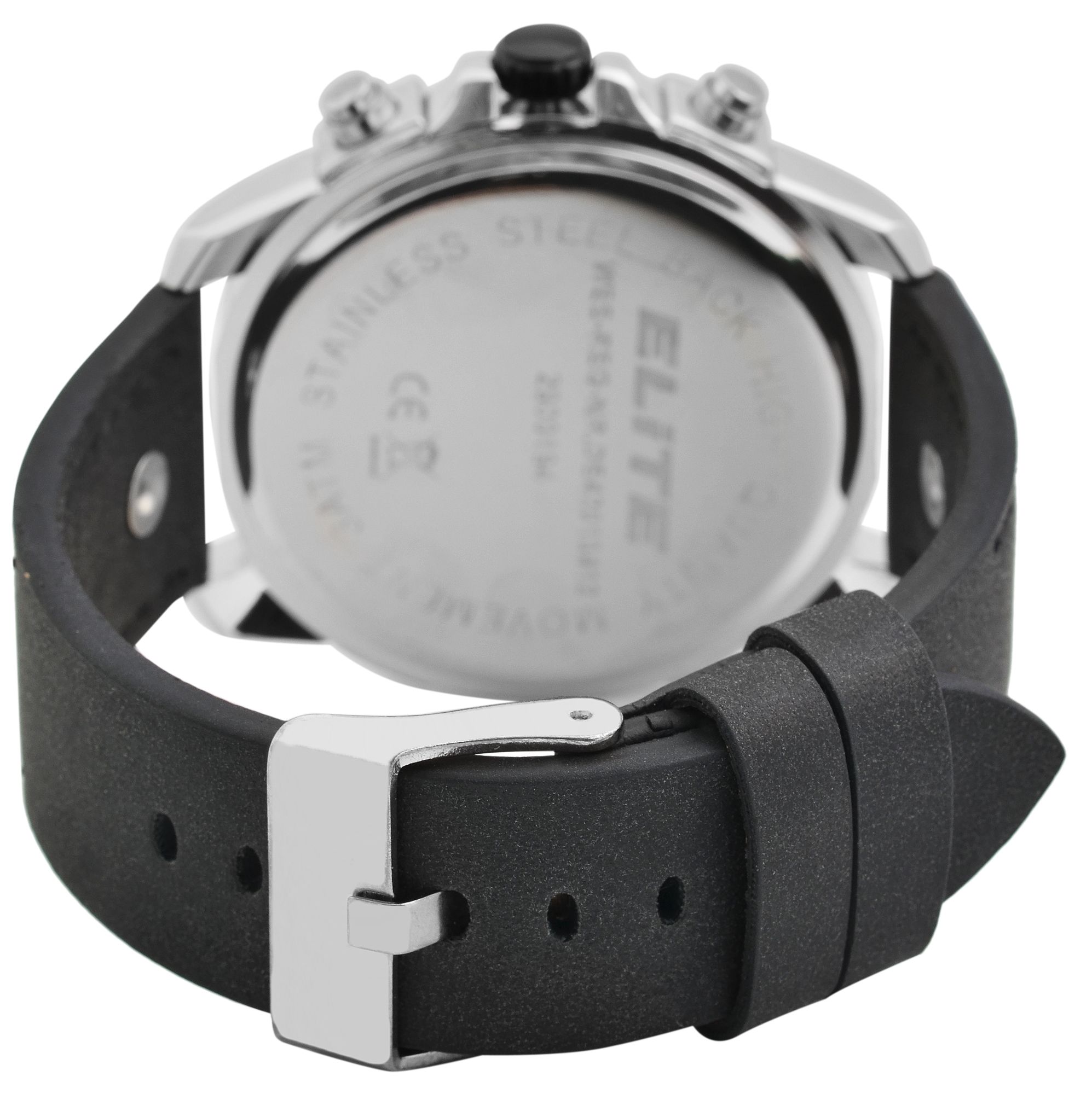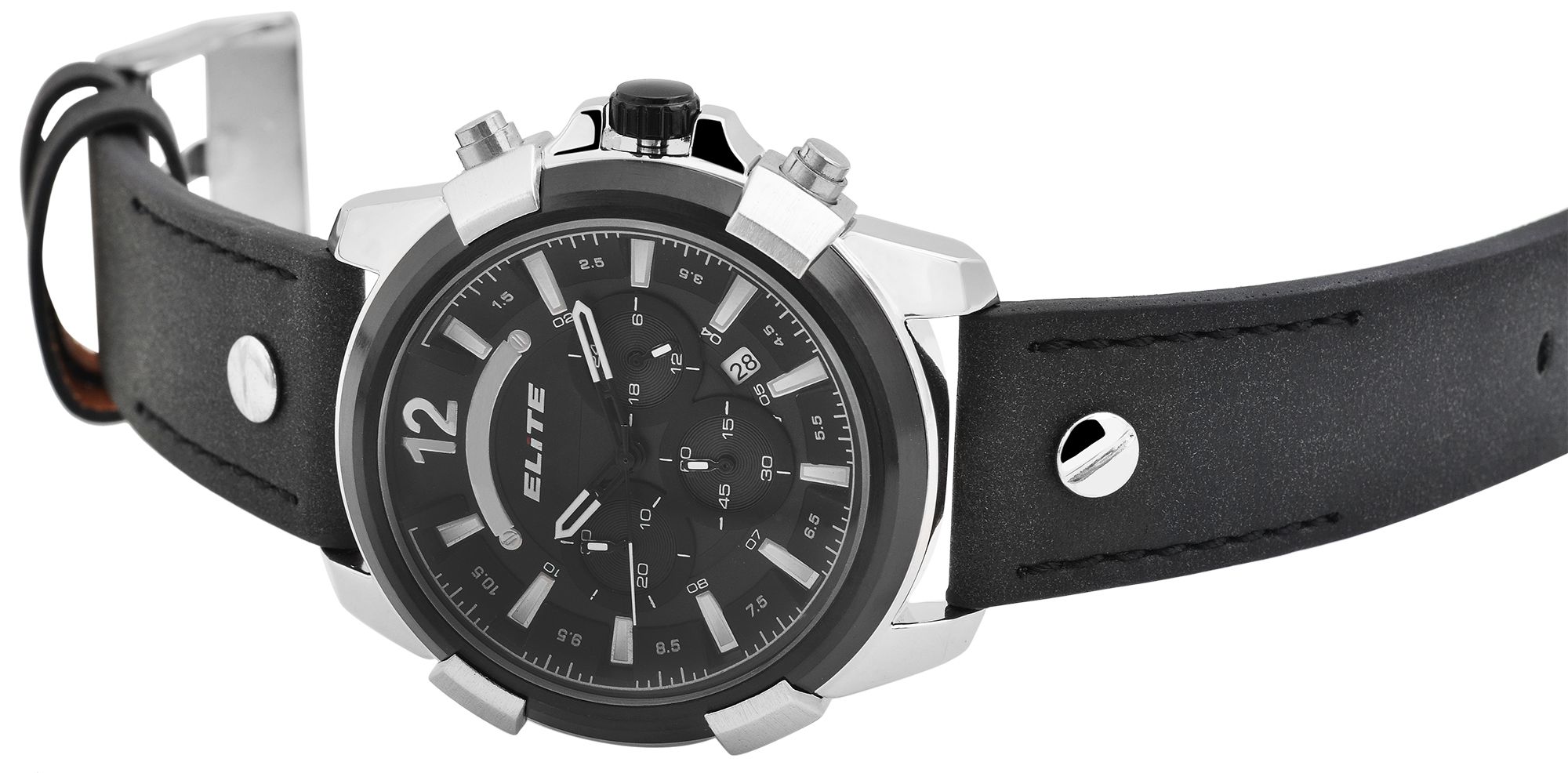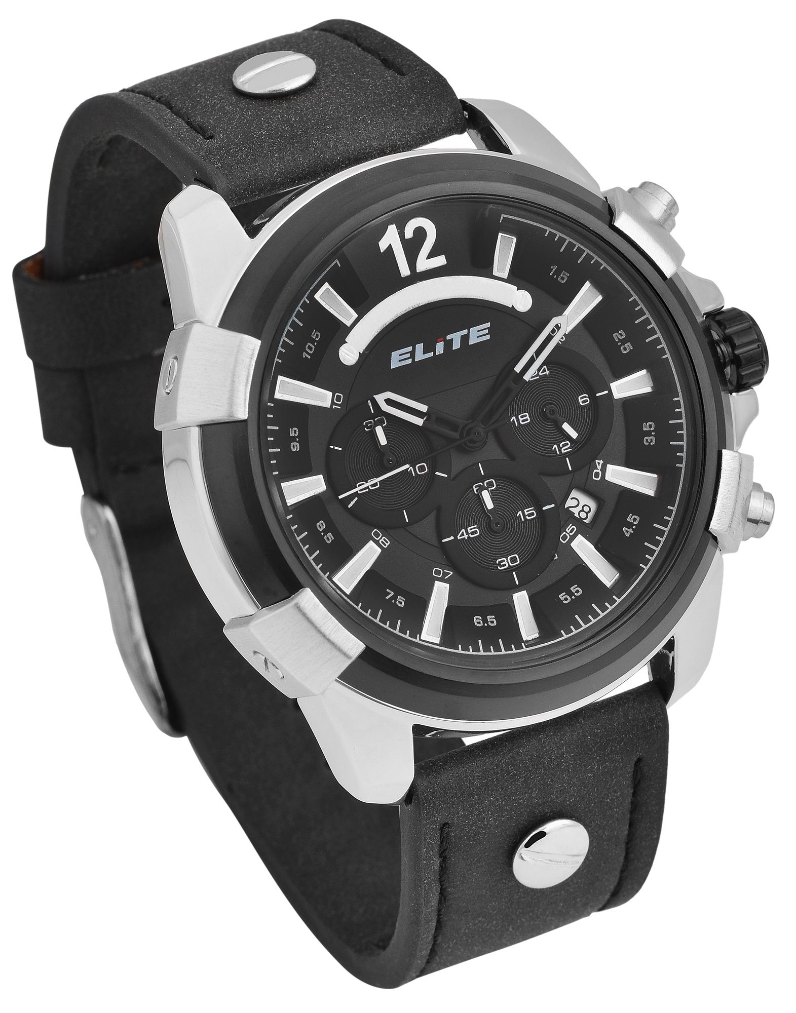 Elite Herren Chronograph mit Lederimitationsband, 3ATM, Schwarz/ silberfarbig