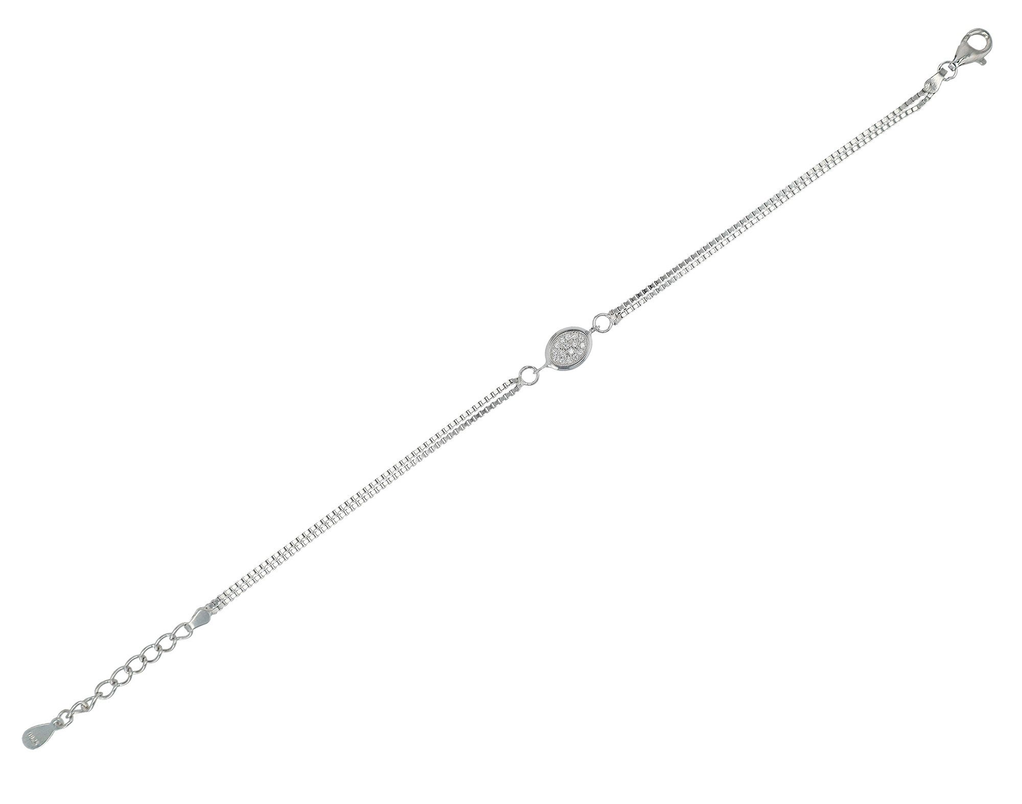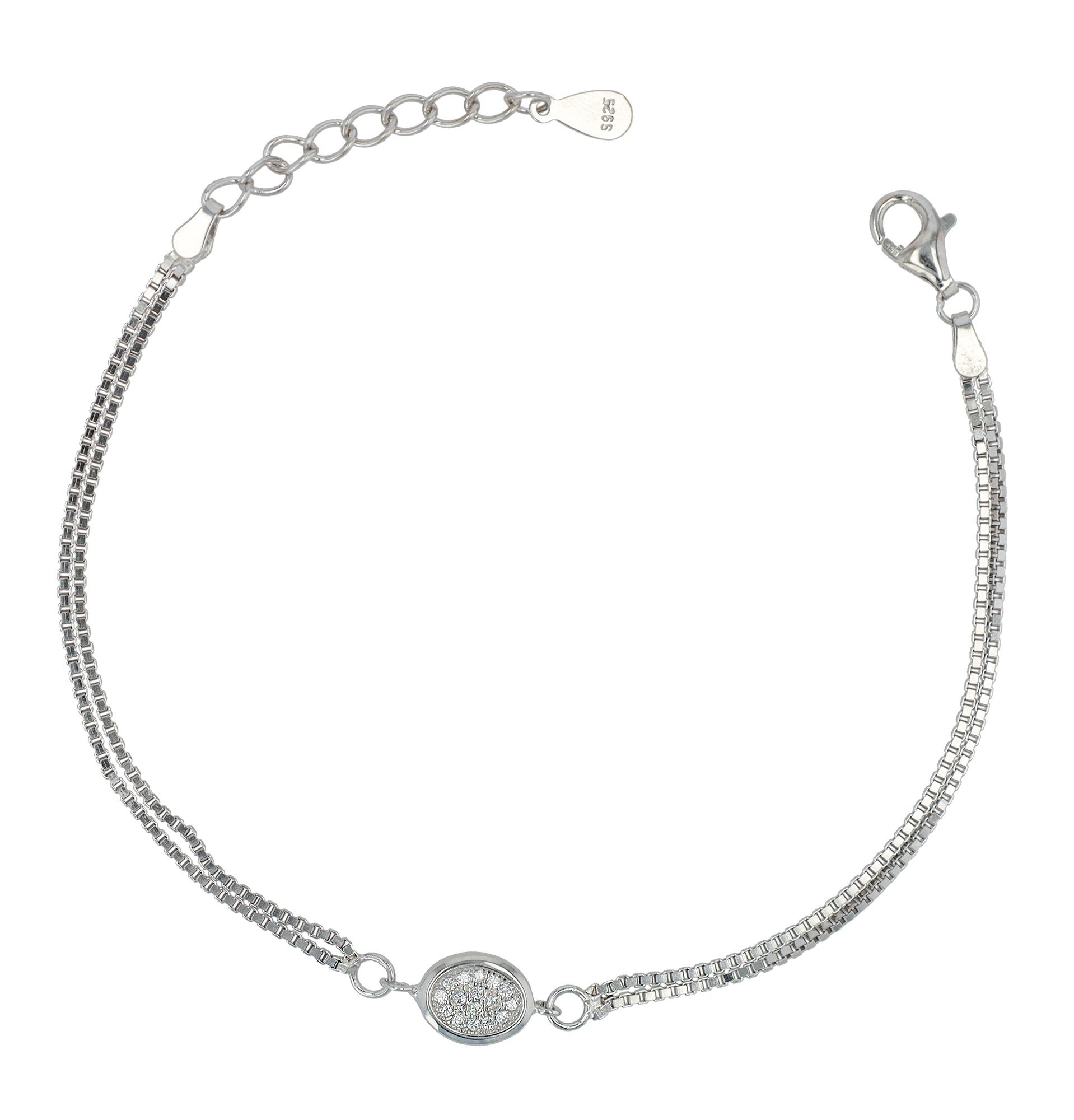 Onze "Yara" armband is gemaakt van 925/- sterling zilver en afgewerkt met een rhodium plating. Het is een investering in kwaliteit en stijl. Hij wordt gekenmerkt door zijn dubbelrijige Venezia-kettingconstructie, die hem een robuuste en toch delicate structuur geeft. Het ovale element met zirkonia is stevig geïntegreerd in het ontwerp en heeft een sierlijke afmeting van 14 x 7 mm. Met een lengte van 17 cm plus een verlengkettinkje van 3 cm biedt de armband flexibiliteit en comfort. Hij kan gemakkelijk worden aangepast aan verschillende polsmaten en de karabijnsluiting houdt de armband stevig om de pols en zorgt ervoor dat hij gemakkelijk om- en afgedaan kan worden.