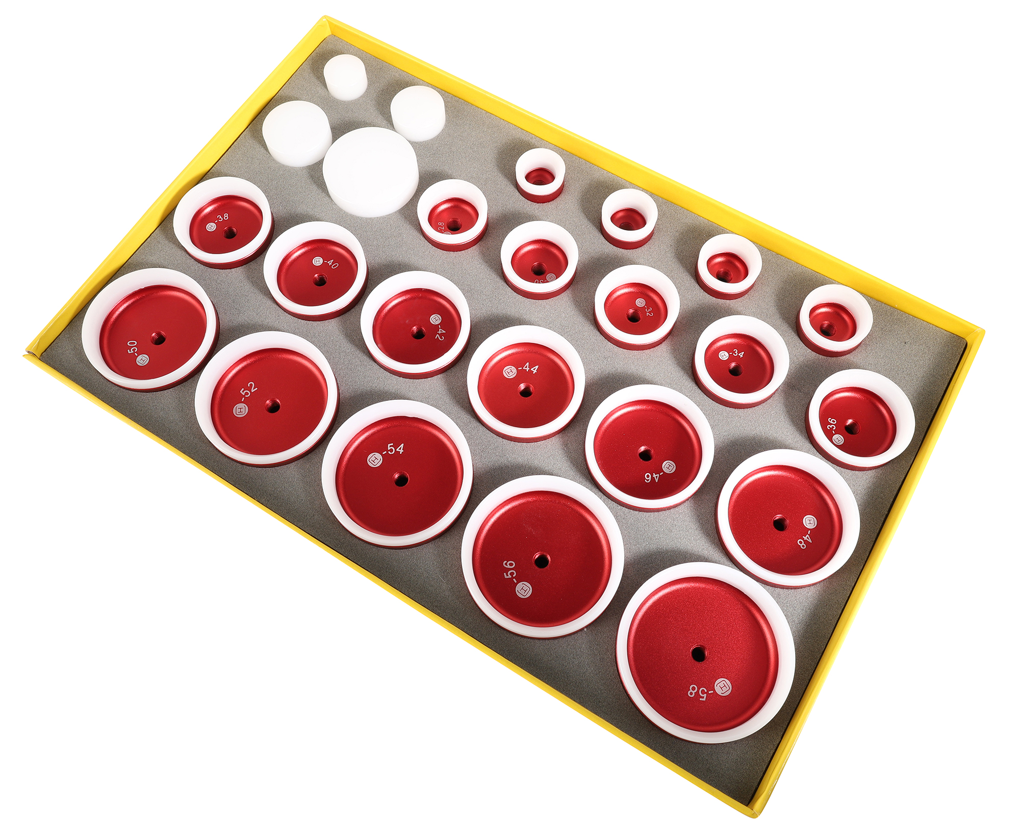 die dienen als universele drukstukken voor alle drukstukmaten van 1) Ø 20 mm - 26 mm, 2) Ø 28 mm - 36 mm, 3) Ø 38 mm - 48 mm en 4) Ø 50 mm - 58 mm.