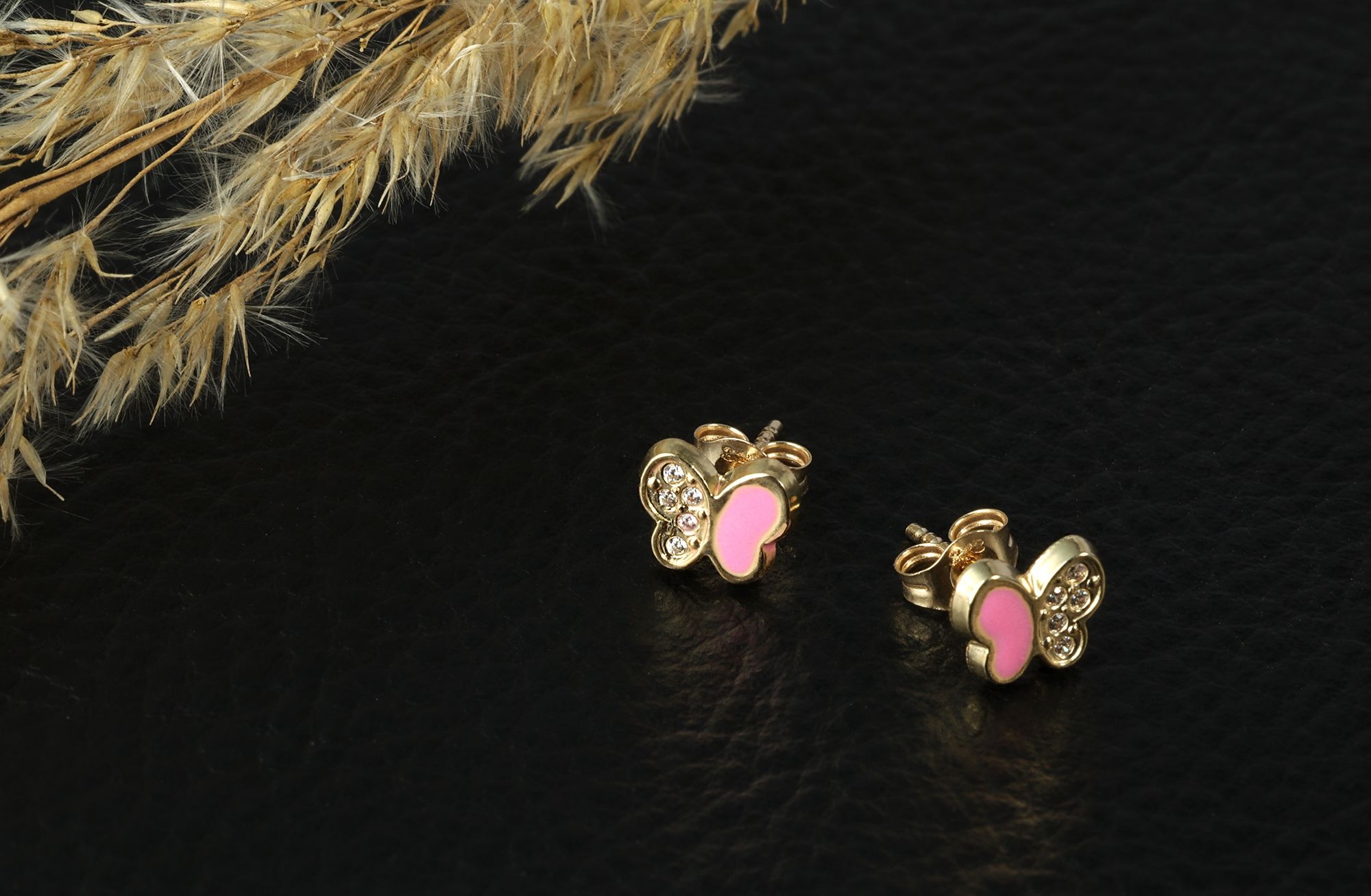Ontdek onze betoverende vlinder stud oorbellen in 333 geelgoud. Deze sprankelende studs zijn versierd met emaille en bezet met glinsterende zirkonia steentjes. Deze gedetailleerde accenten zullen meisjesharten sneller doen kloppen en hun avonturen nog kleurrijker maken. De vleugelschroef zorgt voor een stevige grip op het oorgat, waardoor de oorbellen onmogelijk uit zichzelf uit kunnen vallen. Dompel jezelf onder in de fascinerende wereld van onze gouden sieraden en breid je collectie uit met deze schattige oorstekers voor kinderen.