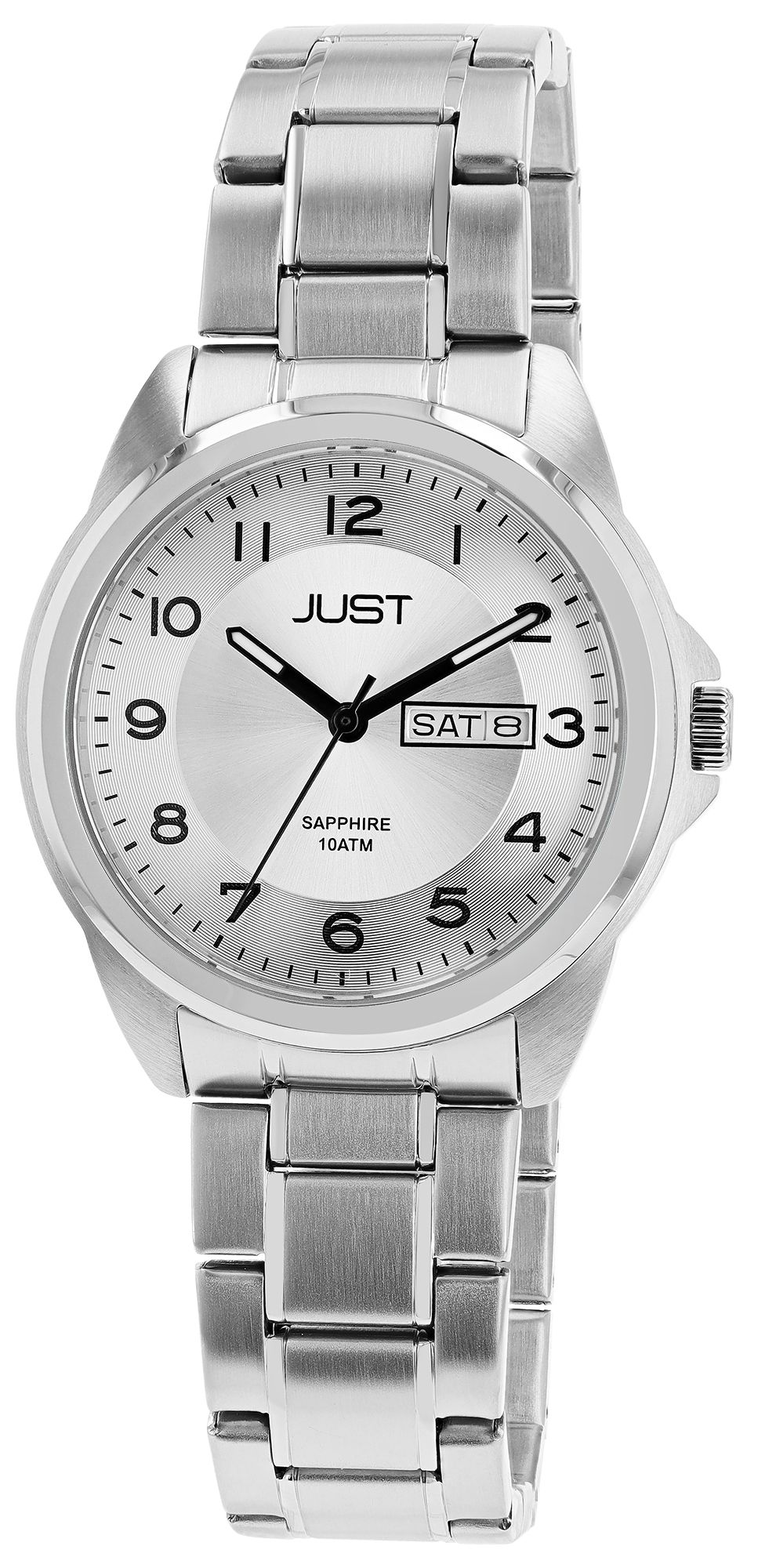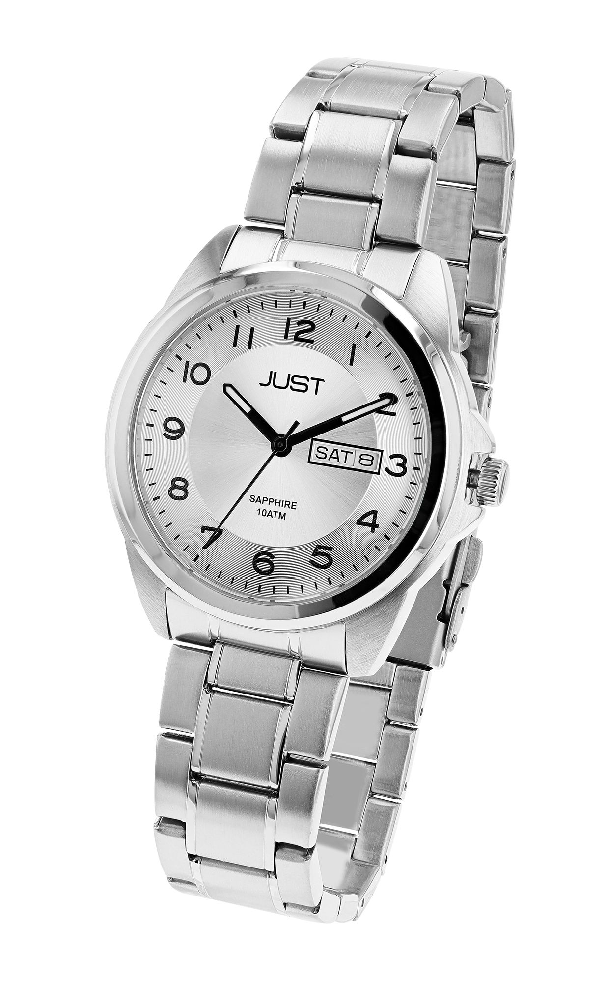 Het JUST roestvrijstalen polshorloge voor heren heeft duidelijke Arabische cijfers zodat je de tijd gemakkelijk kunt aflezen. Naast de tijd laat dit horloge ook de datum en de dag van de week zien. Met een totale lengte van 22 cm biedt dit horloge een comfortabele pasvorm voor dagelijks gebruik. De roestvrijstalen kast heeft een diameter van 40 mm en is 10 mm hoog. De achterkant van de kast is ook van roestvrij staal. Het saffierglas zorgt voor een betrouwbare krasbestendigheid en duurzaamheid van de wijzerplaat. De 20 mm brede roestvrijstalen schakelarmband is veilig bevestigd met een vouwsluiting. Met een waterdichtheid van 10 bar is dit horloge ook geschikt voor activiteiten zoals handen wassen of zwemmen. Over het geheel genomen combineert het JUST horloge met roestvrijstalen band voor heren functionaliteit, stijl en duurzaamheid in een tijdloos ontwerp.