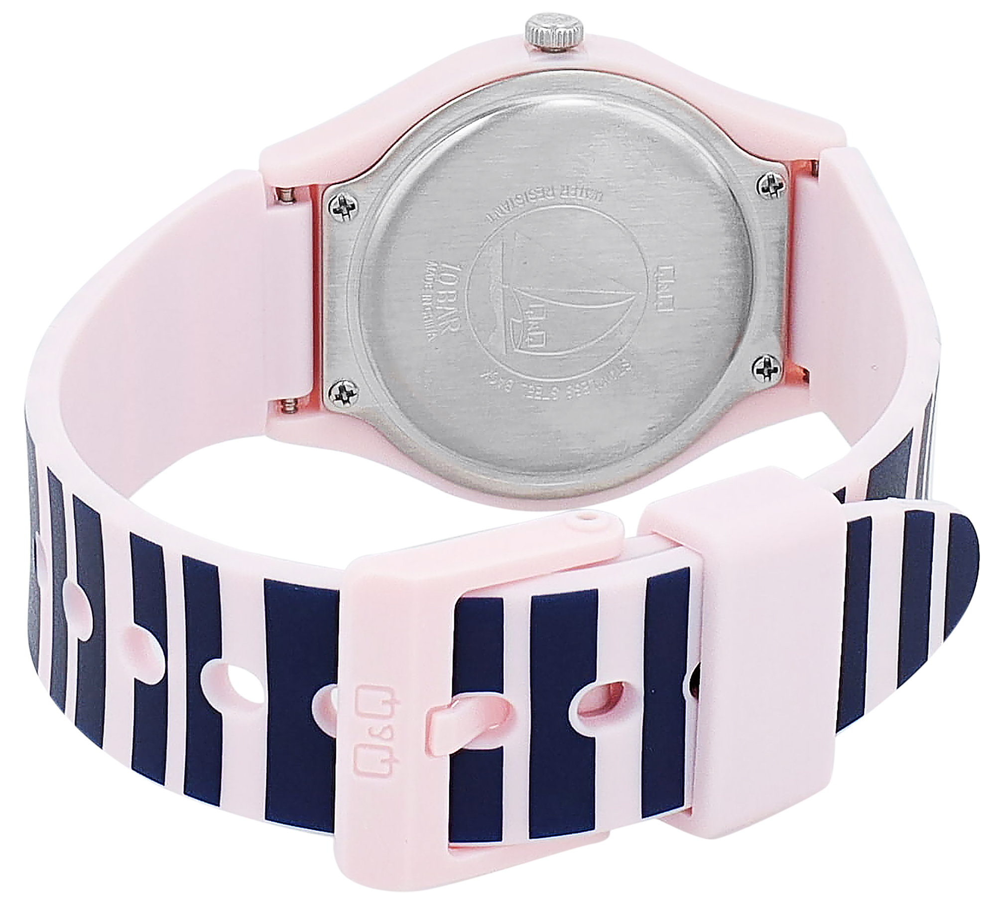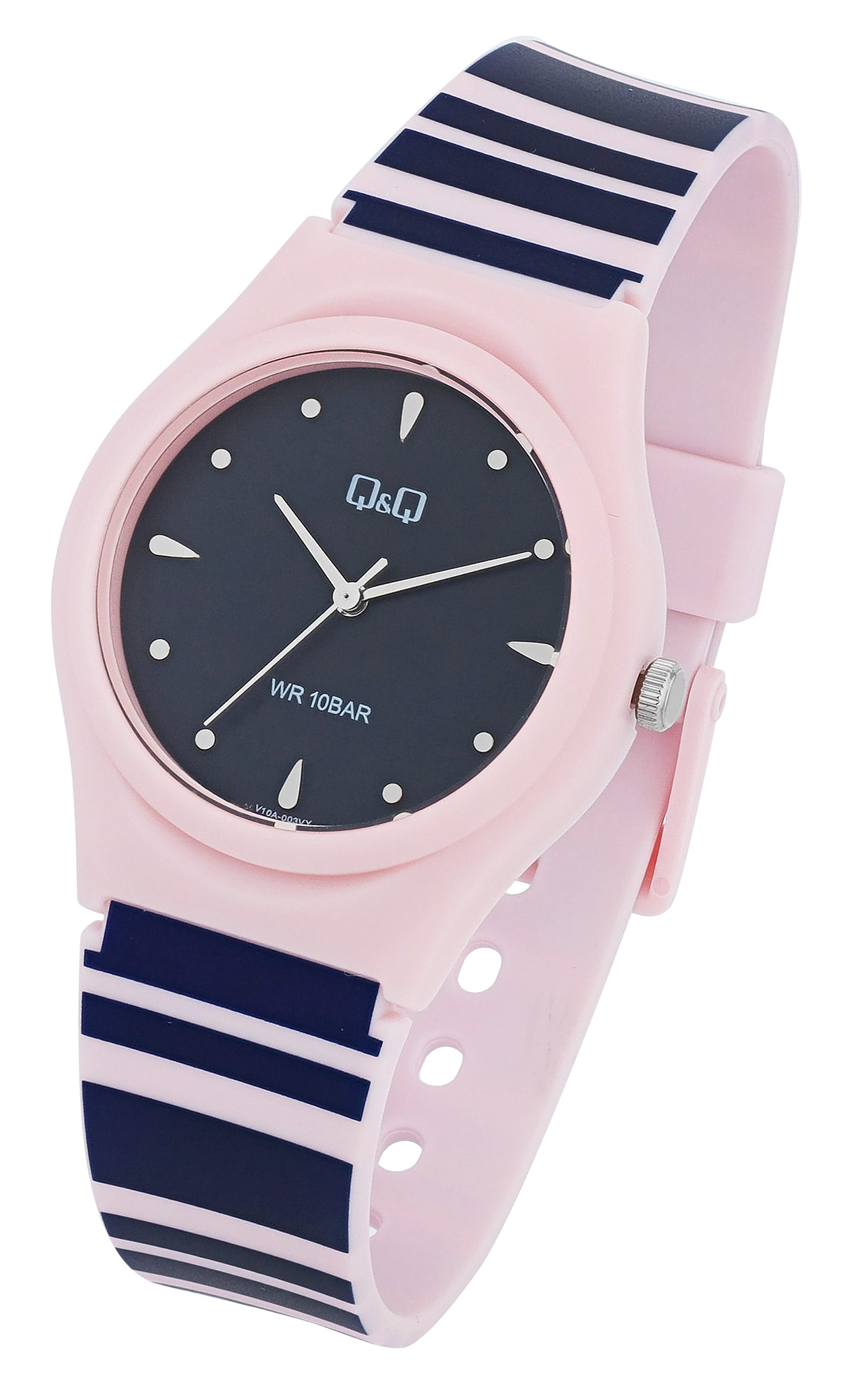 Dit roze polshorloge van het merk Q&Q - by Citizen Watch Co. LTD maakt niet alleen indruk met zijn bijzondere look, maar ook met zijn eersteklas kwaliteit. Het hoogwaardige quartz uurwerk garandeert een nauwkeurige tijdmeting en met een indrukwekkende waterbestendigheid van 10 bar is dit horloge klaar voor elke uitdaging. De blauw/roze gestreepte siliconen band is niet alleen comfortabel om te dragen, maar is ook extreem duurzaam en slijtvast. De kast in een mooie roze kleur is gemaakt van robuust kunststof en geeft het horloge een moderne uitstraling. Het transparante kunststof kristal beschermt de donkerblauwe wijzerplaat en zorgt ervoor dat de tijd altijd duidelijk kan worden afgelezen. Met een kastdiameter van 34 mm en een kasthoogte van 10 mm is dit uurwerk een horloge dat niet onopgemerkt zal blijven. De 20 mm brede band en de totale lengte van 24,5 cm zorgen ervoor dat het horloge comfortabel om de pols zit. De achterkant van de kast is gemaakt van roestvrij staal, wat het horloge extra stabiliteit en kwaliteit geeft. De zilverkleurige uurmarkeringen zorgen samen met de zilverkleurige wijzers voor een uitstekende afleesbaarheid en voegen een stijlvolle touch toe.