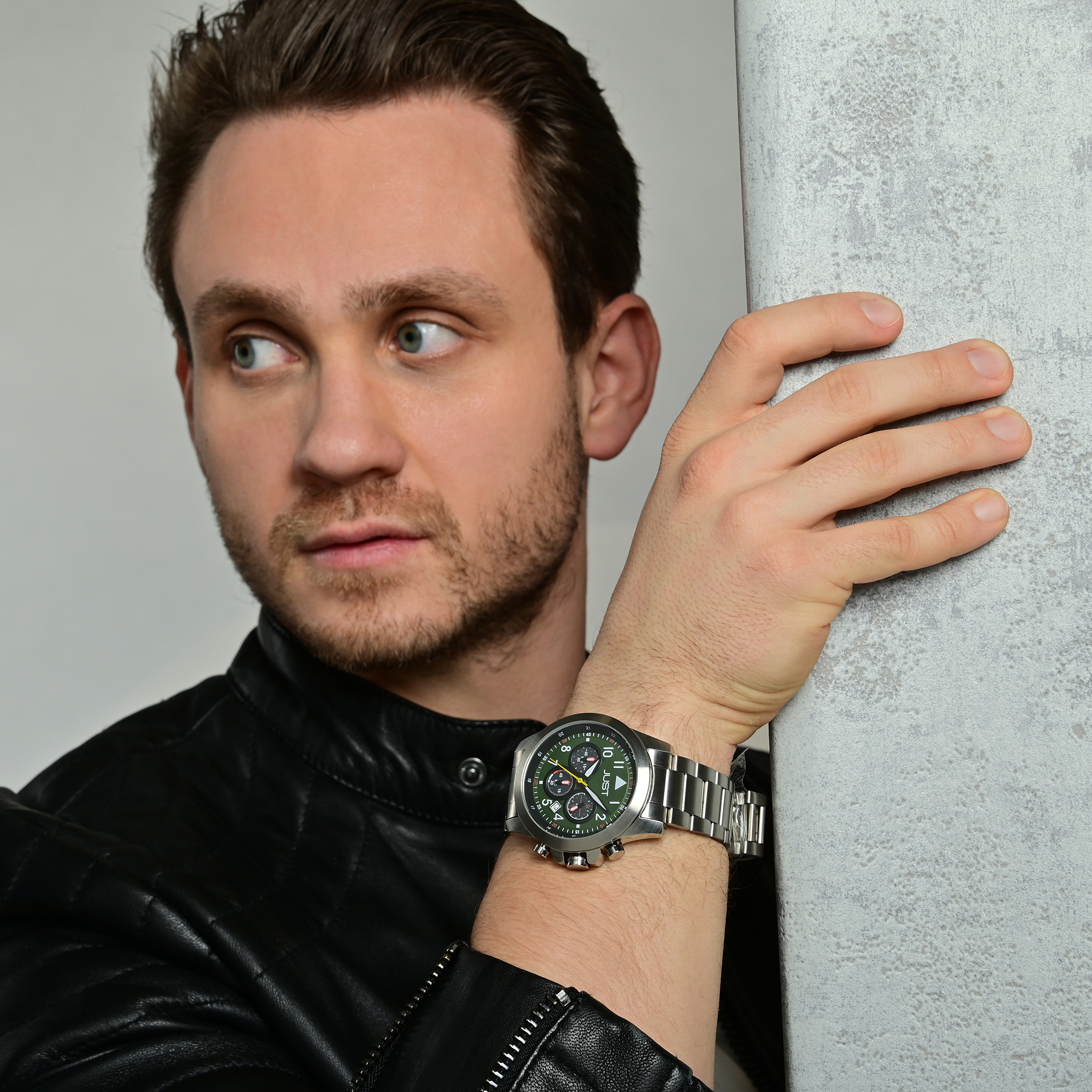 De robuuste roestvrijstalen kast van 45 mm geeft het horloge een zelfverzekerde uitstraling, perfect aangevuld door de mat gepolijste roestvrijstalen armband van 22 mm, die comfortabel is om te dragen. De praktische vouwsluiting maakt het gemakkelijk om het horloge om te doen en af te doen.