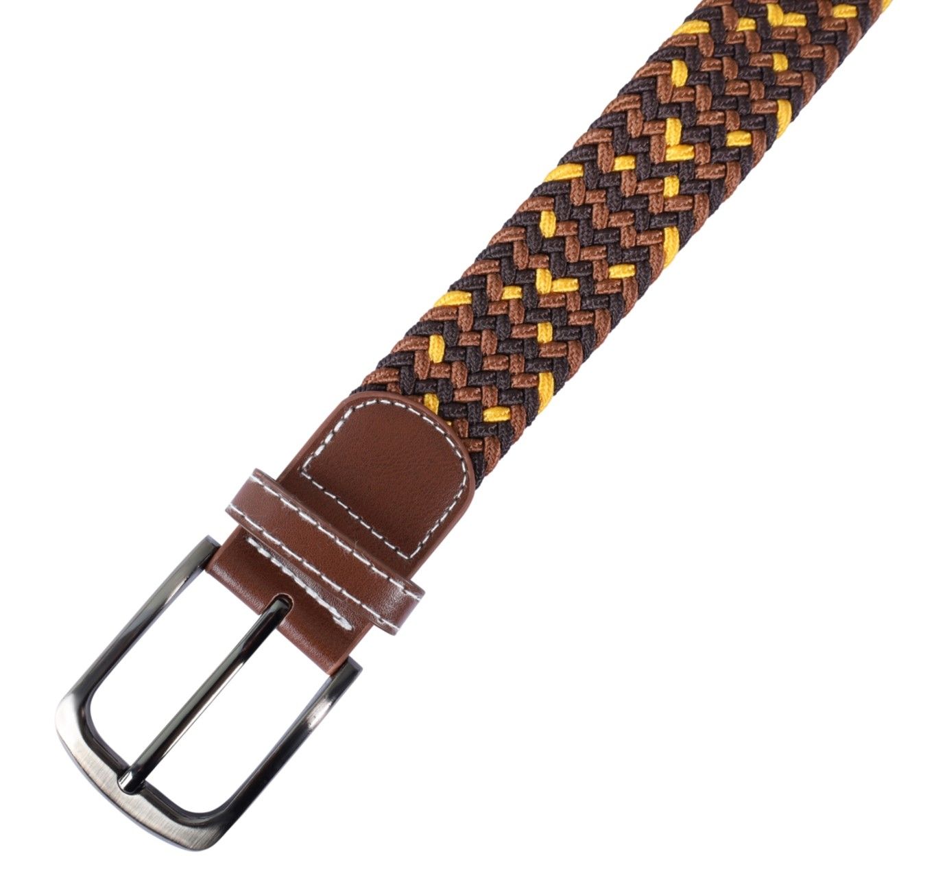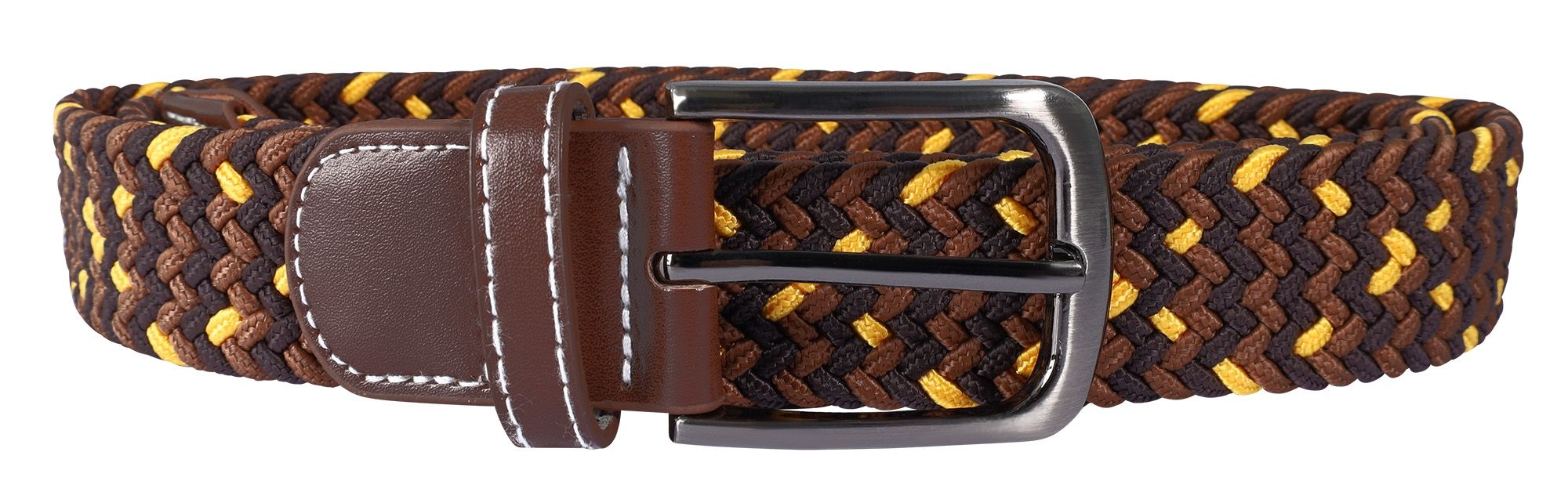 Gevlochten riem, een onmisbaar accessoire voor de komende zomer. Het kenmerkende zigzagpatroon van onze hoogwaardige textielen riemen voegt een speciale touch toe aan elke outfit. De perfect op elkaar afgestemde tinten geel, lichtbruin en donkerbruin springen meteen in het oog en beide uiteinden van de riem zijn verstevigd met bruine applicaties van imitatieleer, wat de riem een elegante touch geeft.
