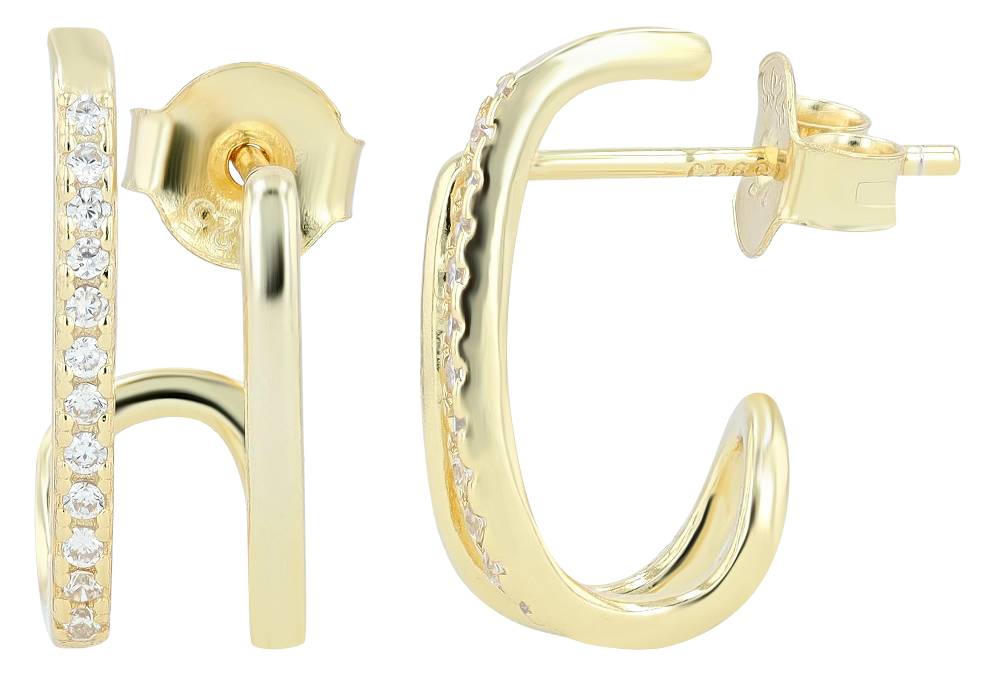 Deze delicate oorstekers van 925 sterling zilver hebben de vorm van een halve hoepel met 2 zichtbare studs. De stud bezet met fonkelende zirkonia steentjes is een bijzondere blikvanger en geeft dit sieraad net dat beetje extra en elegantie. Verkrijgbaar in 2 kleurvarianten - zilverkleurig of verguld - met een praktische push-in sluiting voor eenvoudig aanbrengen, hebben deze oorstekers een tijdloze, heldere uitstraling en zijn ze perfect te combineren voor elke gelegenheid.