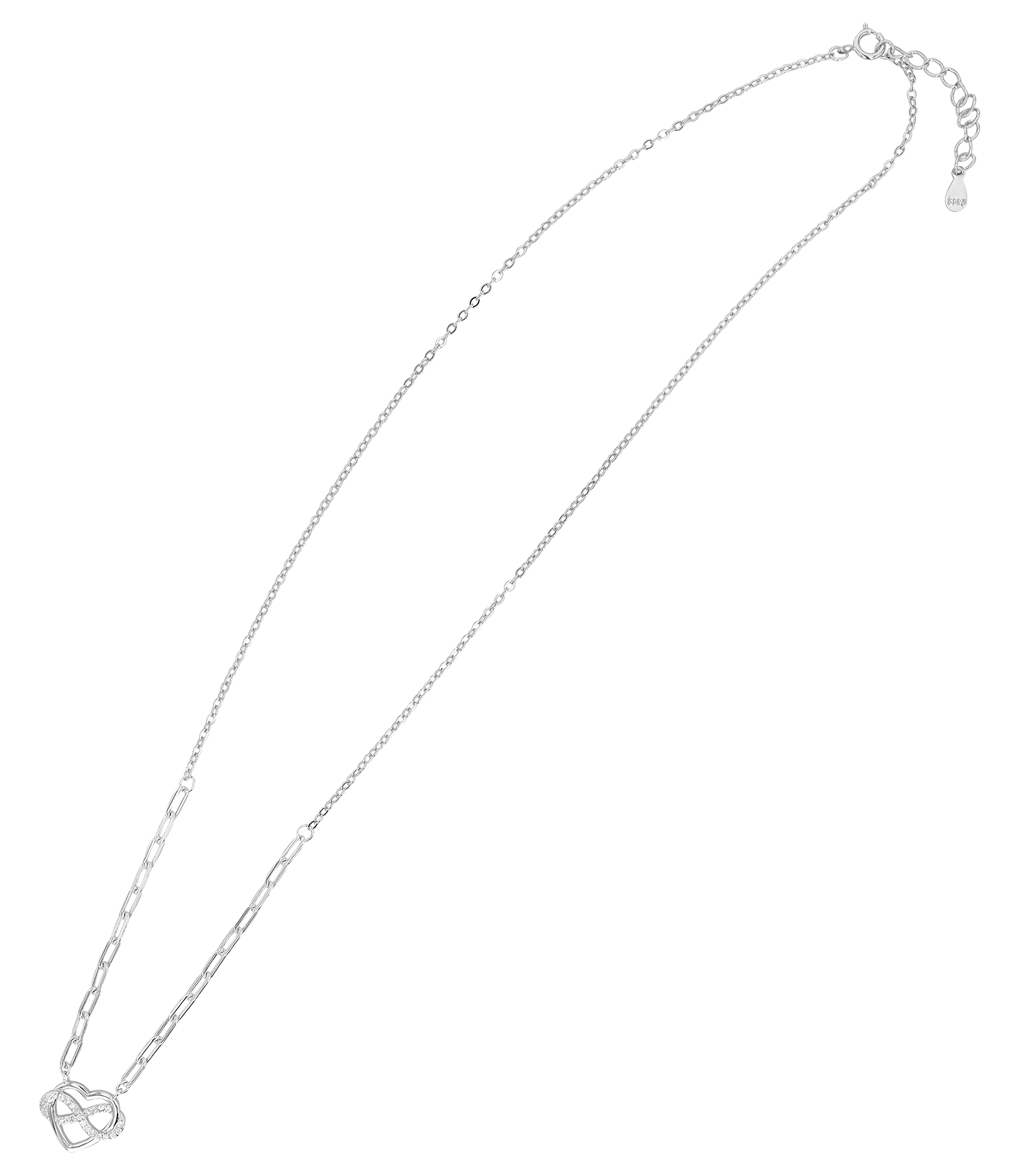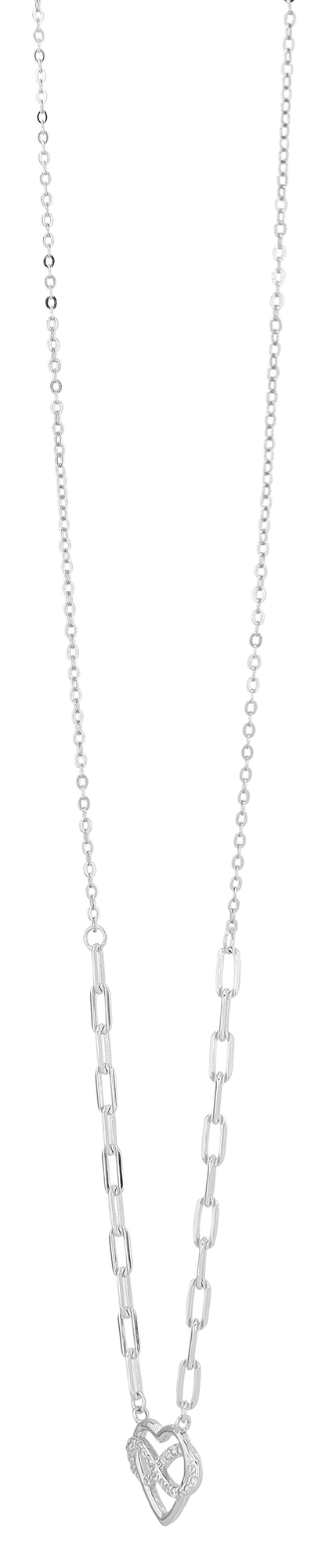 Een elegant sieraad vol symbolische kracht: deze hoogwaardige ketting van gerhodineerd 925 sterling zilver combineert tijdloze stijl met diepgaande betekenis. De hartvormige hanger, versierd met een filigraan oneindigheidsteken en fonkelende zirkonia, symboliseert oneindige liefde en verbondenheid. De hanger meet 12 x 14 mm en wordt aan beide kanten omlijst door een ketting van 5 cm. Het is de ideale metgezel voor speciale gelegenheden of als dagelijks symbool van liefde en eeuwigheid. Met een lengte van 42 cm en een extensie van 3 cm past de ketting zich aan elke halslijn aan. Dit accessoire is een geschenk dat uit het hart komt.