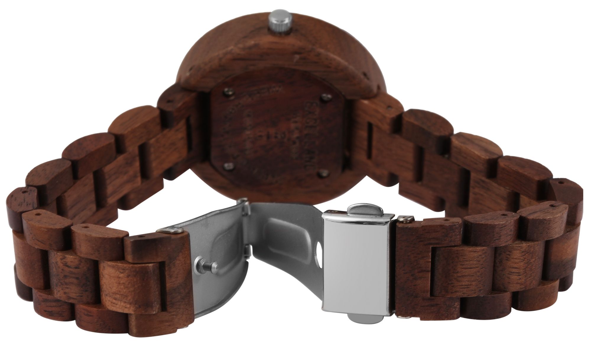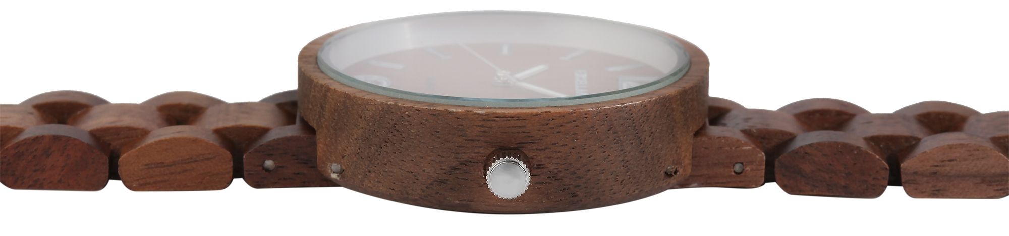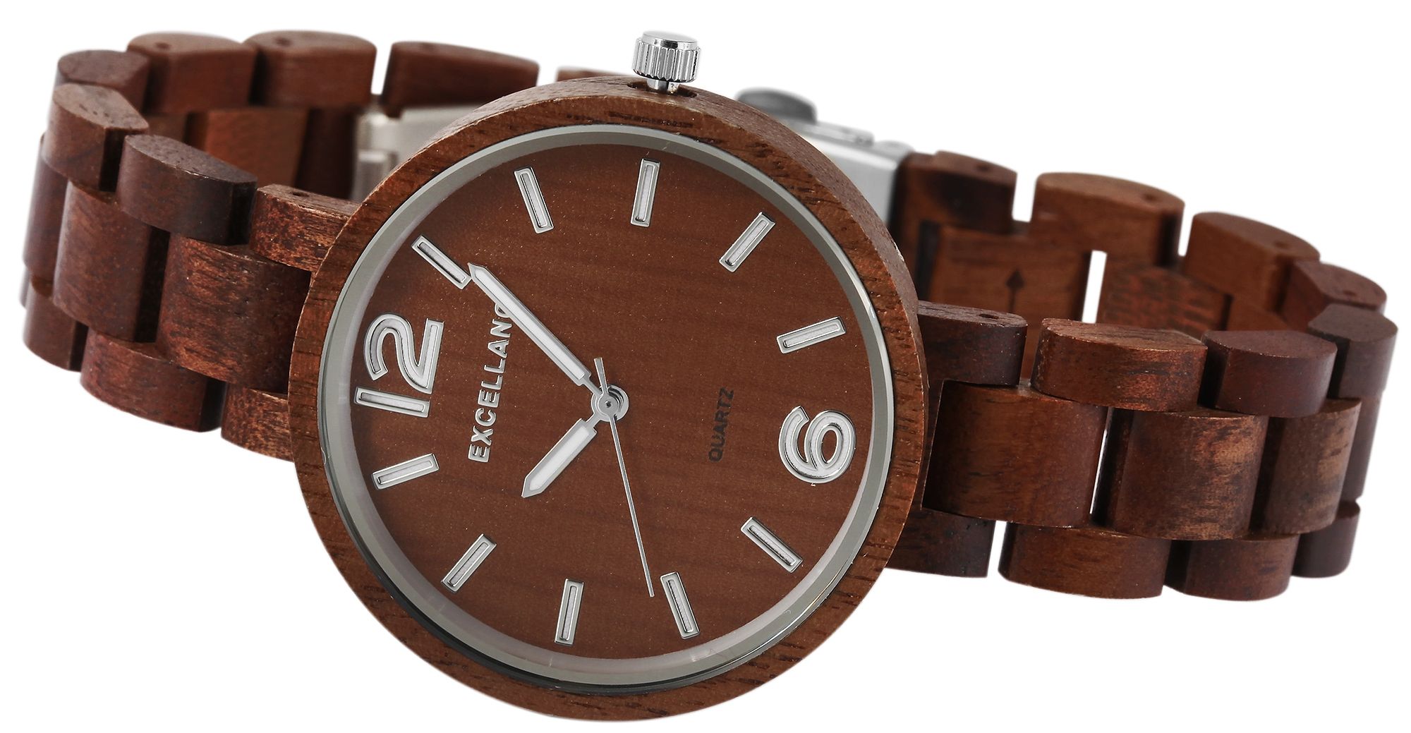 Het analoge damespolshorloge met 3 wijzers van het merk Excellanc heeft een hoogwaardig kwartsuurwerk. De walnotenhouten band is 16 mm breed bij de lug en kan worden geopend en gesloten met een zilverkleurige roestvrijstalen vouwsluiting. De totale lengte van het horloge is 22 cm, maar kan naar wens worden ingekort dankzij de afneembare elementen. De kast, die ook gemaakt is van walnoothout met een houten achterkant in dezelfde kleur en mineraalglas, heeft een diameter van 38 mm en een kasthoogte van 11 mm. Een visueel hoogtepunt is het mineraalglas met een zilverkleurige spiegelrand aan de buitenrand. Samen met de kleurgecoördineerde kroon geeft dit het horloge een elegante uitstraling. De wijzerplaat is ook van hout. De wijzers en uurmarkeringen passen bij de kleur en ronden het geheel harmonieus af. Een ander bijzonder kenmerk zijn de Superluminova wijzers en indexen, die het mogelijk maken om de tijd zelfs in het donker af te lezen. Elk houten horloge is uniek en individueel. Het is een statement van duurzaam denken en tegelijkertijd een modieus accessoire. De lichtheid van de natuurlijke grondstof zorgt voor een aangenaam draagcomfort, waardoor dit tijdloze horlogemodel onmisbaar is.