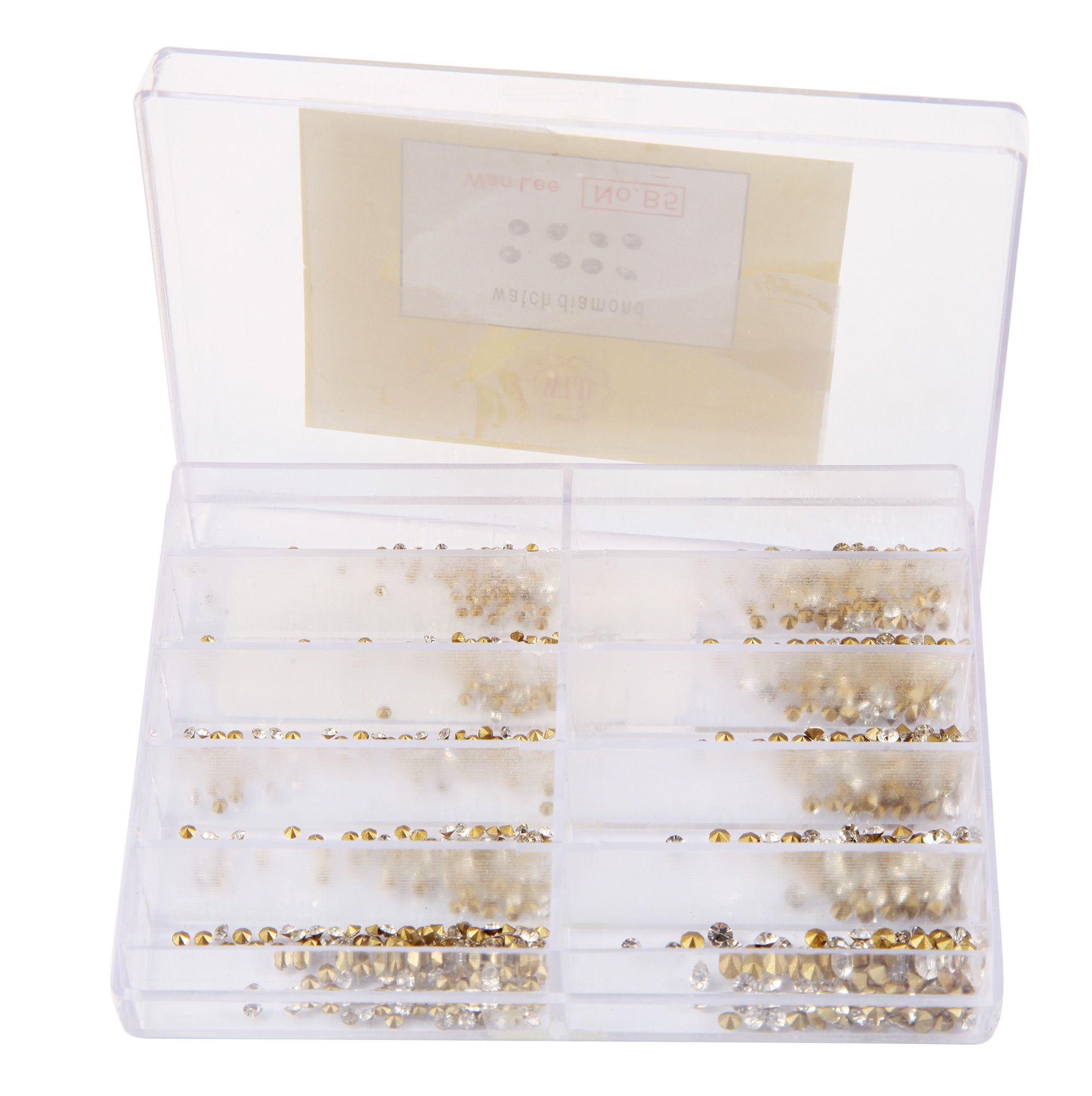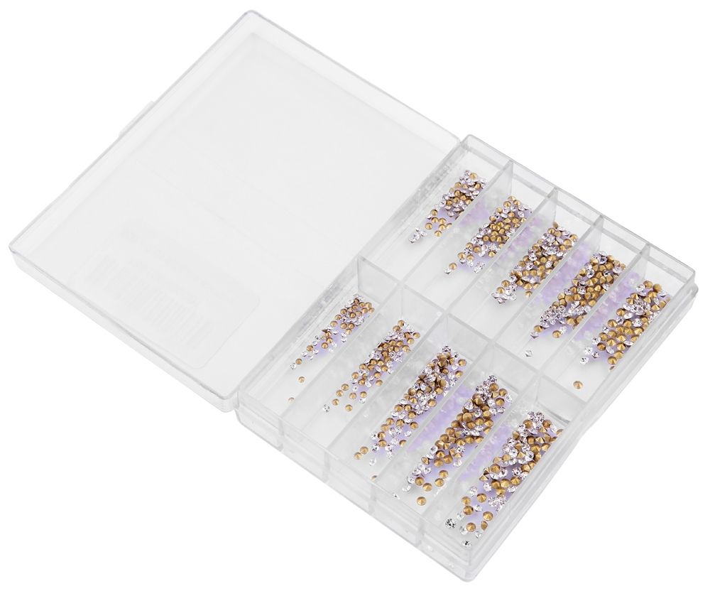 De set bevat 500 fonkelende Similis-steentjes gesorteerd in de maten Ø 1,5 mm, 1,6 mm, 1,7 mm, 1,8 mm, 1,9 mm, 2,0 mm, 2,1 mm, 2,2 mm, 2,3 mm en 2,4 mm.