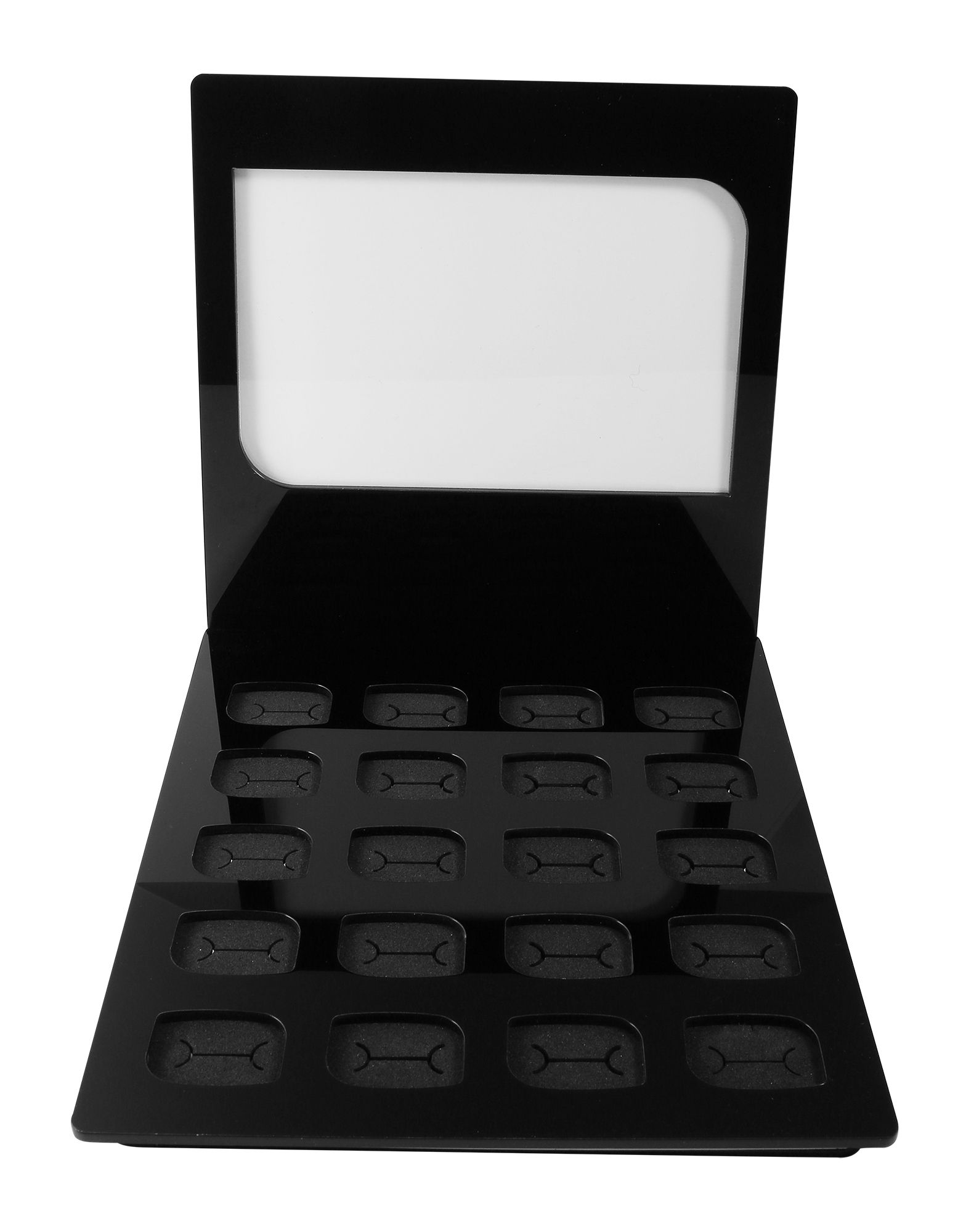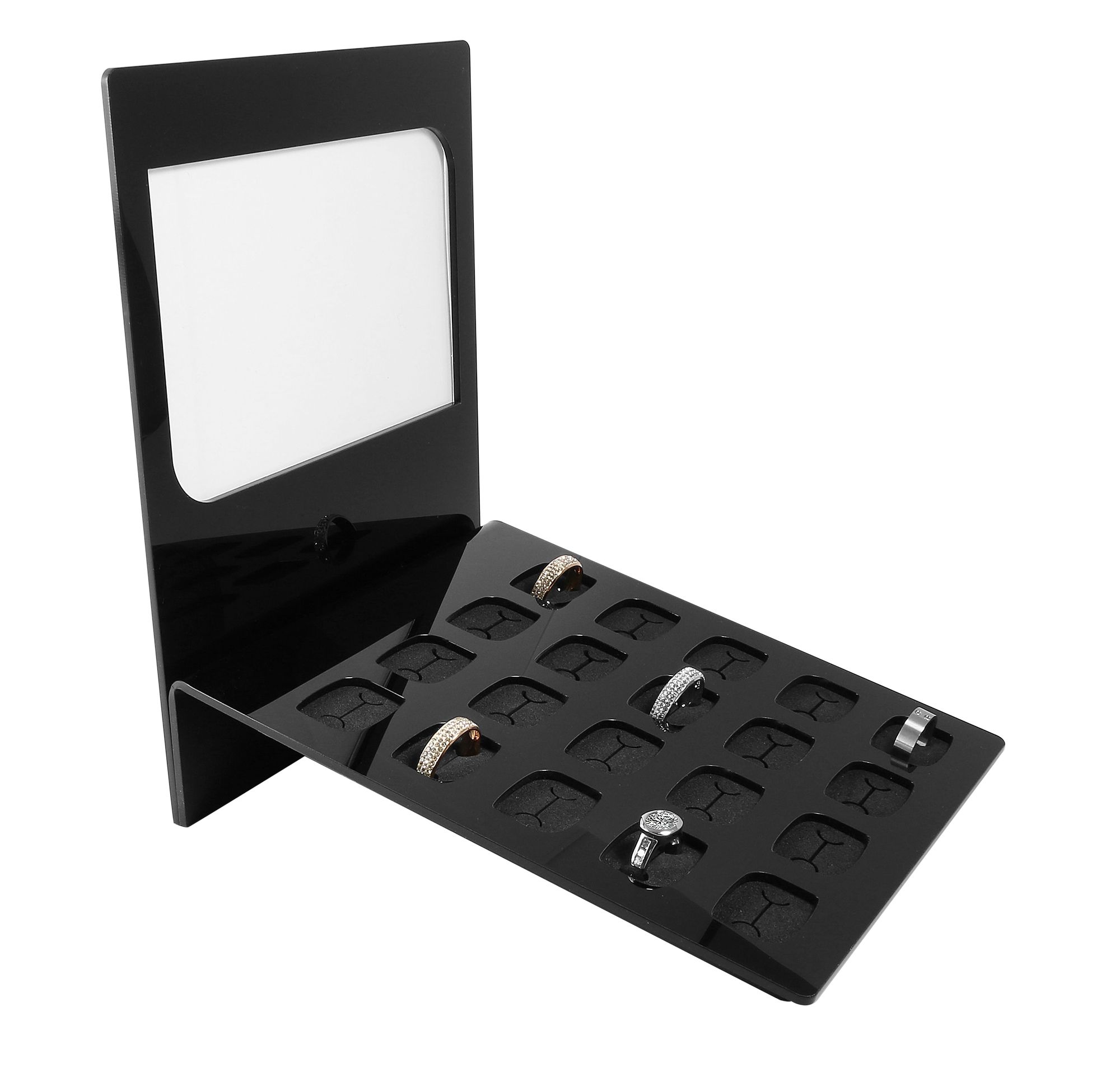 Presenteer je ringen op een elegante manier met onze acryl ringendisplay. Deze verfijnde display biedt ruimte aan 20 ringen en wordt gekenmerkt door functionaliteit en esthetiek. De achterwand is voorzien van een transparant venster dat stevig kan worden vastgeschroefd. Dit opent de mogelijkheid om reclameborden of andere mededelingen te bevestigen om je collectie verder te presenteren. Met compacte afmetingen van 20 x 17 x 4,5 cm bespaart deze display ruimte en biedt tegelijkertijd een royale presentatieruimte.