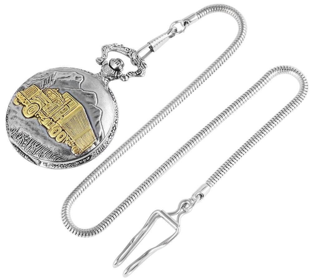 Het analoge 3-hands zakhorloge van het merk Excellanc heeft een hoogwaardig kwartsuurwerk. De ronde zilverkleurige metalen kast is aan de achterkant versierd met een bloemenpatroon. De matte voorkant is in het midden versierd met een goudkleurige vrachtwagen voor een bergketen. Het klassieke zakhorloge kan worden geopend met een drukknop die is geïntegreerd in de kroon. Aan het zakhorloge zit een 30 cm lange zakhorlogeketting in slangenpatroon waarmee het stevig aan een tas of kledingstuk kan worden bevestigd. De wijzerplaat is wit en heeft grote zwarte Arabische cijfers. Deze benadrukken het klassieke uiterlijk van het zakhorloge en maken het bijzonder gemakkelijk om de tijd af te lezen. Het horloge is ook voorzien van een licht gewelfd plastic kristal. Het horloge heeft een diameter van 47 mm en een kasthoogte van 16 mm.