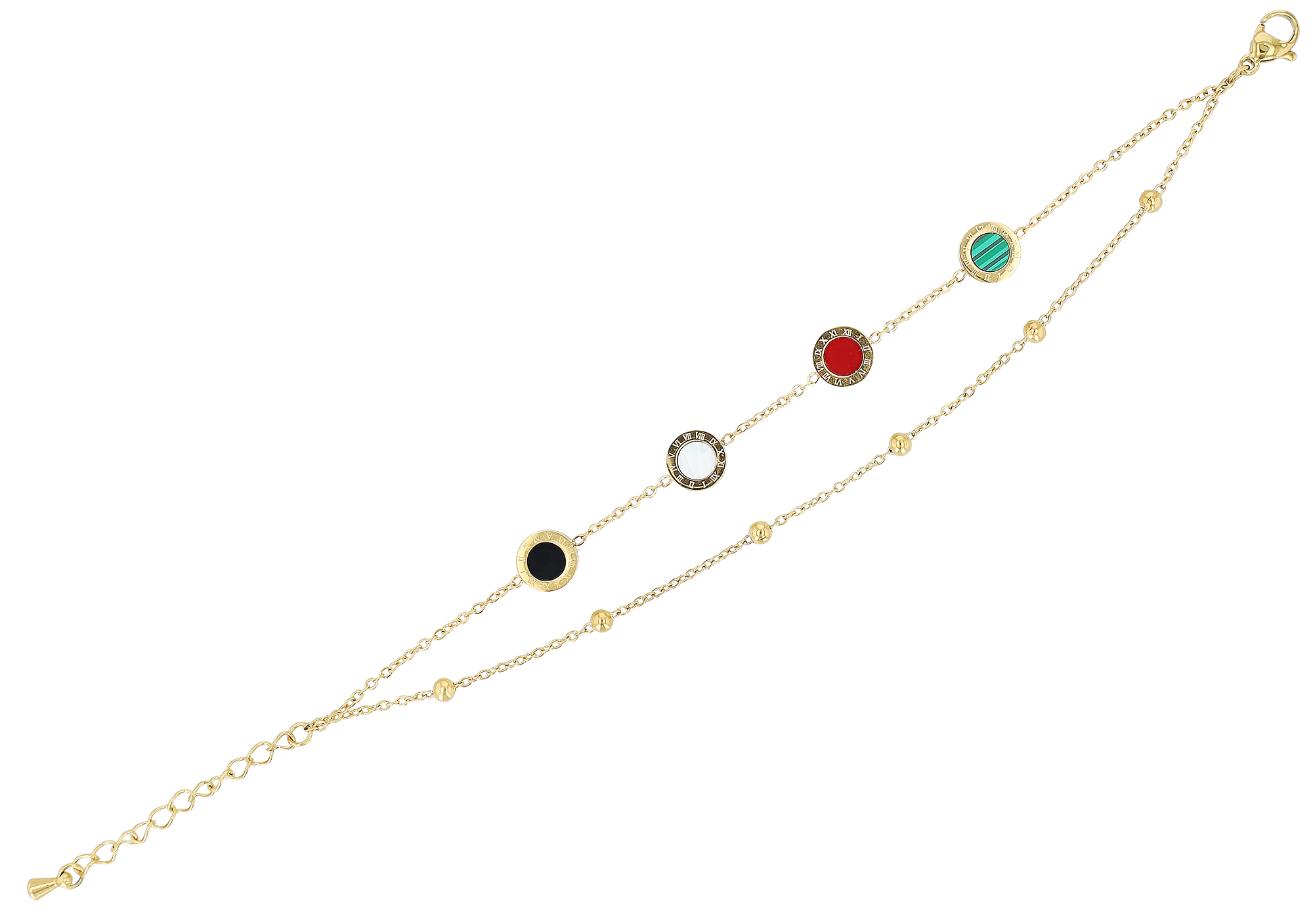 De sieradenarmband van het merk Akzent is gemaakt van twee fijne ankerkettingen. Vier gekleurde, ronde elementen zijn bevestigd aan de ene ankerketting, terwijl zes kleine kralen gelijkmatig verdeeld zijn over de tweede ankerketting. De modieuze armband kan worden geopend en gesloten met een karabijnsluiting, die ook van roestvrij staal is gemaakt. Bovendien is aan één uiteinde van de armband een verlengkettinkje van 3 cm bevestigd, zodat de lengte met 3 cm kan worden aangepast aan elke pols. De afmetingen zijn 16 cm lang, 8 mm breed en 3 mm dik. Een prachtige armband die een geweldig cadeau is.