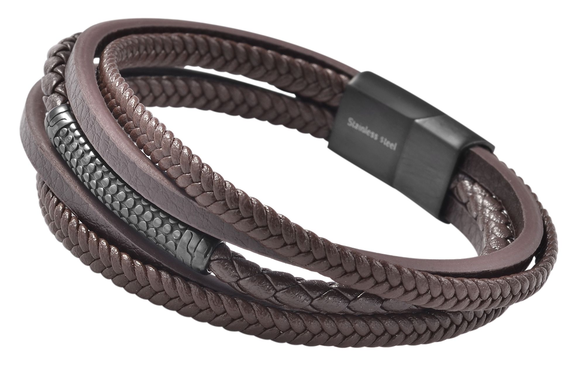 De donkerbruine armband van het merk Akzent is gemaakt van imitatieleer en is 23 cm lang. De vijfrijige sieradenarmband bestaat uit twee gevlochten bandjes van imitatieleer, een gevlochten koordje en twee dunne bandjes. Een zwart roestvrijstalen element in het midden maakt het ontwerp vakkundig af. Hij kan gemakkelijk worden geopend en gesloten met een praktische en stevige magneetsluiting, die ook ideaal is voor kleine gravures. De mat afgewerkte sluiting is gemaakt van roestvrij staal en afgewerkt met een hoogwaardige ion-plating. De combinatie van verschillende materialen geeft deze armband een bijzondere uitstraling en hij staat mooi om zowel mannelijke als vrouwelijke polsen. Dit product is het perfecte accessoire om je geliefden een origineel sieraad te geven of om jezelf te verwennen.