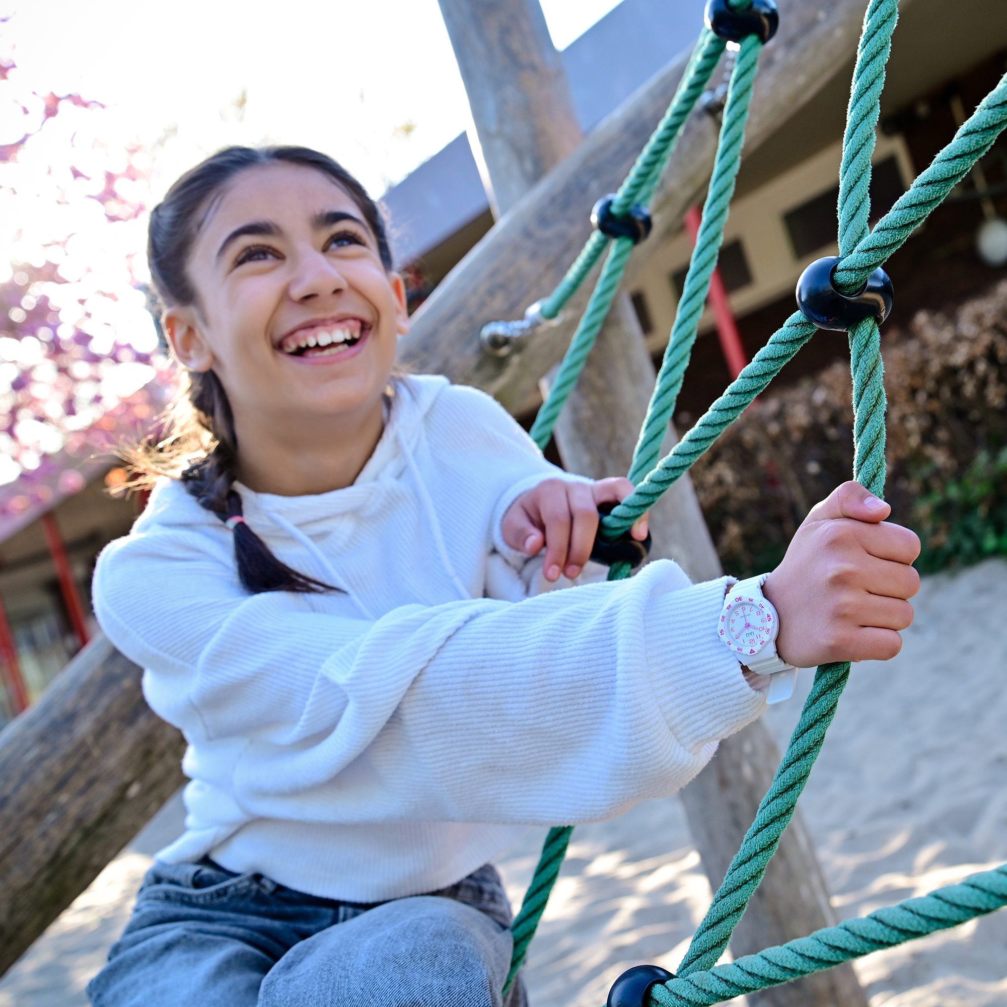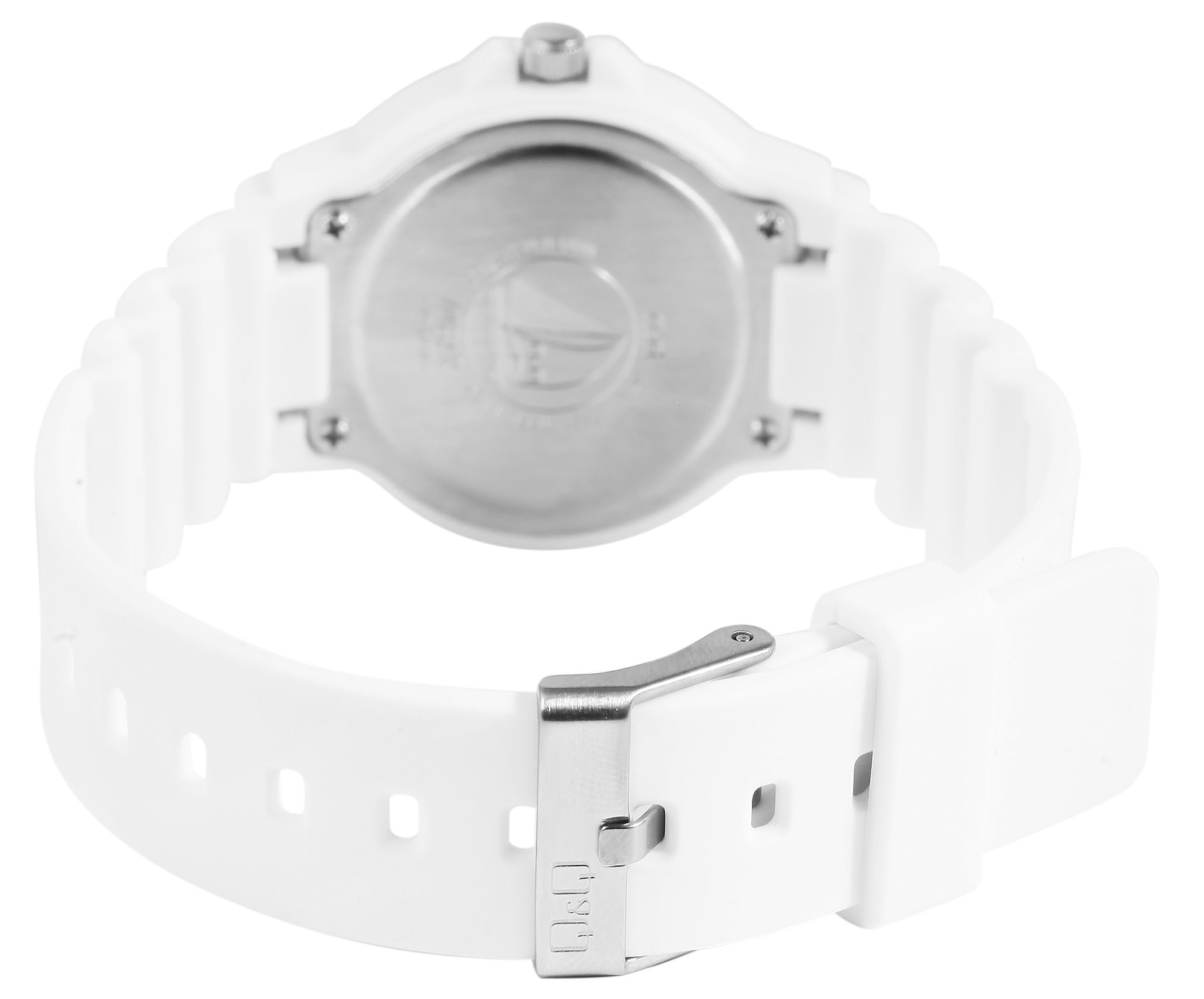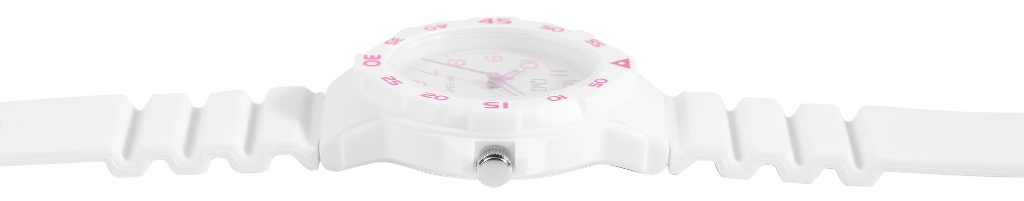 De comfortabele witte siliconen band is 18 mm breed en heeft een totale lengte van 24 cm. Het kan veilig worden vastgemaakt met een witte gesp. De lichtgewicht, witte kunststof kast heeft een diameter van 33 mm en wordt omlijst door een vaste, sportieve lunette met roze gekleurde cijfers.