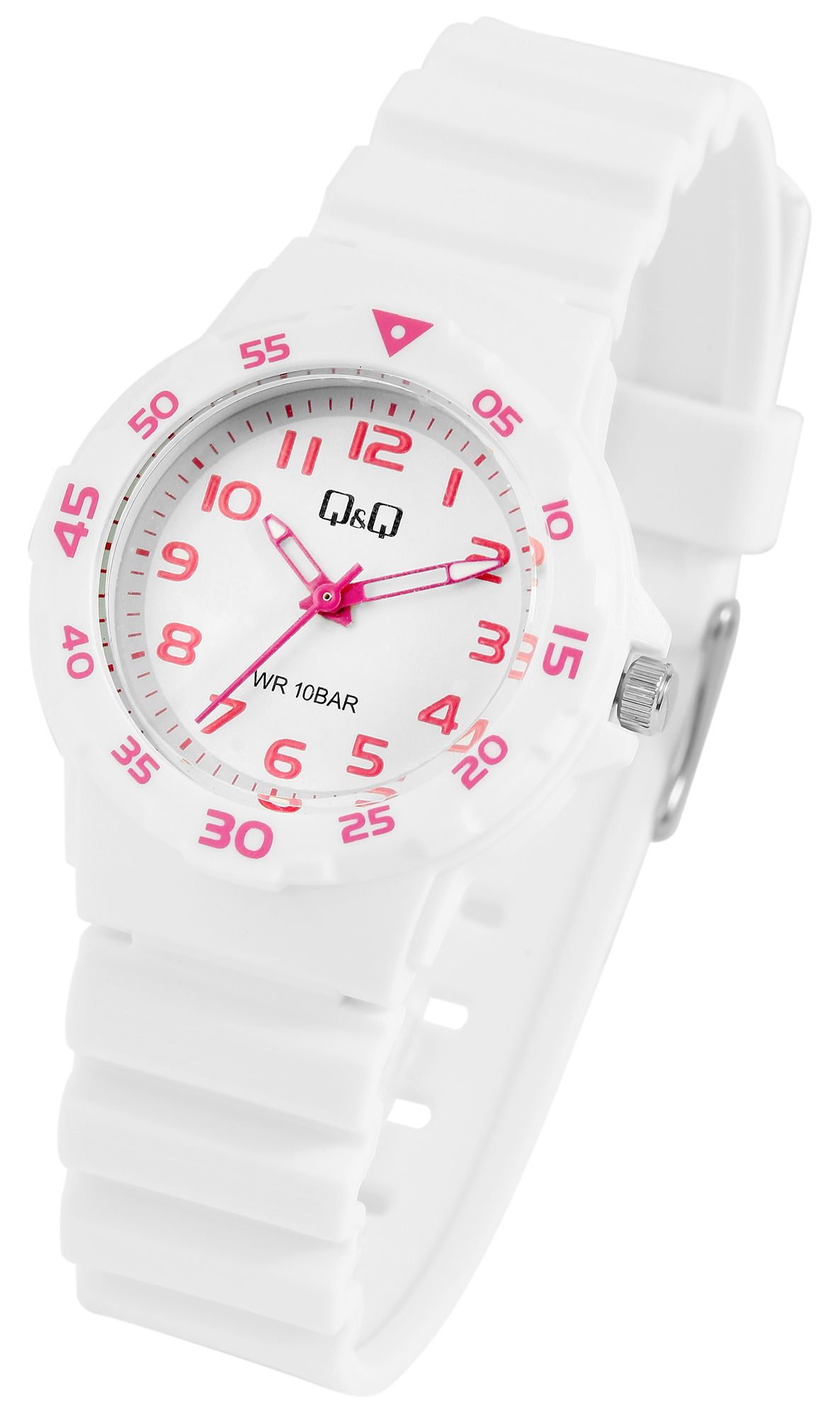 Dit vrolijke Q&Q - by Citizen Watch Co. LTD horloge in helder wit met opvallende roze details is de perfecte metgezel voor actieve vrouwen en jonge meisjes die op zoek zijn naar een sportief en modieus horloge.