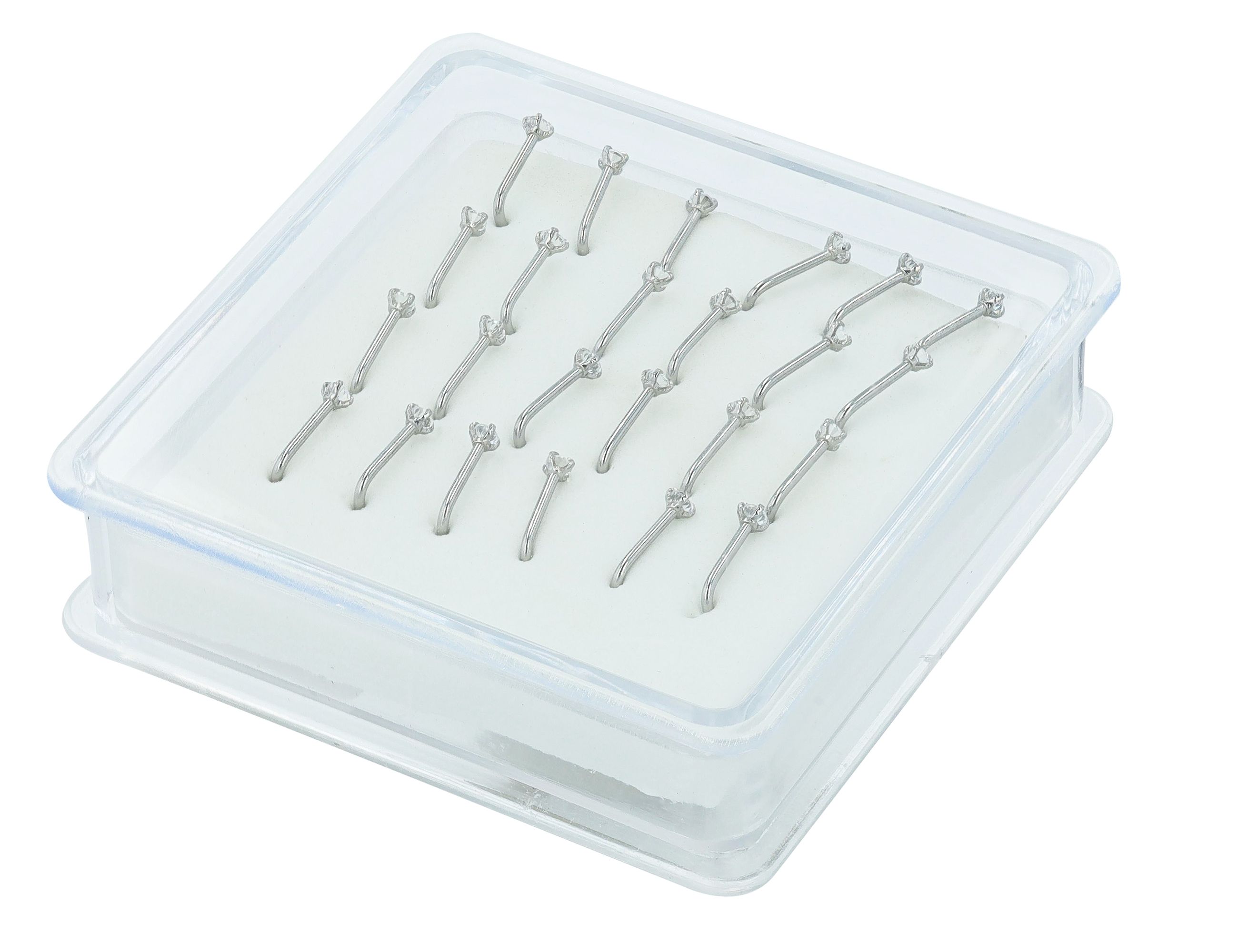 Onze neuspiercings zijn gemaakt van hoogwaardig roestvrij staal, een materiaal van de hoogste kwaliteit en duurzaamheid. Door het gebruik van dit materiaal zijn deze neuspiercings niet alleen robuust, maar ook hypoallergeen. Mensen met een gevoelige huid kunnen er zeker van zijn dat deze piercings geen allergische reacties zullen veroorzaken. Elke set bevat 24 piercings met een staafdikte van 0,8 mm en een staaflengte van 7 mm. De elegante zirkonia aan de uiteinden zijn verkrijgbaar in twee maten: Ø 2 mm of Ø 2,5 mm.