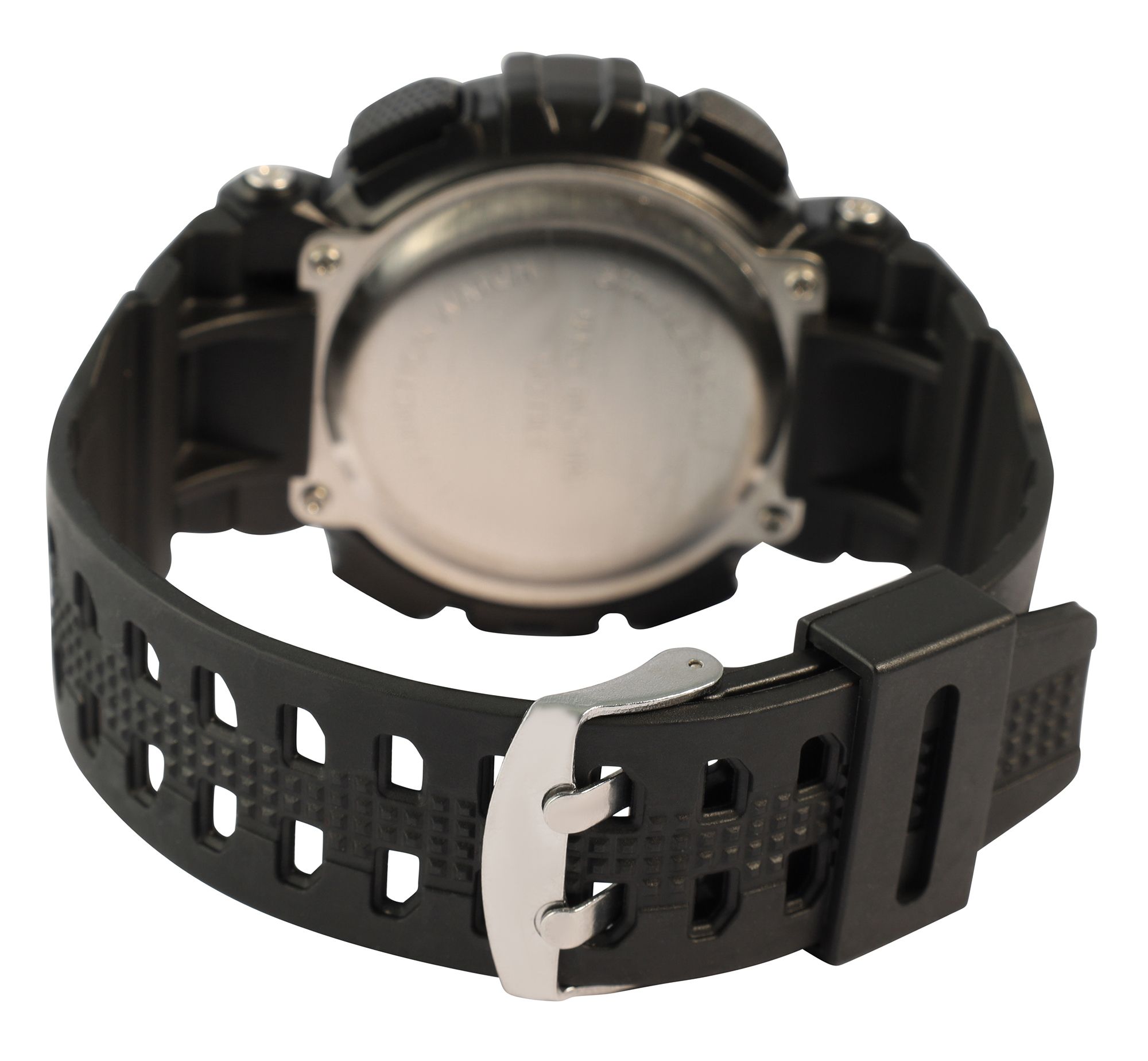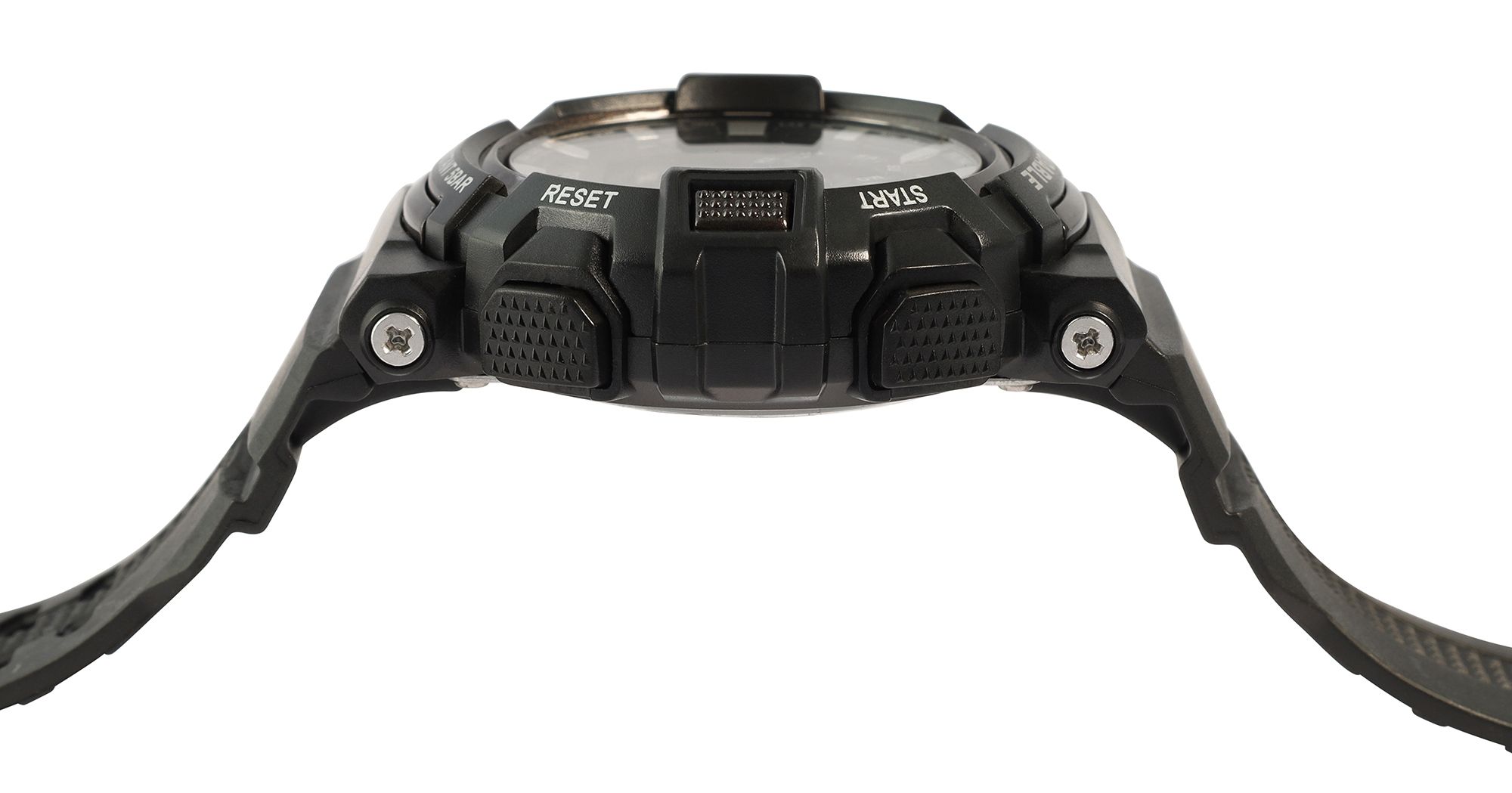 De TPU band combineert de flexibiliteit van siliconen met de duurzaamheid van kunststof. Het heeft een breedte van 28 mm bij de lug en wordt stevig vastgemaakt met een gesp. De totale lengte van het horloge is 26 cm, terwijl de kast een diameter van 46 mm en een hoogte van 18 mm heeft. De kast is gemaakt van kunststof, terwijl de achterkant van roestvrij staal is, waardoor het horloge huidvriendelijker en duurzamer is.