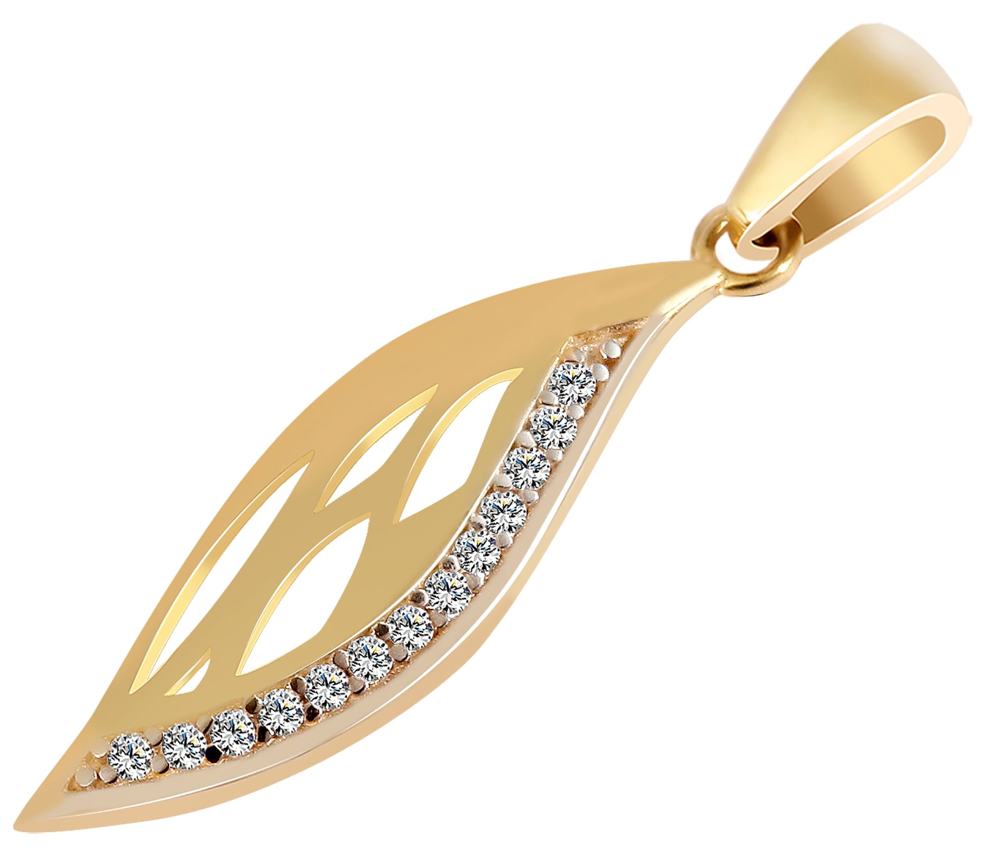 De bladvormige hanger is verkrijgbaar in 333 (8 karaat) en 375 (9 karaat) goud. De hanger is geelgoud en is ook versierd met 12 fonkelende zirkonia steentjes. De witte zetting zorgt voor een aantrekkelijk contrast. Het oppervlak is gepolijst en geeft extra glans. Dankzij het ovale oogje kan de hanger aan veel verschillende kettingen worden bevestigd. Let op: er wordt geen halsketting meegeleverd. De juwelenhanger is tijdloos en kan voor elke gelegenheid gedragen worden. De hanger is ook ideaal als cadeau. Bijvoorbeeld voor een communie, vormsel, verjaardag, huwelijksjubileum, Moederdag of Kerstmis. De afmetingen komen voort uit een lengte van 22 mm, een breedte van 7 mm en een materiaaldikte van 2 mm. Dit product wordt geleverd op een witte juwelenkaart. De afmetingen zijn 45 x 35 mm en ideaal om te presenteren in een passende display of om cadeau te geven.