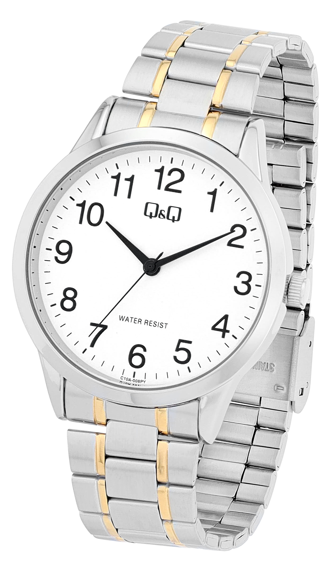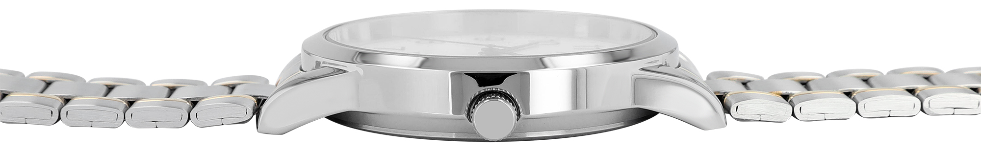 Met een analoog uurwerk met 3 wijzers van de hoogste kwaliteit biedt dit polshorloge een nauwkeurige en betrouwbare tijdweergave. De wijzerplaat is wit en de wijzers en cijfers zijn zwart. Hierdoor is de tijd snel en gemakkelijk af te lezen. Het horloge heeft ook een waterbestendigheid van 3 bar. De tweekleurige schakelarmband van hoogwaardig roestvrij staal is niet alleen extreem robuust, maar ook verstelbaar. Dankzij afneembare elementen kan de lengte van de armband worden aangepast, zodat hij perfect om elke pols past. De metalen kast met mineraalglas beschermt het nauwkeurige uurwerk binnenin en garandeert duurzaamheid. Met een kastdiameter van 41 mm, een kasthoogte van 10 mm en een bandbreedte van 20 mm biedt dit horloge een evenwichtig, mannelijk ontwerp. De totale lengte van 23,5 cm zorgt ervoor dat het comfortabel om bijna elke pols past.