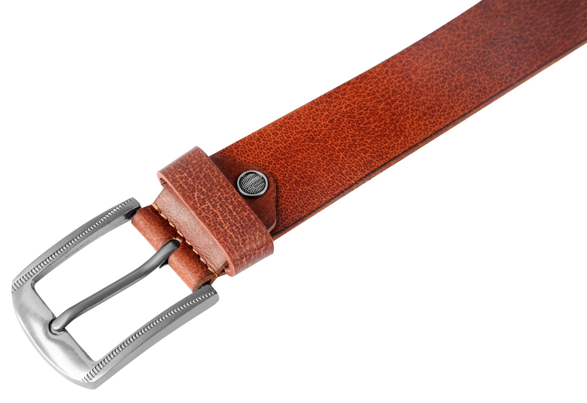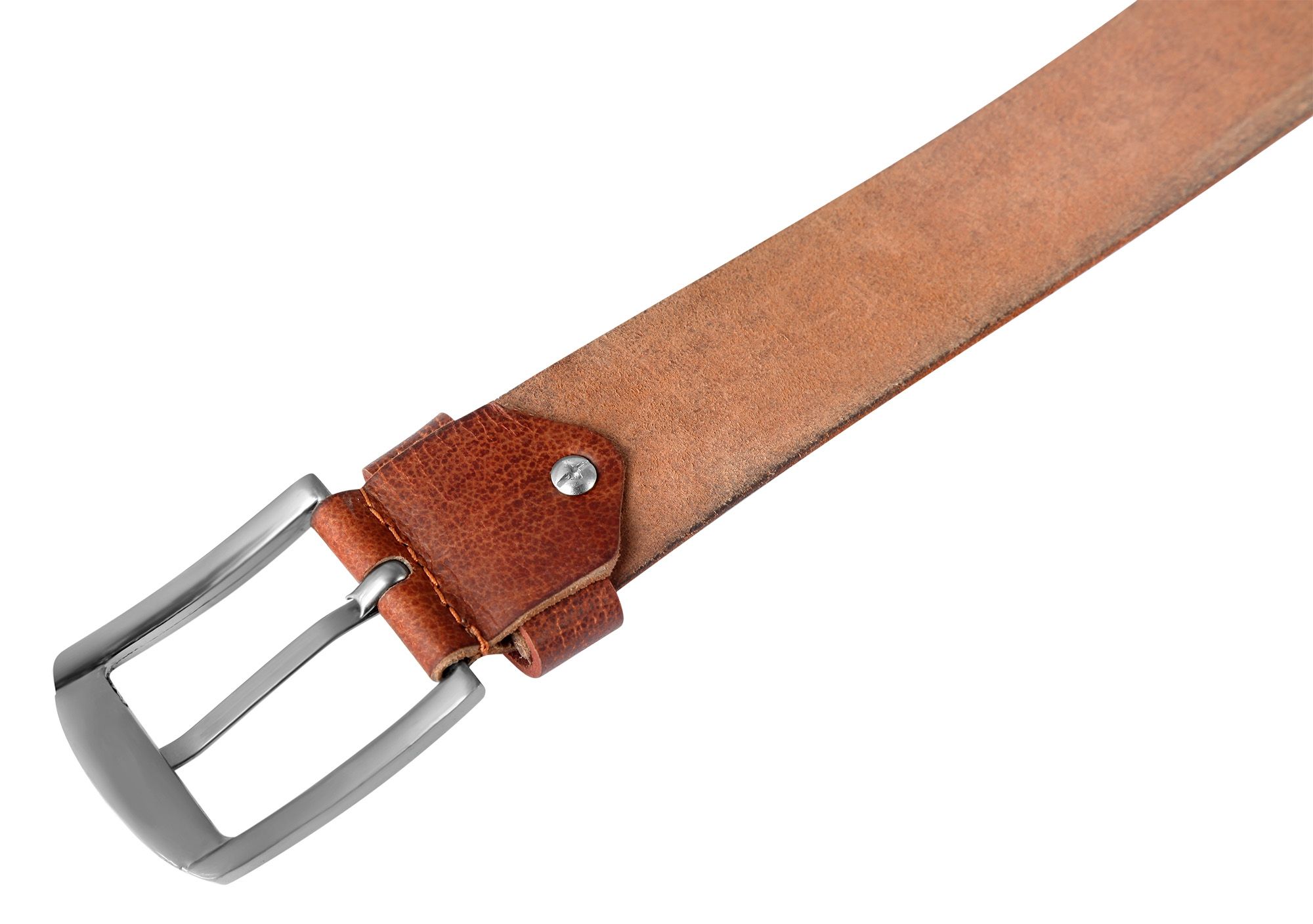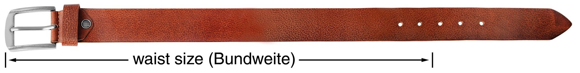 Deze bruine riem van het merk Leonardo Verrelli is gemaakt van generfd rundleer en heeft een gladde afwerking met een uitgesproken nerf. Hij heeft een taillebandbreedte van 110 cm, is 3,8 cm breed en 0,3 cm dik. De gaten zitten 2,5 cm uit elkaar. Dit maakt de leren riem veelzijdig, omdat hij gemakkelijk door de conventionele riemlussen kan worden getrokken. Dankzij het hoogwaardige, natuurlijke materiaal is deze riem bijzonder robuust, duurzaam en scheurbestendig, waardoor het de ideale metgezel is voor alle gelegenheden. De metalen gesp wordt bevestigd met een schroef, waardoor de riem gemakkelijk kan worden ingekort en aangepast aan elke tailleomvang. De maat van de riem wordt aangegeven in taillebreedte, die 15 cm korter is dan de totale lengte.