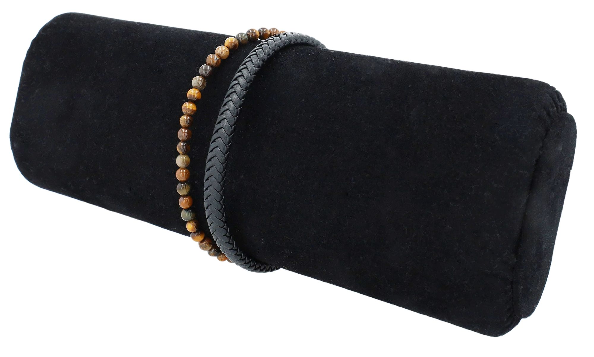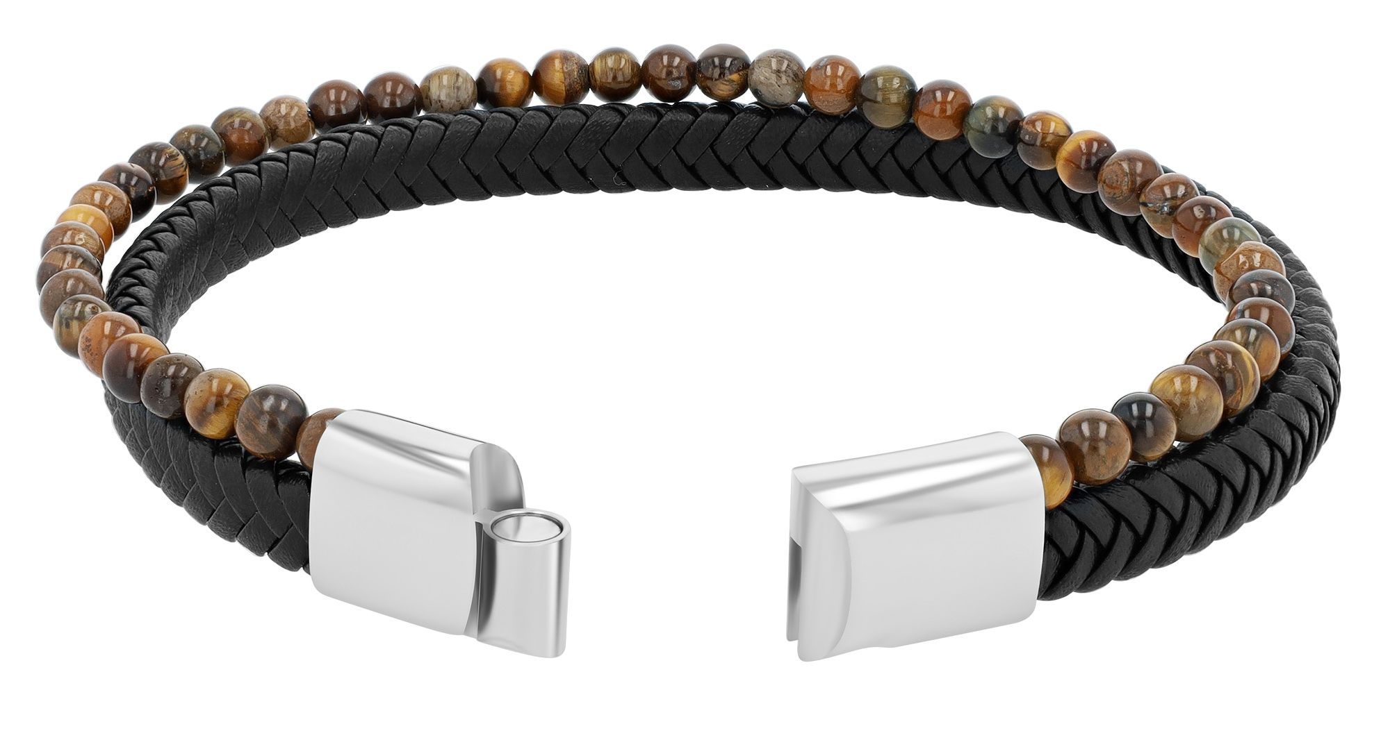 De armband met gevlochten echt lederen armband in zwart met bruin tijgeroog van het merk Akzent is een bijzonder modieus accessoire. Naast de leren band zitten 44 kralen op een rij. De kralen zijn een natuurproduct. Dit betekent dat elke kraal uniek is met verschillende kleureffecten. De praktische magneetsluiting maakt het openen en sluiten gemakkelijk. Bij de armband wordt een 1,5 cm lang verlengstuk geleverd. Dit kan eenvoudig aan de magnetische sluiting worden bevestigd. Zo kan de lengte naar wens worden aangepast. De kralen en de leren armband hebben een materiaaldikte van 4 mm.