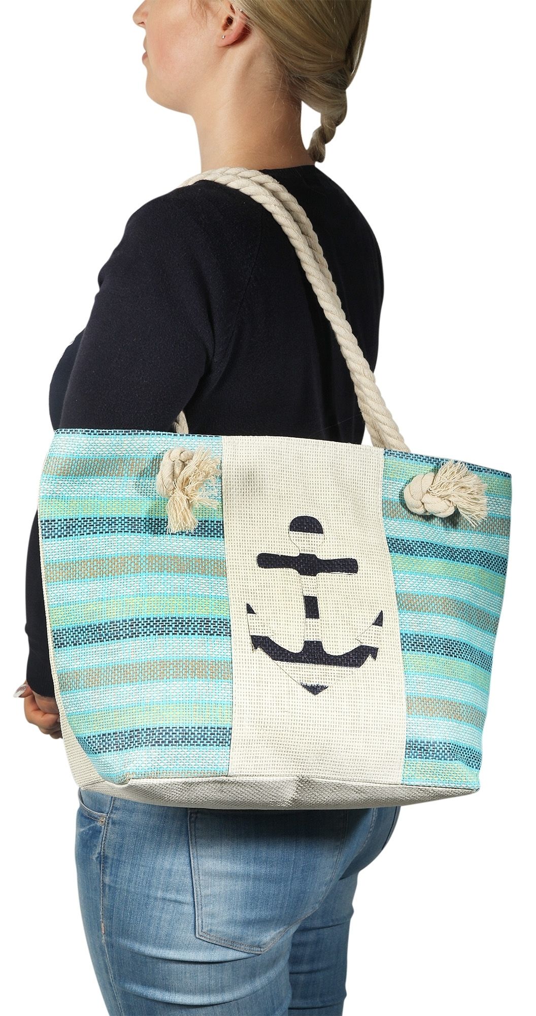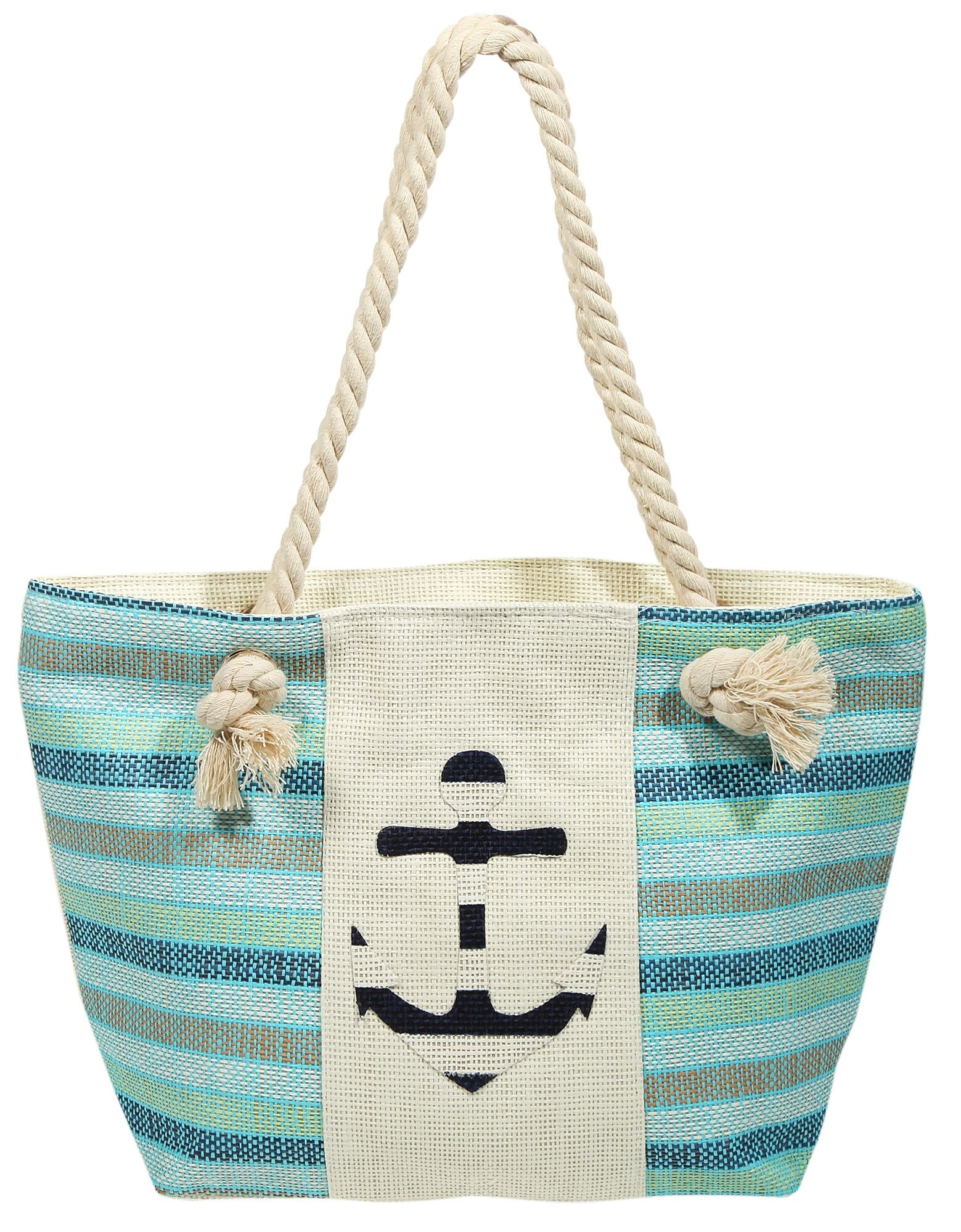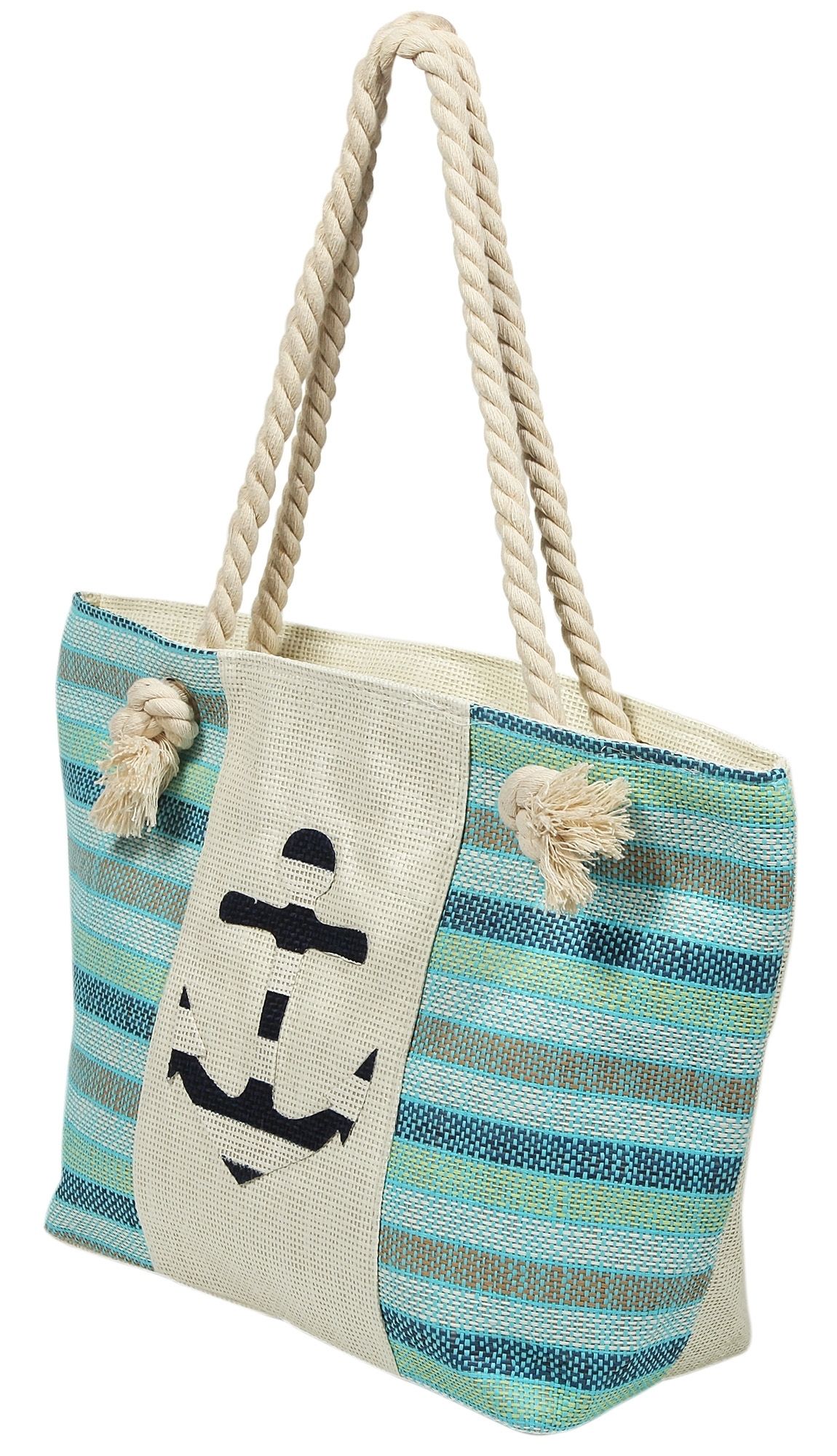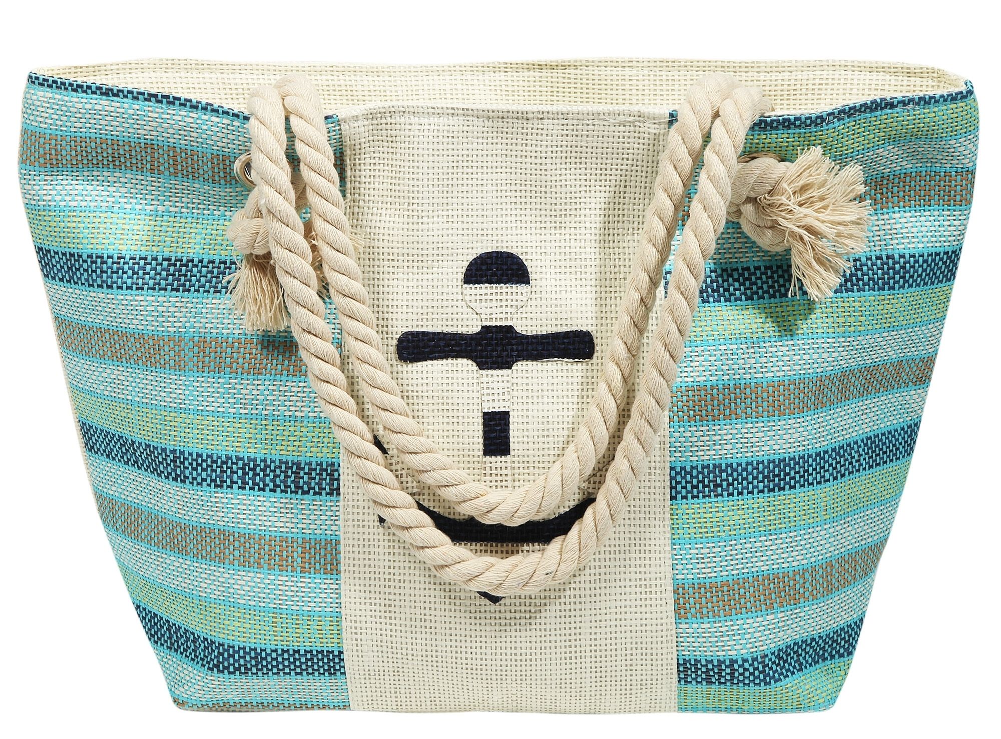 De maritieme strandtas met trekkoordhengsels is gemaakt van raffia en is versierd met een ankermotief en prachtige kleurencombinaties. De zomertas biedt ruime opbergruimte en heeft een groot binnenvak waarin alle belangrijke spullen kunnen worden opgeborgen en vastgezet met een rits. Er zit ook een vakje voor je mobiele telefoon in. Het is de perfecte metgezel voor een dagje strand, maar ook voor andere vrijetijdsactiviteiten. De afmetingen van de tas zijn 30 cm lang, 44 cm breed en 1,0 cm dik als hij niet gevuld is.