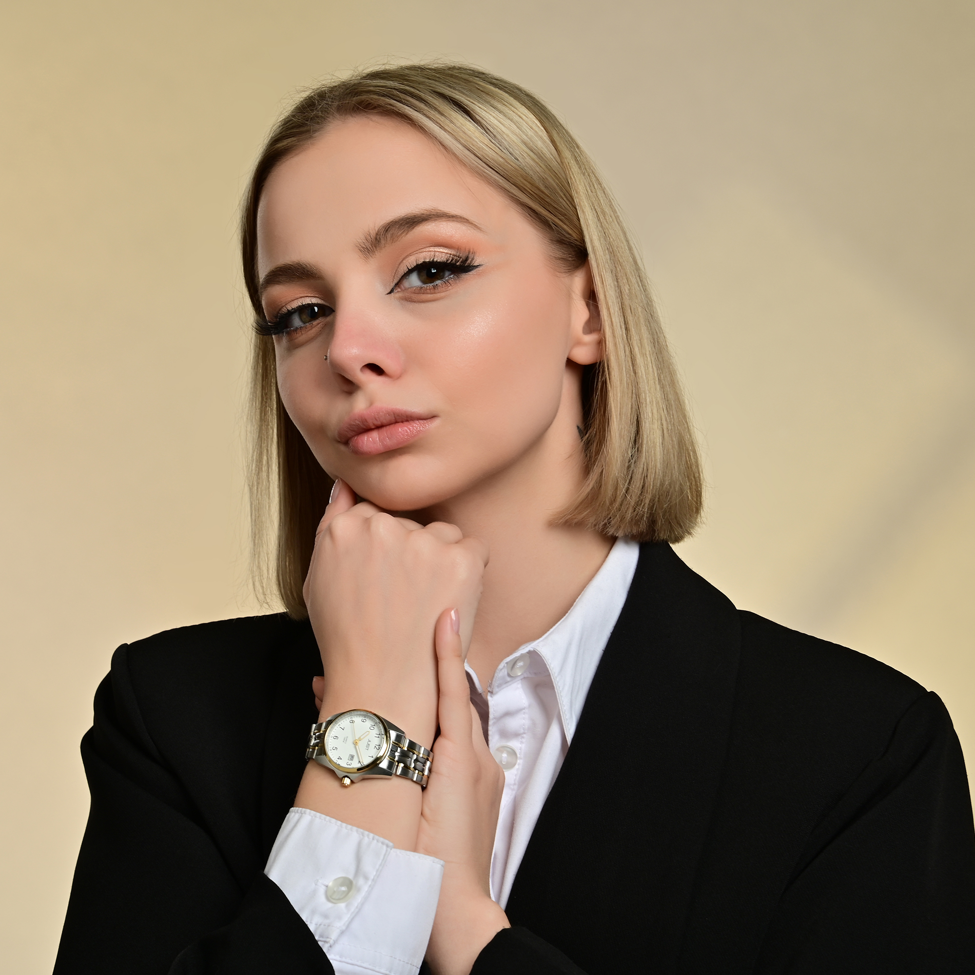 Productinformatie "Just "Esrah" Edelstahl Damenarmbanduhr, 3-Zeiger, Datumsanzeige, bicolor, weißes ZB"