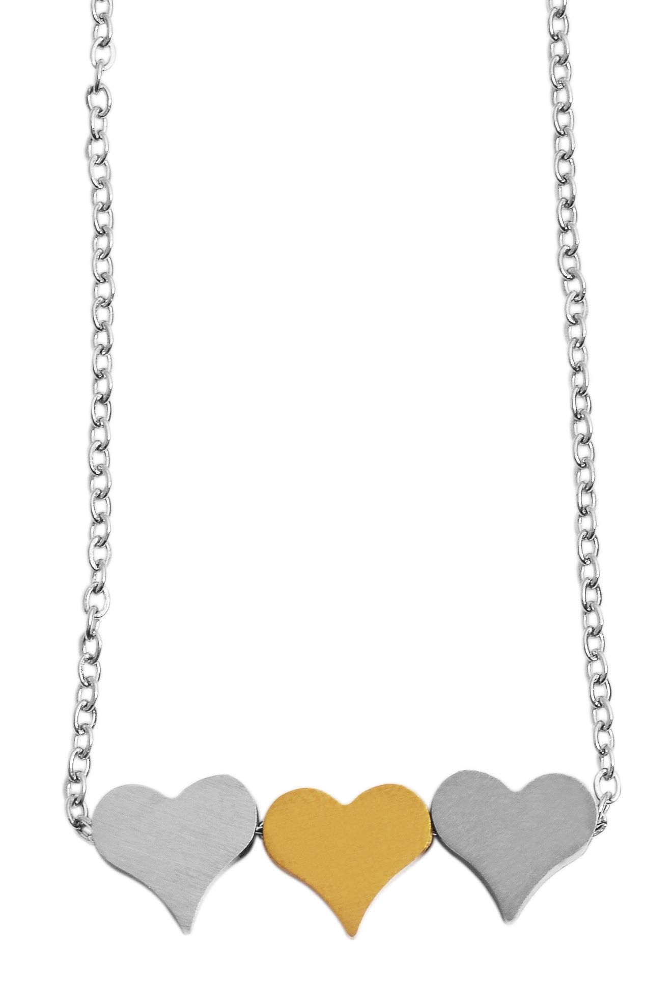 De Akzent sieradenset is gemaakt van roestvrij staal en bestaat uit oorstekers en een ketting. De ankerketting is 43 cm lang, 1 mm breed en 1 mm dik. Aan het uiteinde van de ketting is ook een verlengkettinkje van 5 cm bevestigd, zodat je de lengte met maximaal 5 cm kunt variëren en de ketting aan elke outfit kunt aanpassen. De ketting kan worden geopend en gesloten met een stevige roestvrijstalen karabijnhaak. De hanger van de ankerketting bestaat uit 3 roestvrijstalen elementen in de vorm van een hart. Twee harten zijn zilverkleurig, één is IPG-gecoat. Deze zijn mat geborsteld en hebben elk een lengte van 8 mm, een breedte van 9 mm en een dikte van 3 mm. Alle 3 de hartjes samen hebben dus een totale lengte van 8 mm, een breedte van 27 mm en een dikte van 3 mm. De bijpassende oorstekers, die ook de vorm van een hart hebben en mat geborsteld zijn, hebben een lengte van 8 mm, een breedte van 9 mm en een dikte van 3 mm. De comfort oorknopjes, die geleverd worden met een siliconen plaatje, geven extra steun aan de oorbellen.