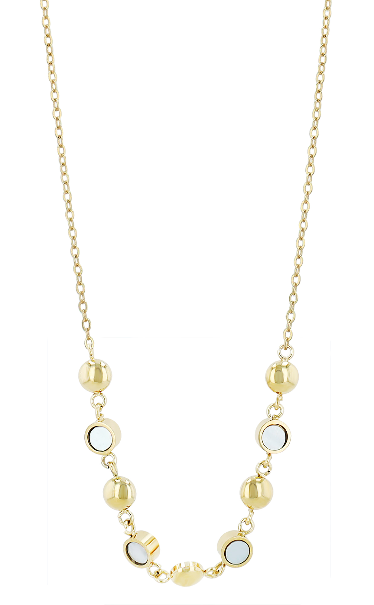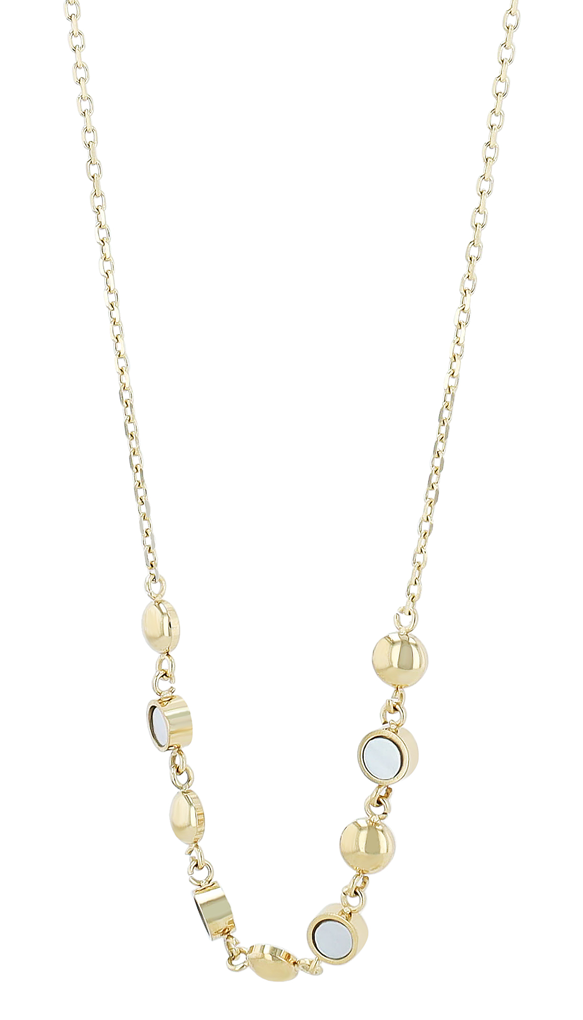 Dit stijlvolle roestvrijstalen collier combineert kostbaar parelmoer met hoogwaardige roestvrijstalen elementen over een lengte van 6 cm. De fijn bewerkte elementen (Ø 4 mm) geven het sieraad een subtiele maar expressieve uitstraling. Verkrijgbaar in twee versies, zilverkleurig met een kettinglengte van 41 cm en goudkleurig met een kettinglengte van 42 cm. De lengte kan worden aangepast dankzij de extra verlenging van 5 cm. De praktische karabijnsluiting zorgt voor een stevige grip. Deze ketting is de perfecte metgezel voor elegante en alledaagse looks.