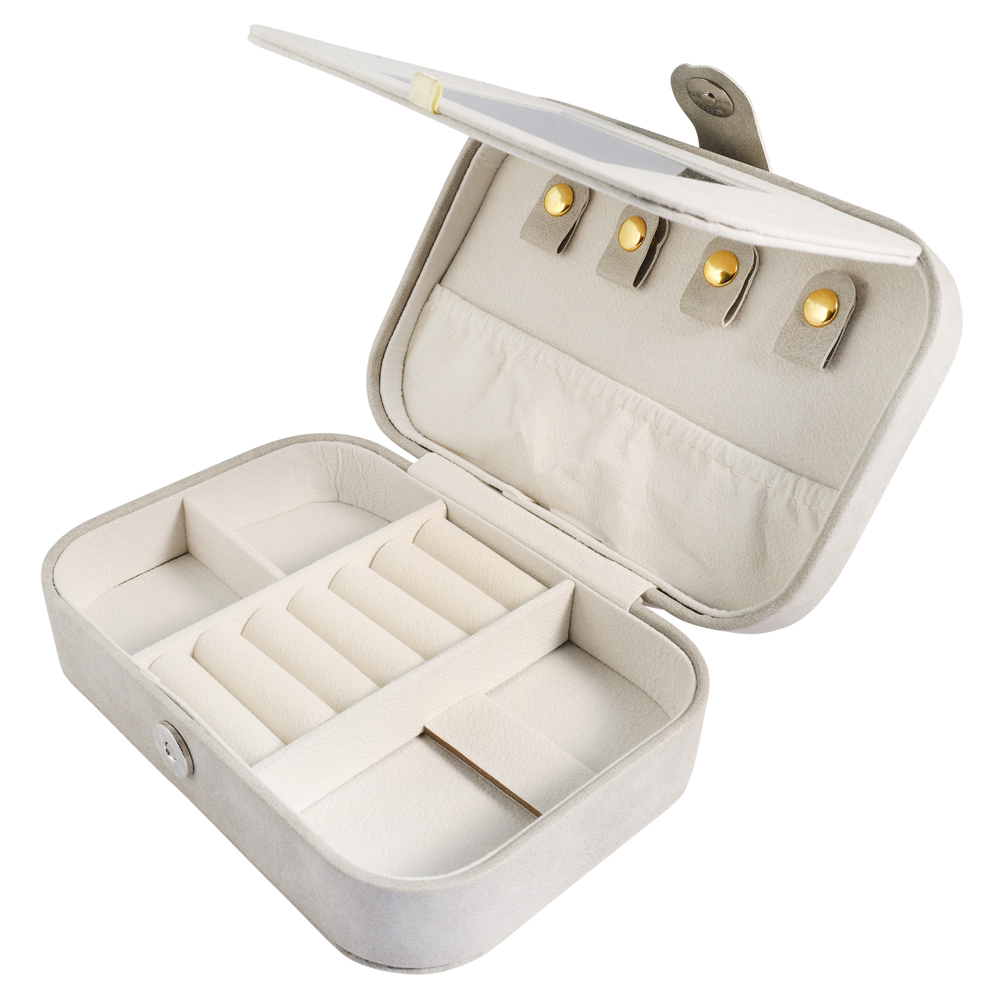Een praktische reisgezel voor je favoriete accessoires van hoogwaardig imitatieleer met een spiegeltje.